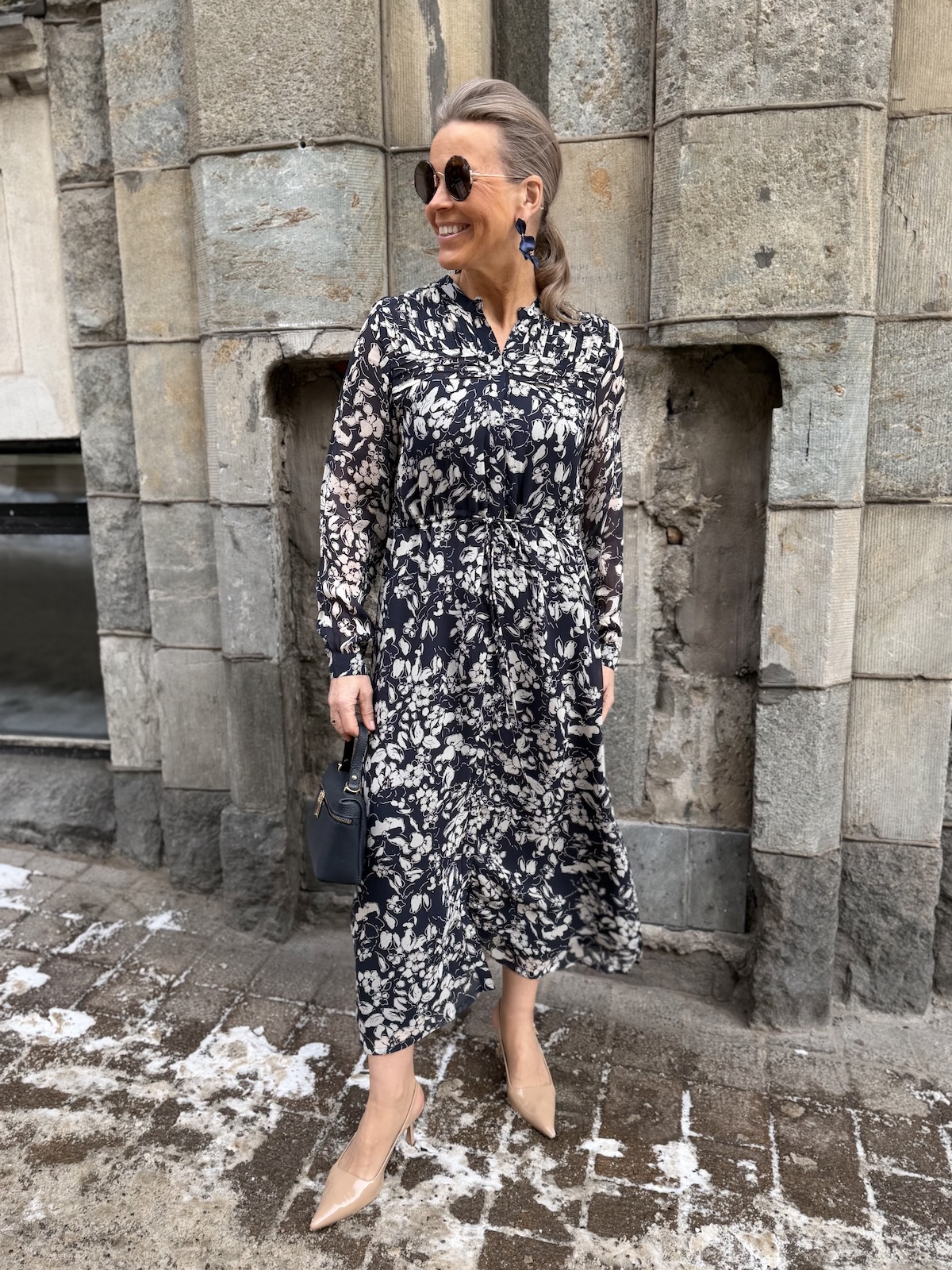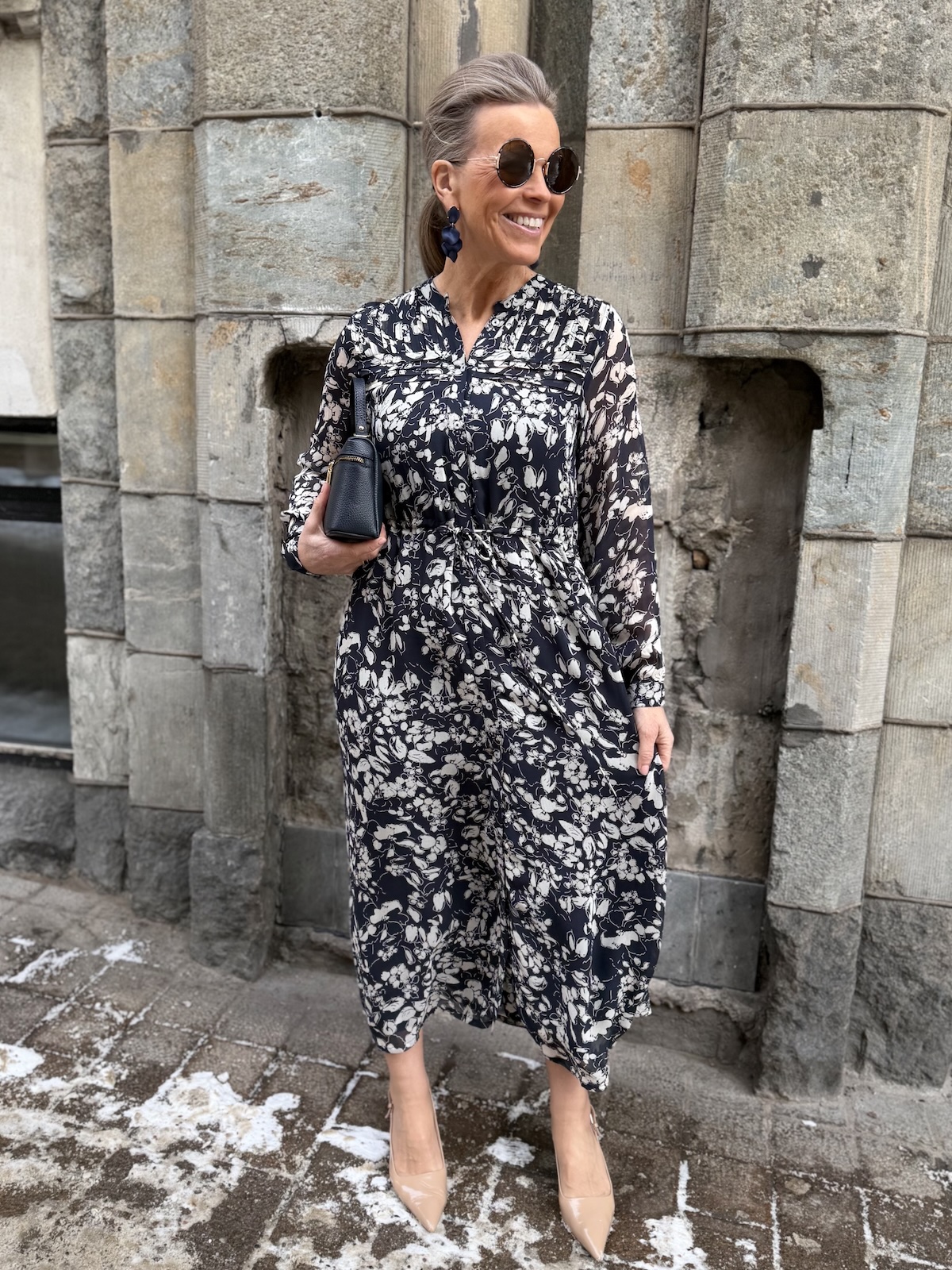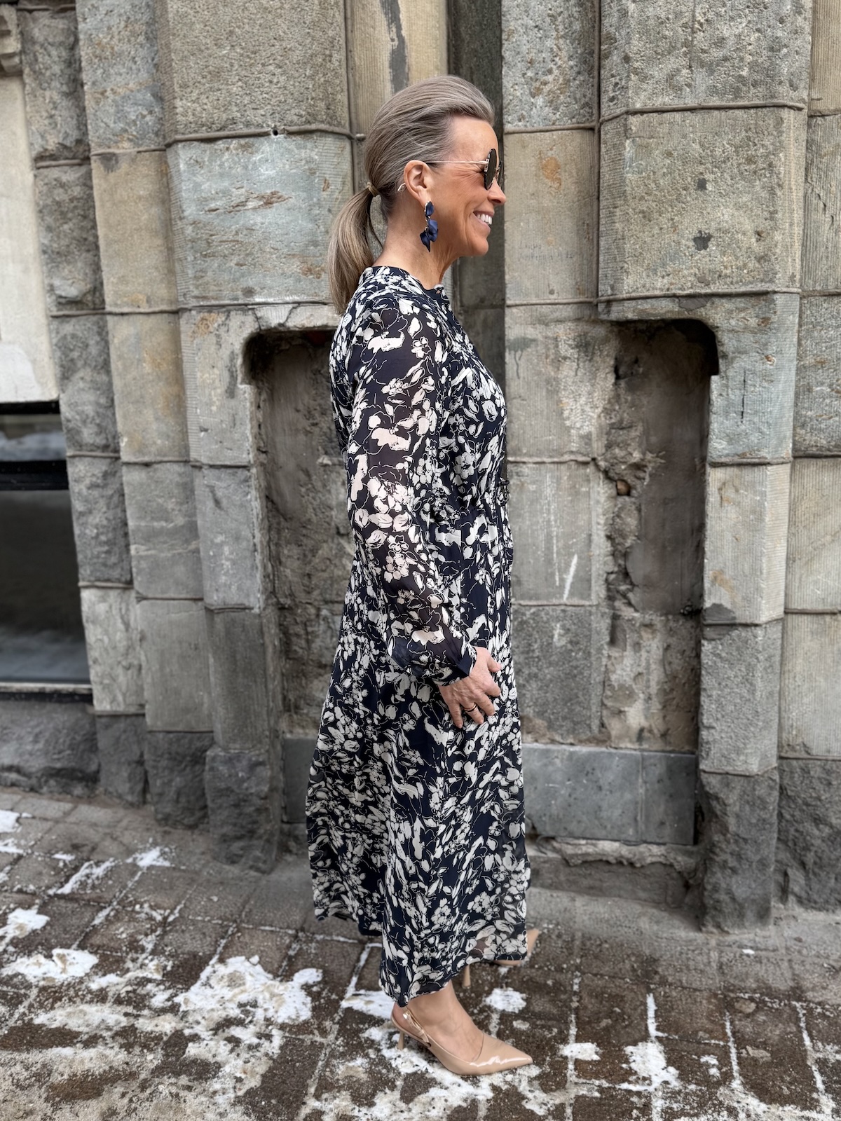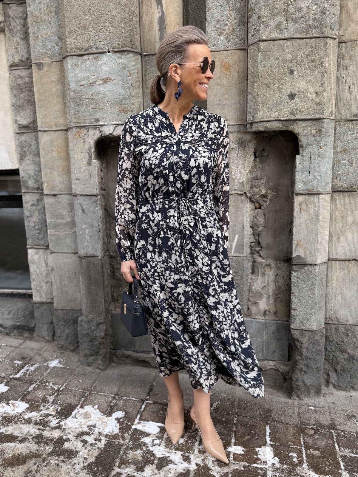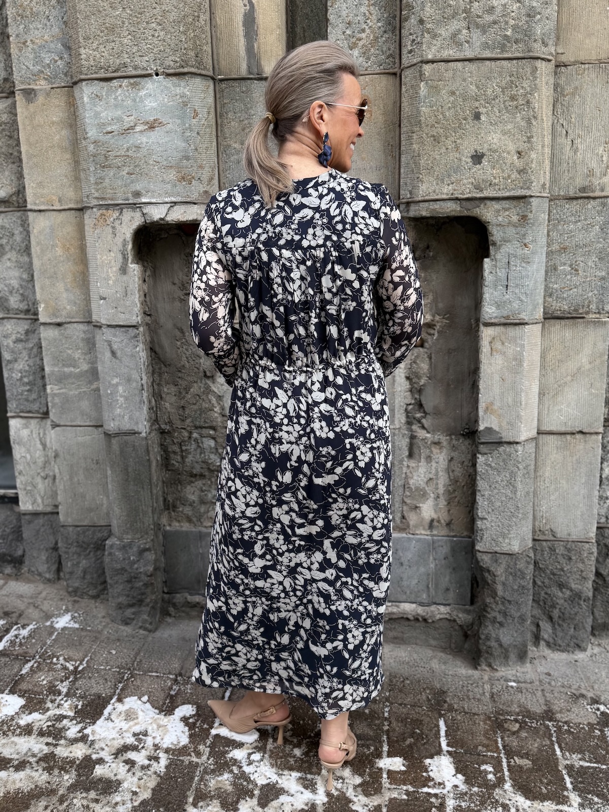 Altina on kaunis midimekko, joka taipuu stailauksella moneen menoon. Mekossa on O-kaula-aukko ja mekon edessä on avattavat napit ylhäältä alas asti. Hihat ovat täyspitkät ja hihansuissa on rannekkeet napeilla. Edessä on muutama hiuslaskos ja mekon vyötäröllä on nauhakuja. Mekko levenee kevyesti alaspäin ja loppuu lähelle nilkkoja. Mekon edessä ja takana on vuori ja hihat ovat vuorettomat. Katalla on mekosta päällä koko 34. Mekko on aavistuksen reilumpaa kokoa kuin normaalisti.