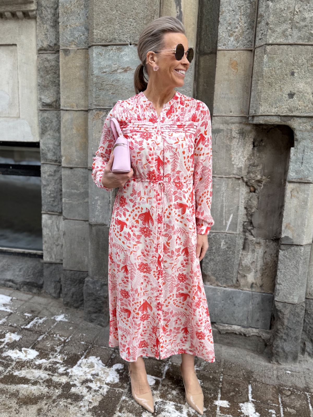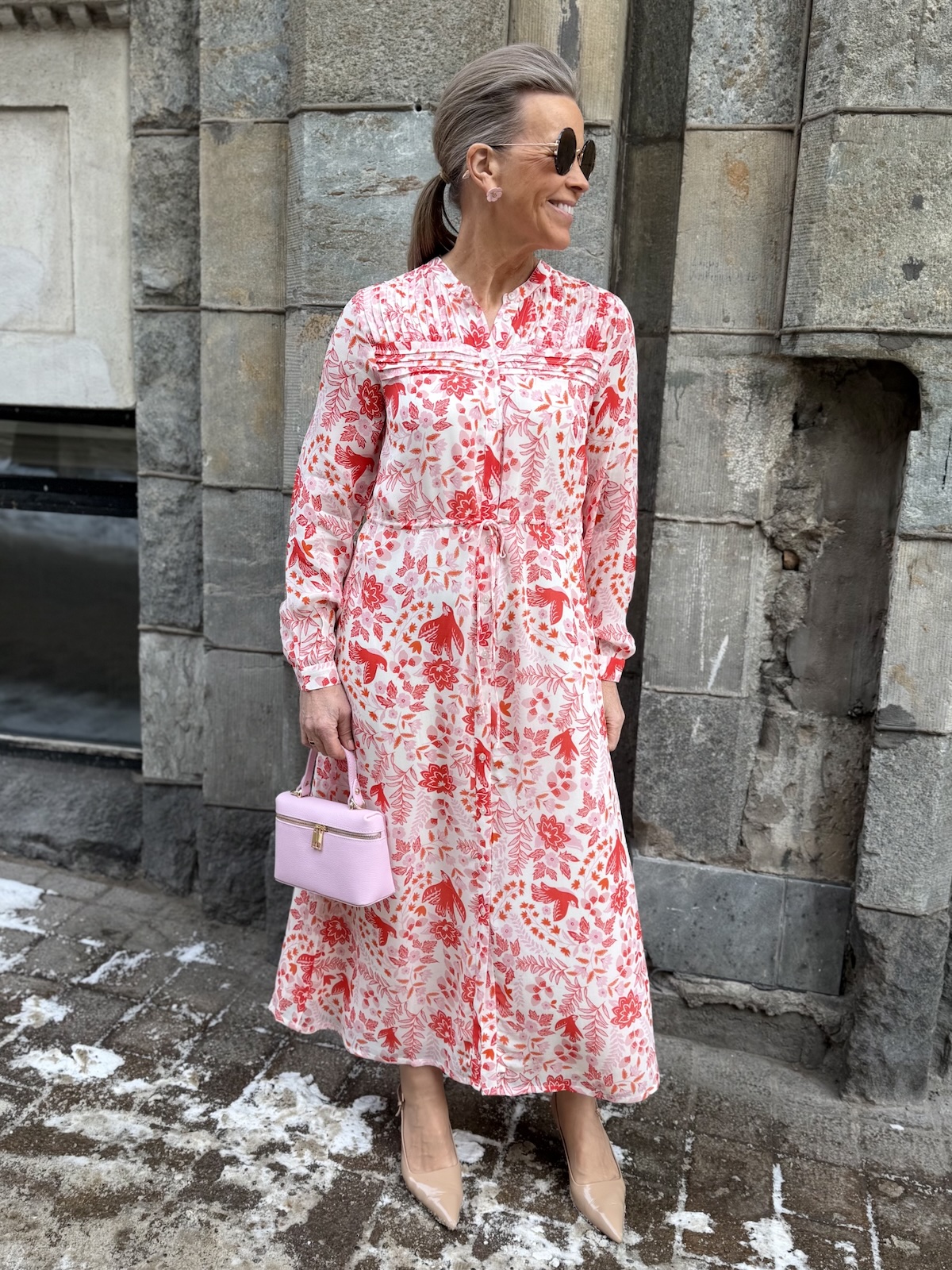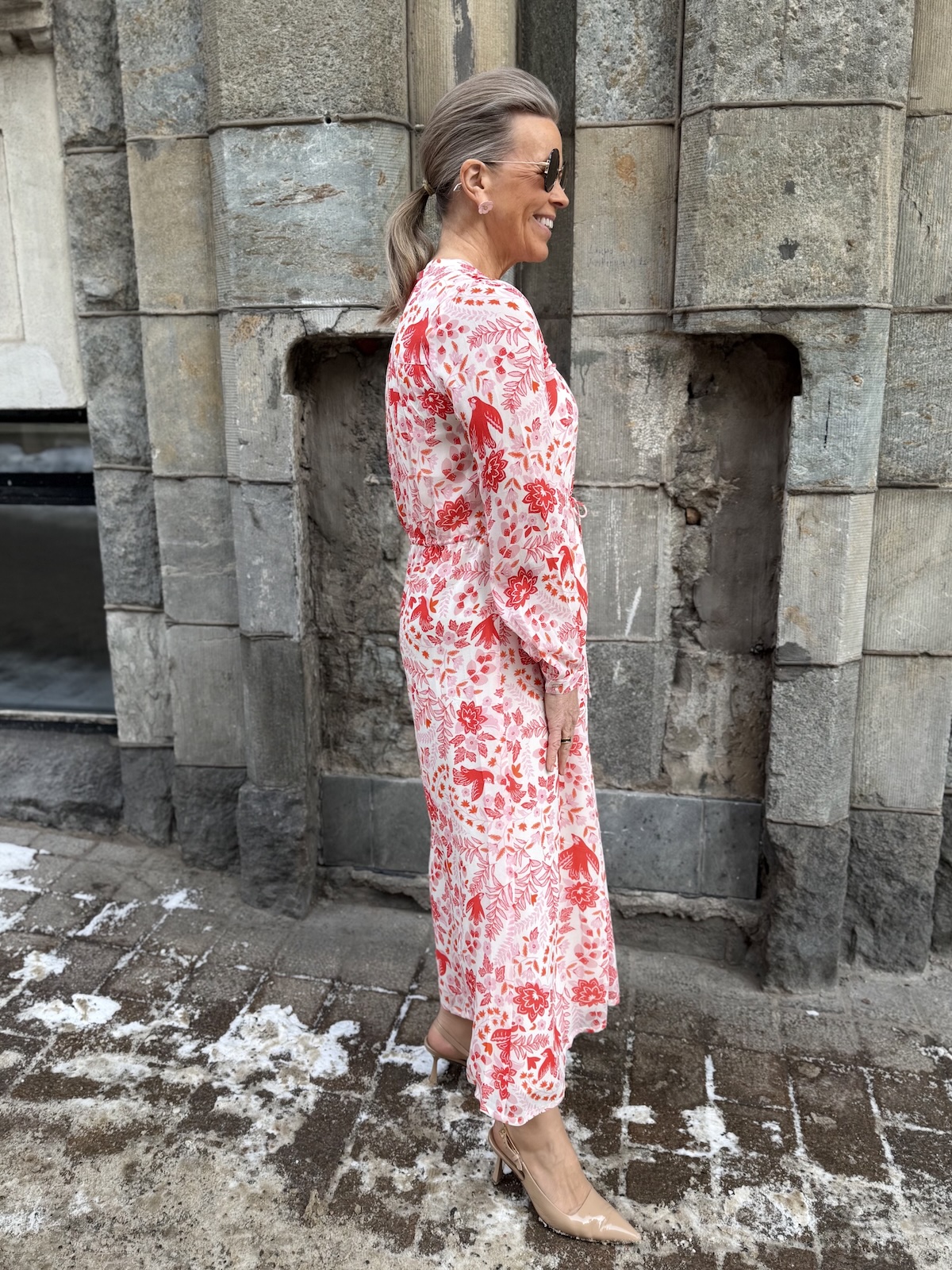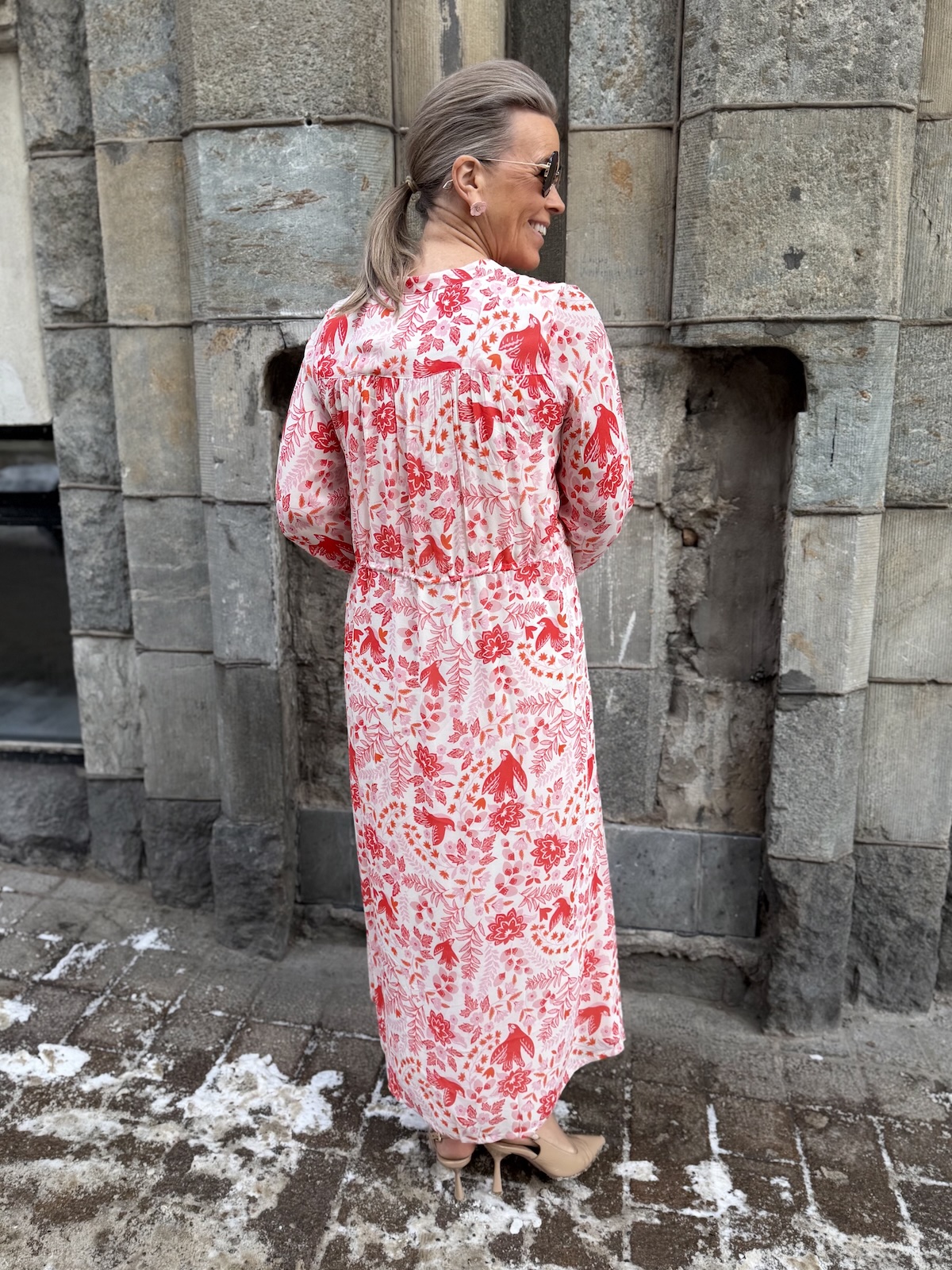 Altina on kaunis midimekko, joka taipuu stailauksella moneen menoon. Mekossa on O-kaula-aukko ja mekon edessä on avattavat napit ylhäältä alas asti. Hihat ovat täyspitkät ja hihansuissa on rannekkeet napeilla. Edessä on muutama hiuslaskos ja mekon vyötäröllä on nauhakuja. Mekko levenee kevyesti alaspäin ja loppuu lähelle nilkkoja. Mekon edessä ja takana on vuori ja hihat ovat vuorettomat. Katalla on mekosta päällä koko 34. Mekko on aavistuksen reilumpaa kokoa kuin normaalisti.