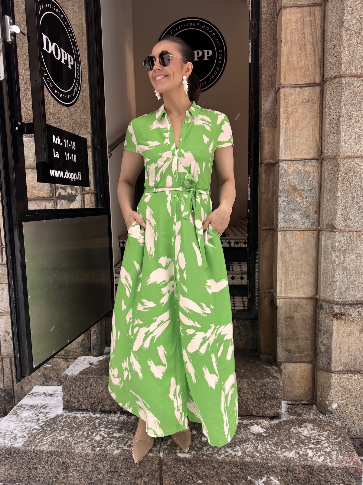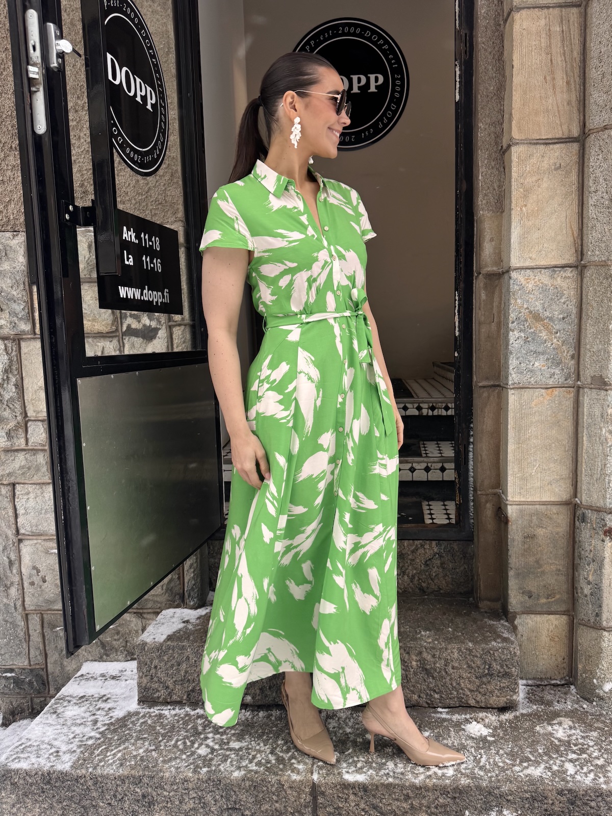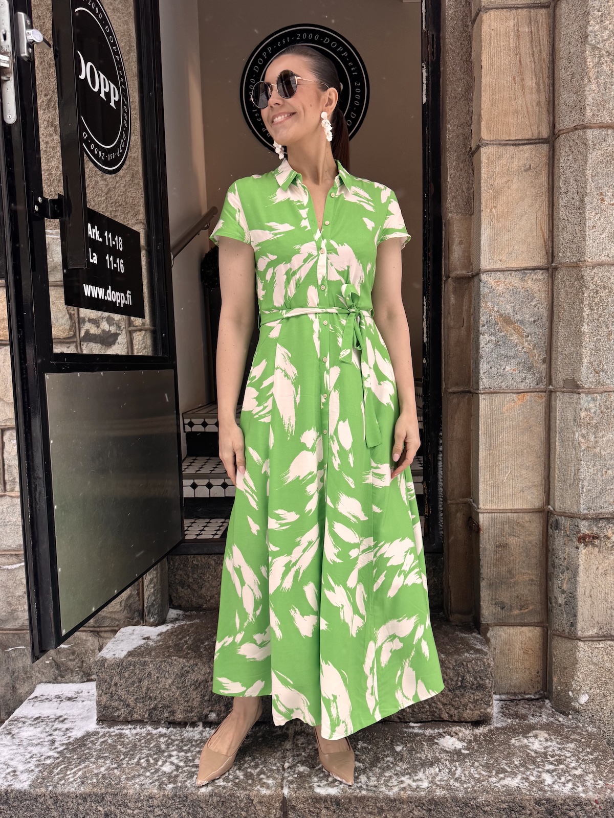 Arjana on kauniin mallinen midimekko! Mekossa on kaulukset ja edessä on napit. Hihat tipahtavat olkapäiden alapuolelle. Mekko on vartalonmyötäinen vyötärölle saakka, jonka jälkeen helmaosa levenee alaspäin ja loppuu lähelle nilkkoja. Mekossa on taskut ja mekkoon kuuluu vyö. Gabilla on mekosta päällä koko M. Mekko on yhden koon pienempää kokoa kuin normaalisti.