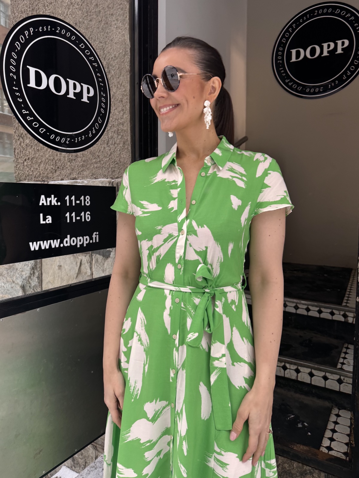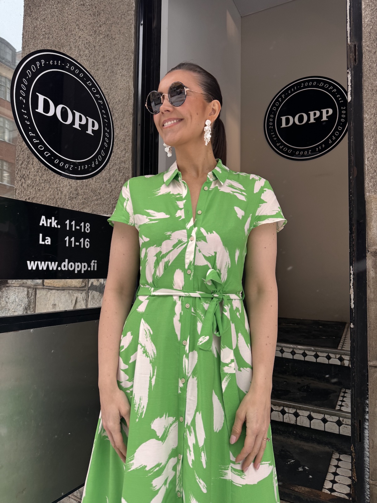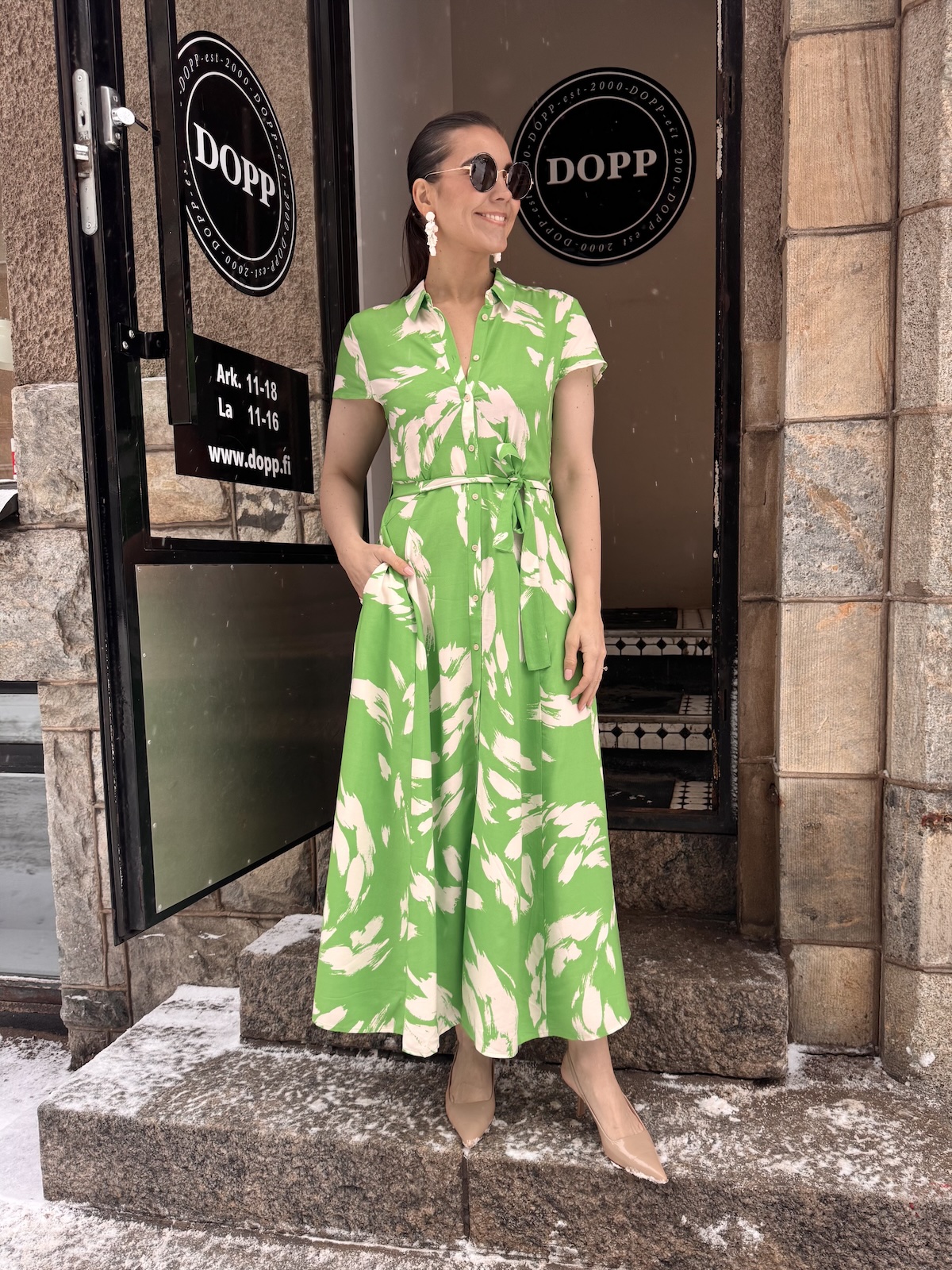 Arjana on kauniin mallinen midimekko! Mekossa on kaulukset ja edessä on napit. Hihat tipahtavat olkapäiden alapuolelle. Mekko on vartalonmyötäinen vyötärölle saakka, jonka jälkeen helmaosa levenee alaspäin ja loppuu lähelle nilkkoja. Mekossa on taskut ja mekkoon kuuluu vyö. Gabilla on mekosta päällä koko M. Mekko on yhden koon pienempää kokoa kuin normaalisti.