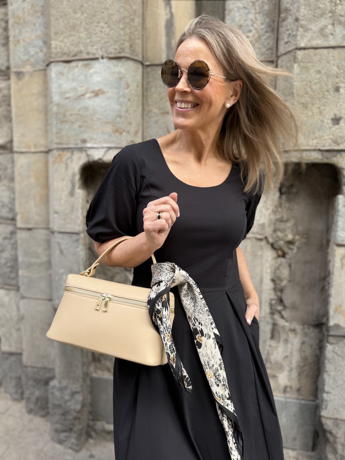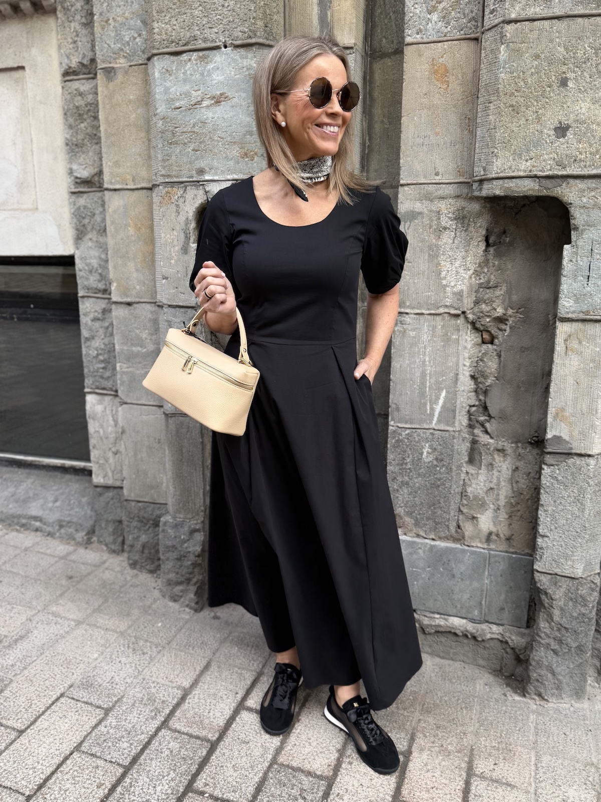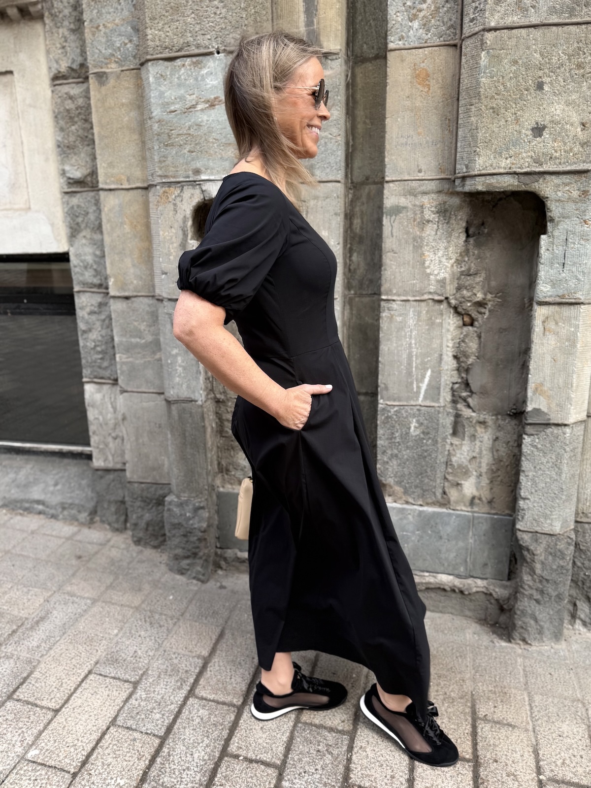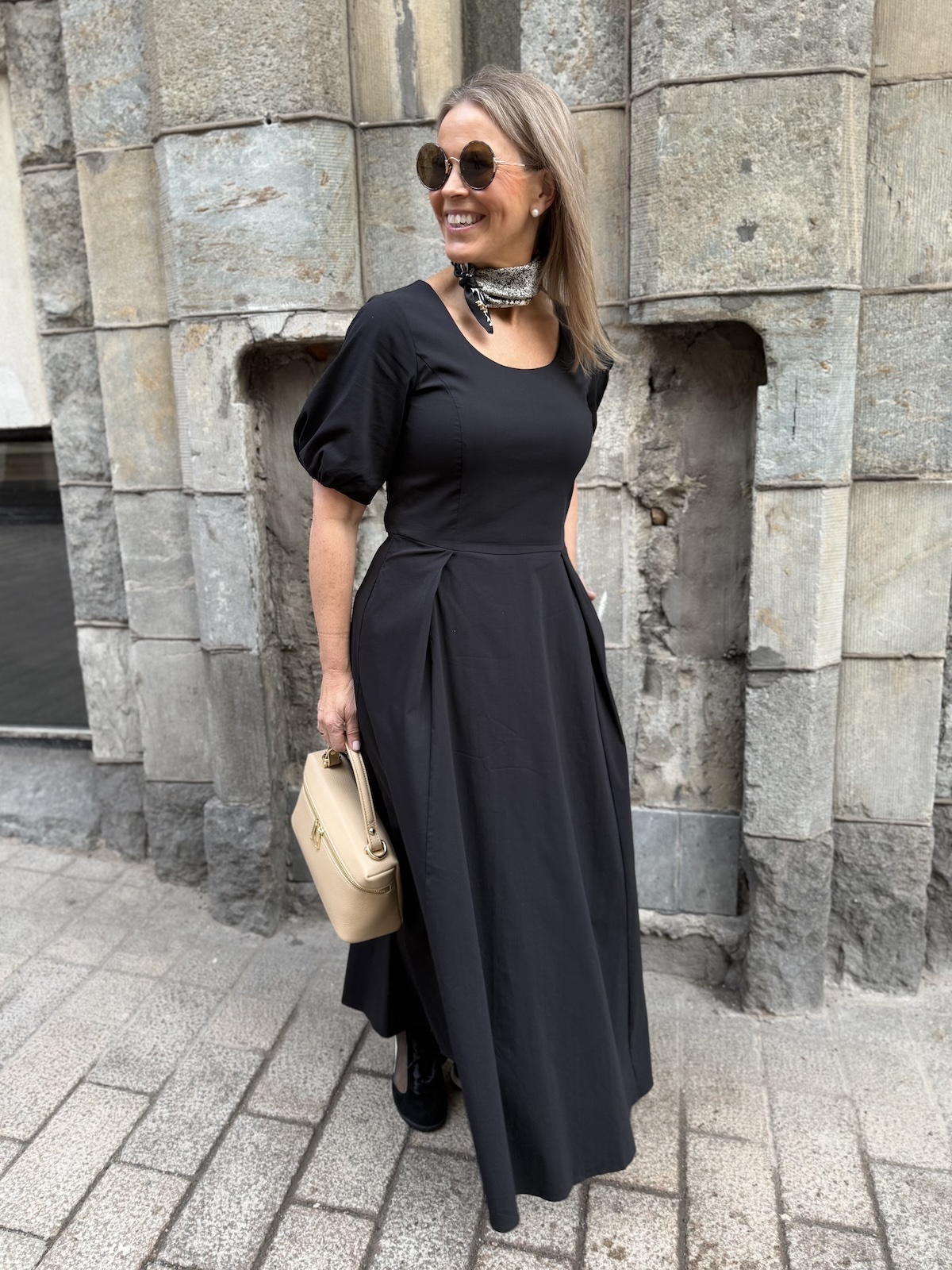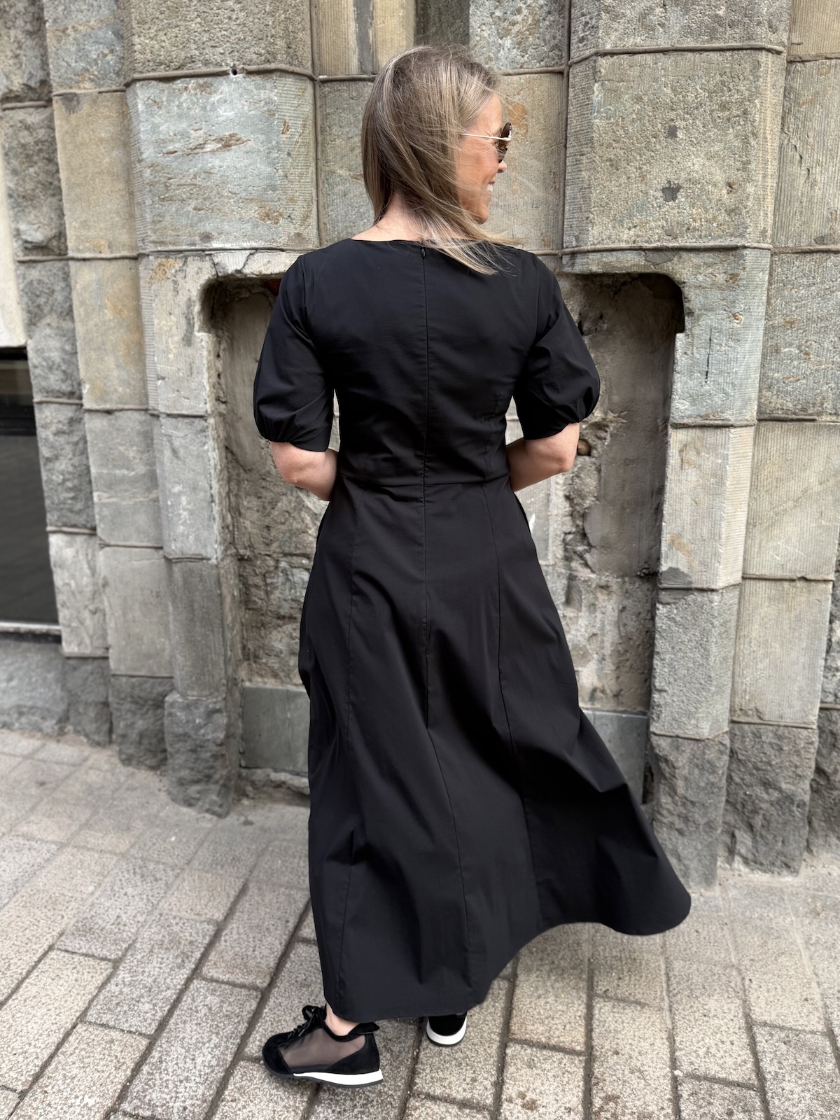 Ciara on joustavaa ja miellyttävää materiaalia. Mekossa on O-kaula-aukko ja hieman pussimaiset hihat kuminauhalla. Mekko on vartalonmyötäinen mekon poikkileikkaukseen asti. Poikkileikkauksen kohdalla on muutama laskos. Mekon helma levenee alaspäin ja loppuu noin nilkkojen kohdalle. Mekon sivussa on taskut. Katalla on mekosta päällä koko 34. Mitat ovat iman mekon venytystä. Mekon ry venyy noin 5 cm alla oleviin mittoihin.