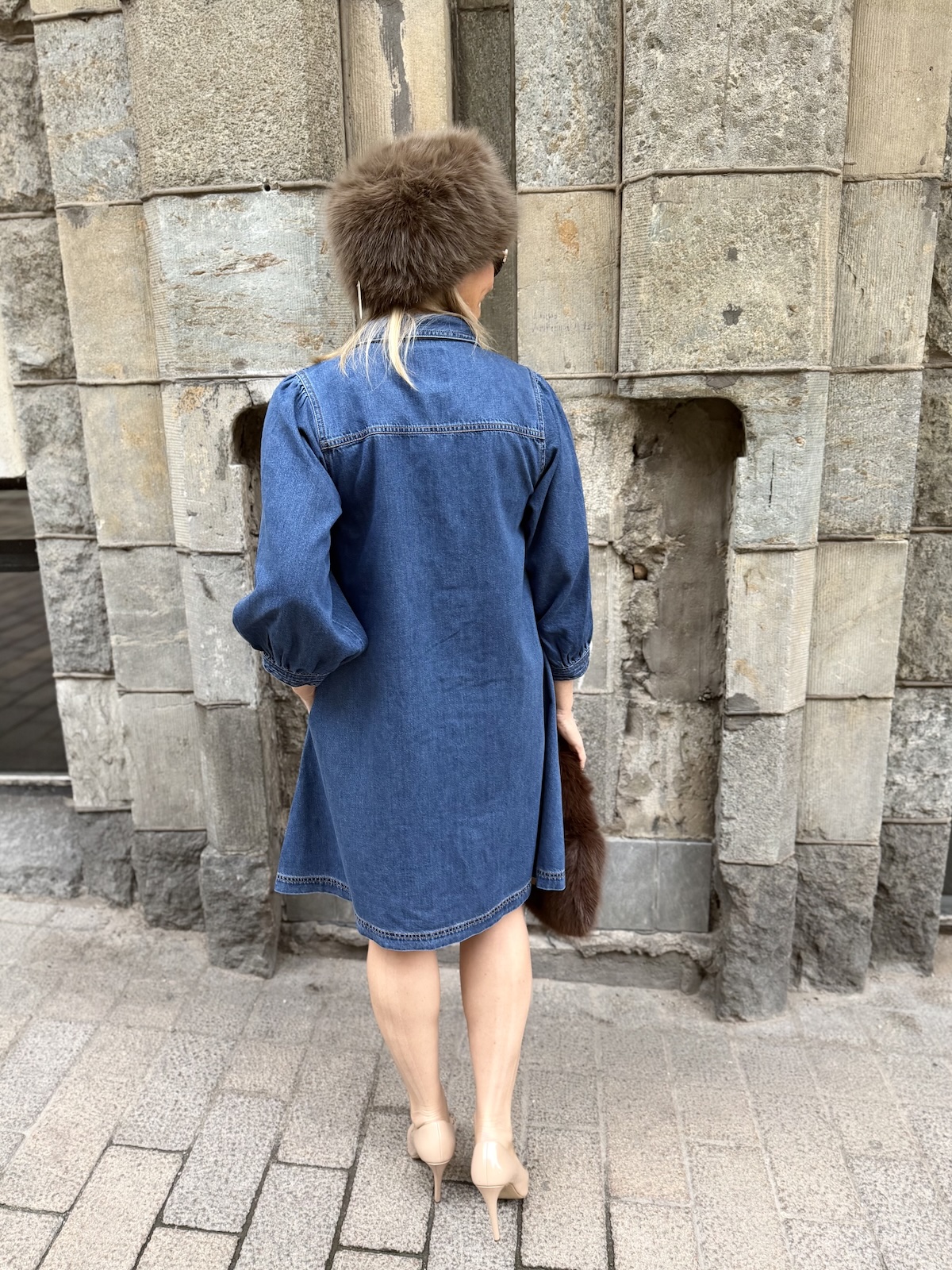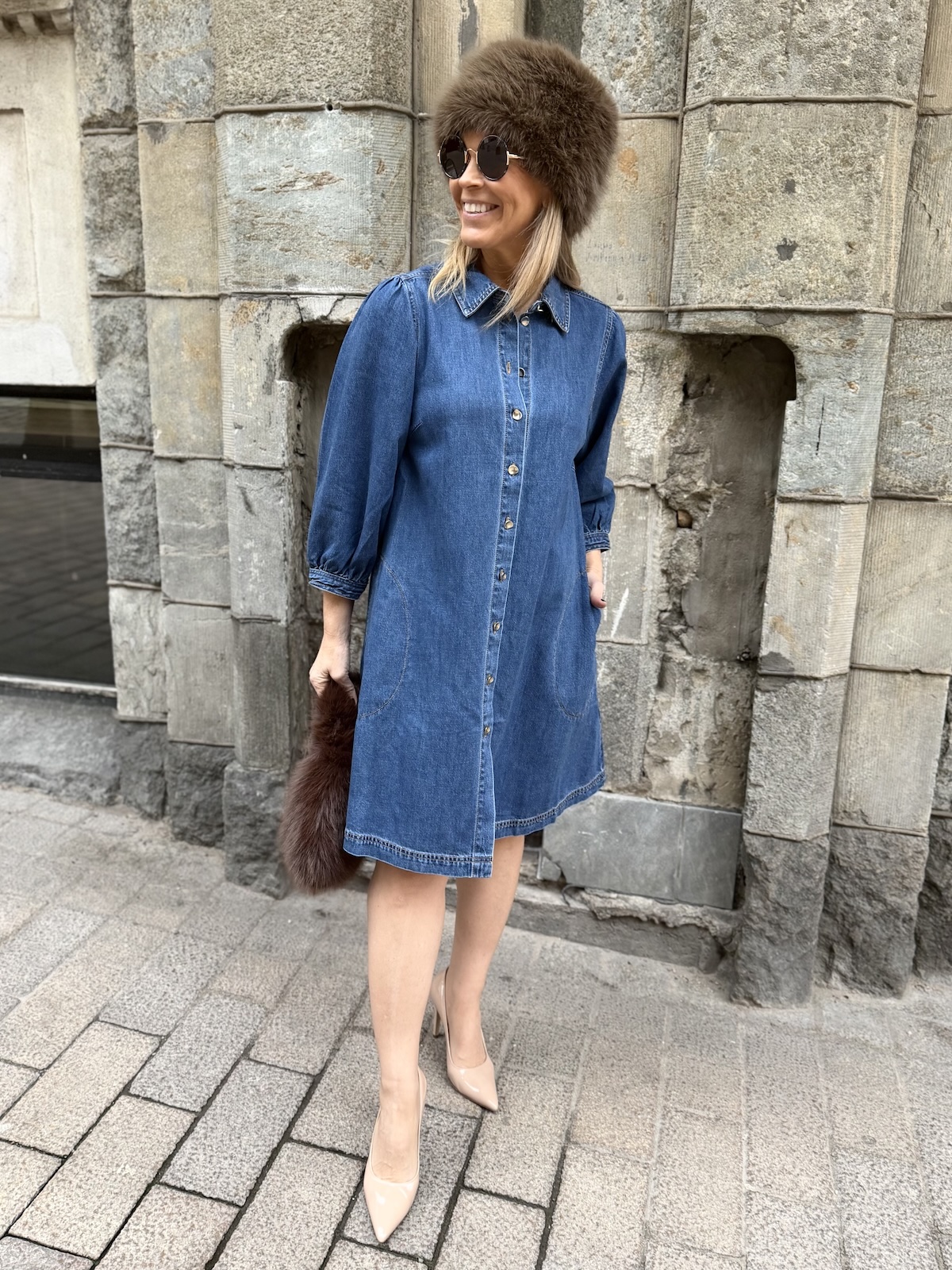 Farkkumekko on pehmoista ja notkeaa materiaalia. Mekossa on kaulukset ja puolipitkät hihat. Edessä on täysin avattavat napit. Mekko levenee alaspäin ja loppuu noin polvien kohdalle. Mekon sivuissa on taskut. Katalla on mekosta päällä koko 34. Mekko vastaa normaalia kokoa.