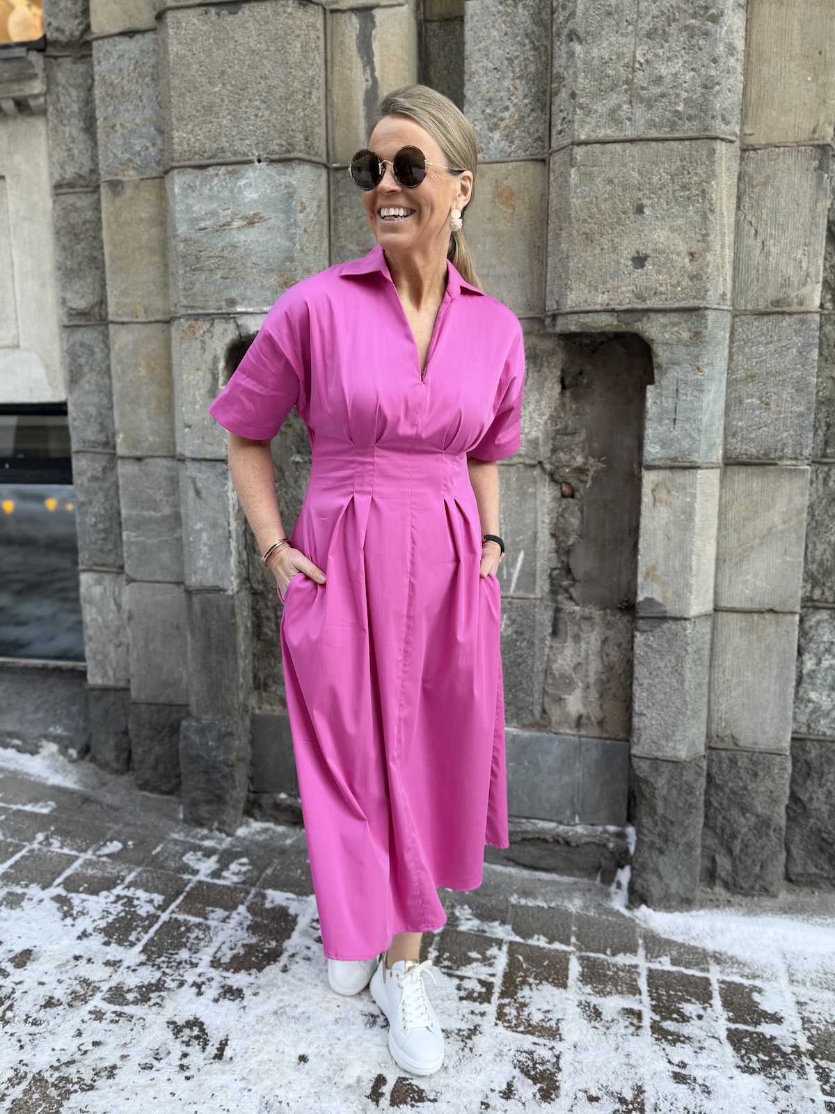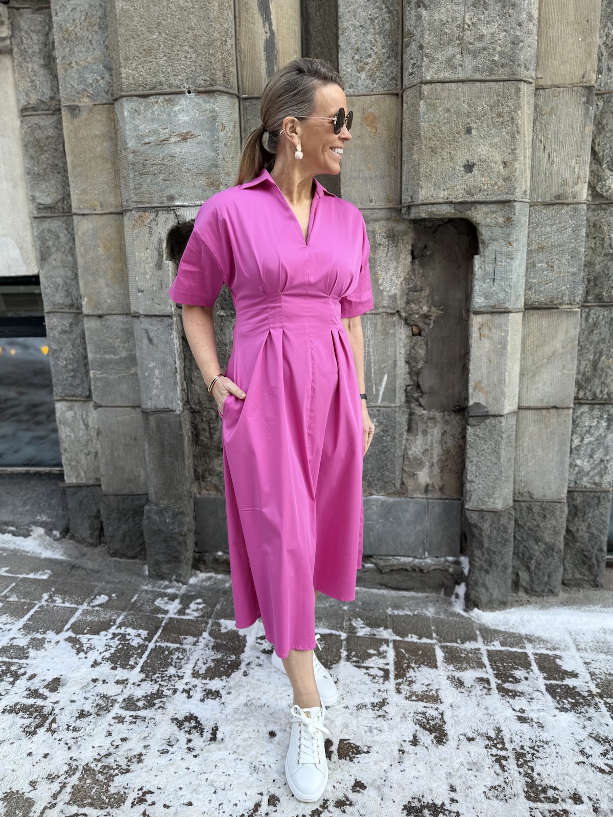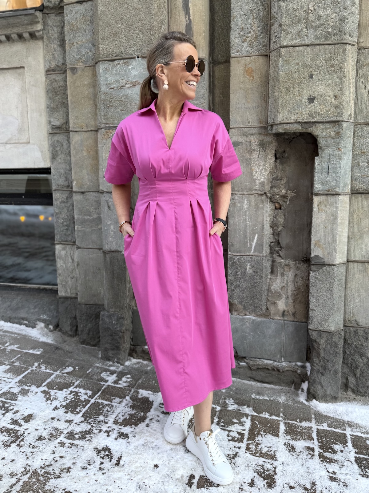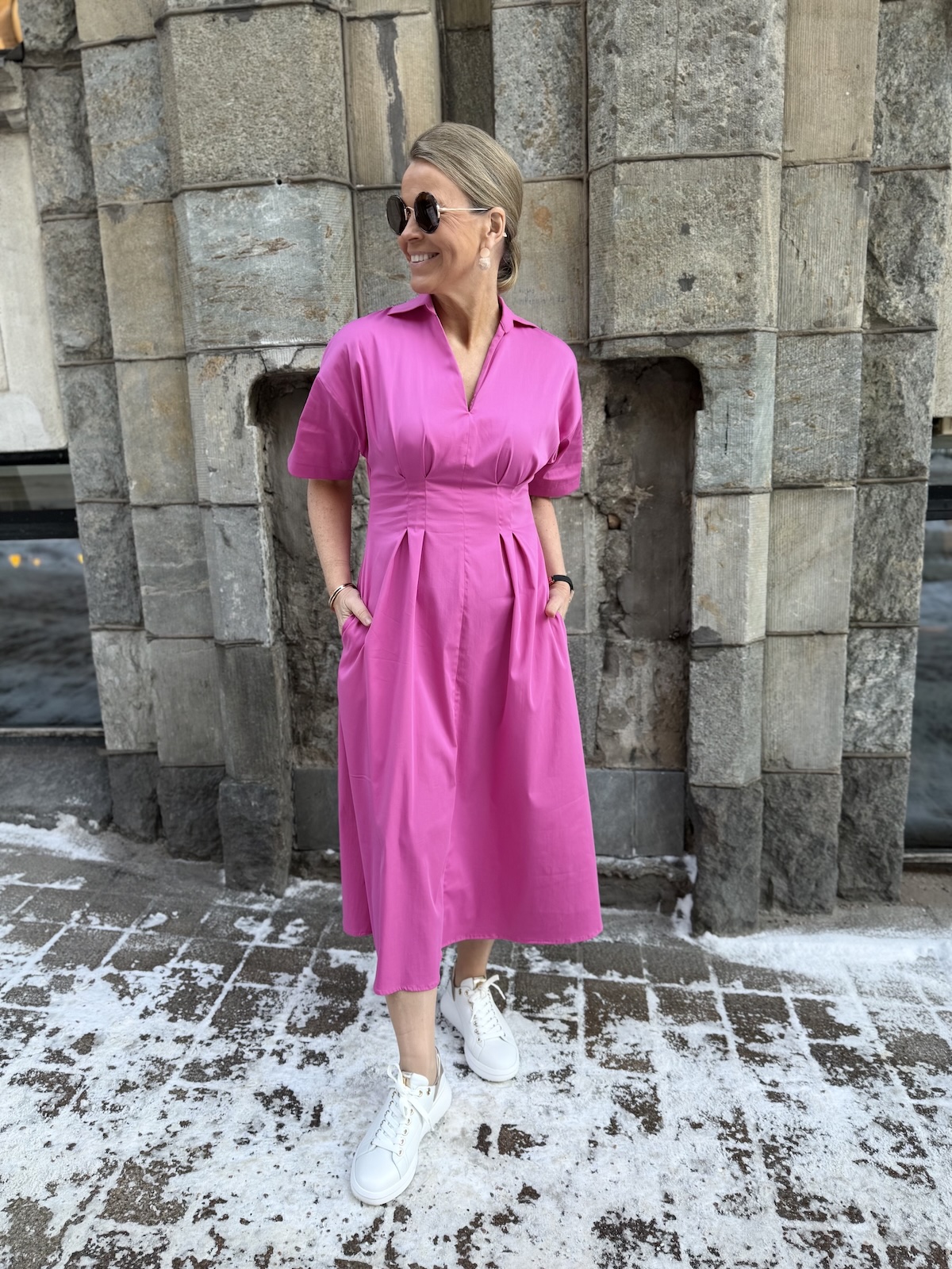 Lily on ihana kevään uusi piristys! Mekon materiaali on pehmoista ja joustavaa. Mekossa on V-kaula-aukko ja kaulukset. Olkasaumat tulevat olkapäiden alapuolelle ja hihat ovat suorat ja löysähköt ja ne ylettyvät juuri kyynerpäiden yläpuolelle. Mekko korostaa vyötäröä edessä ja takana olevilla sisäänotoilla. Mekon sivuissa on taskut ja helma levenee kevyesti alaspäin ja loppuu lähelle nilkkoja. Mekko soveltuu myös lyhkäisemmille naisille midimekoksi. Katalla on mekosta päällä koko 34. Mekko vastaa normaalia kokoa.