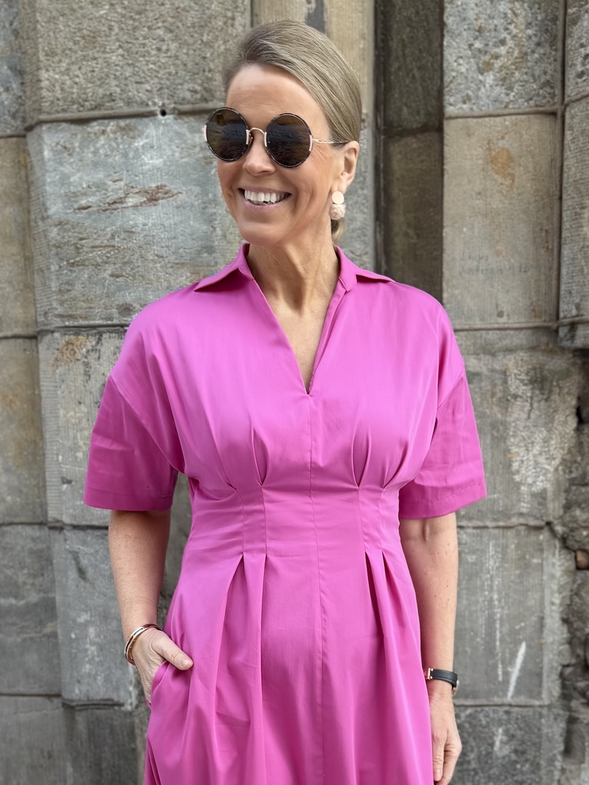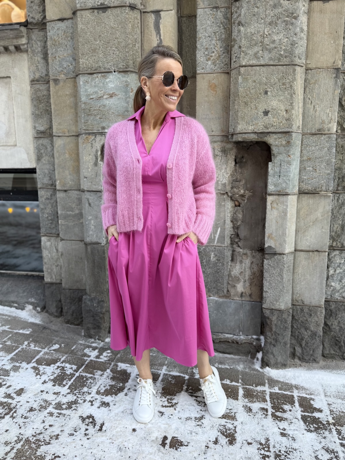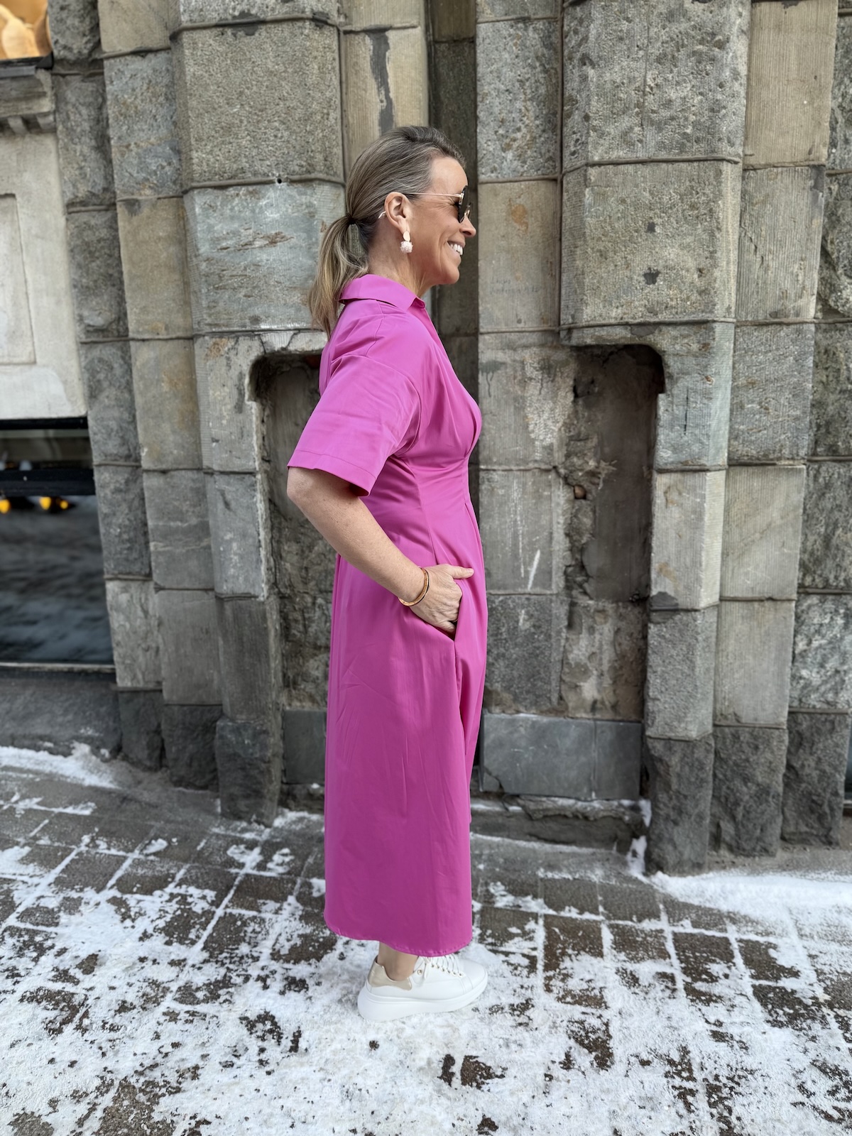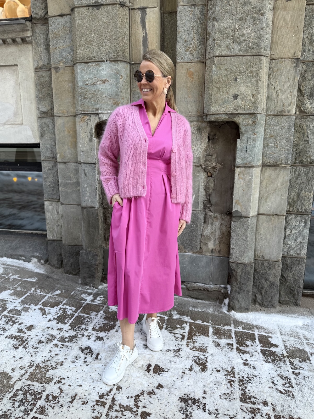 Lily on ihana kevään uusi piristys! Mekon materiaali on pehmoista ja joustavaa. Mekossa on V-kaula-aukko ja kaulukset. Olkasaumat tulevat olkapäiden alapuolelle ja hihat ovat suorat ja löysähköt ja ne ylettyvät juuri kyynerpäiden yläpuolelle. Mekko korostaa vyötäröä edessä ja takana olevilla sisäänotoilla. Mekon sivuissa on taskut ja helma levenee kevyesti alaspäin ja loppuu lähelle nilkkoja. Mekko soveltuu myös lyhkäisemmille naisille midimekoksi. Katalla on mekosta päällä koko 34. Mekko vastaa normaalia kokoa.