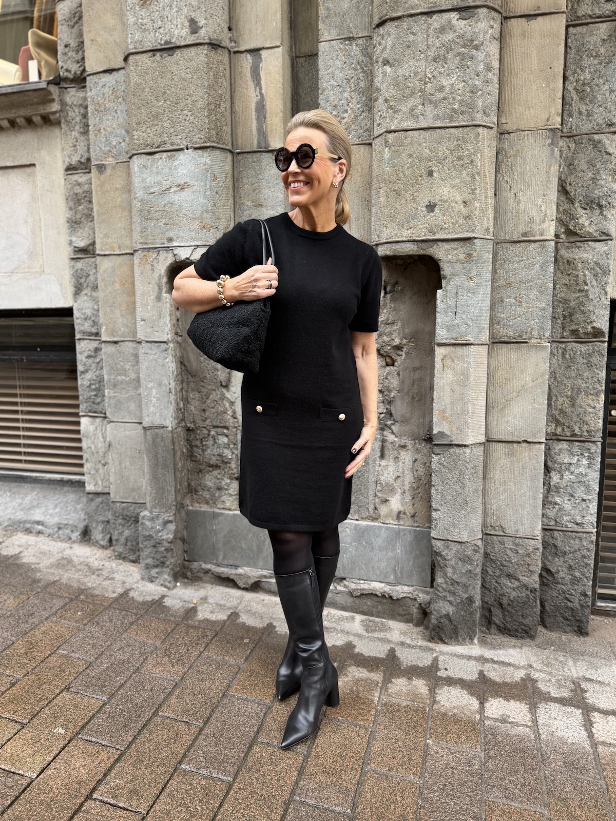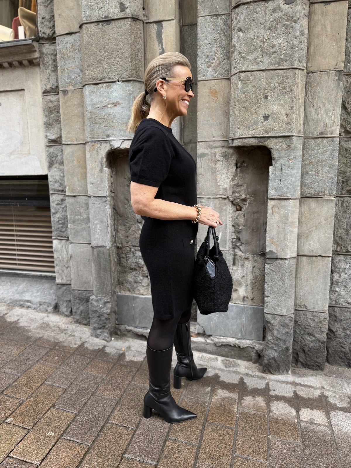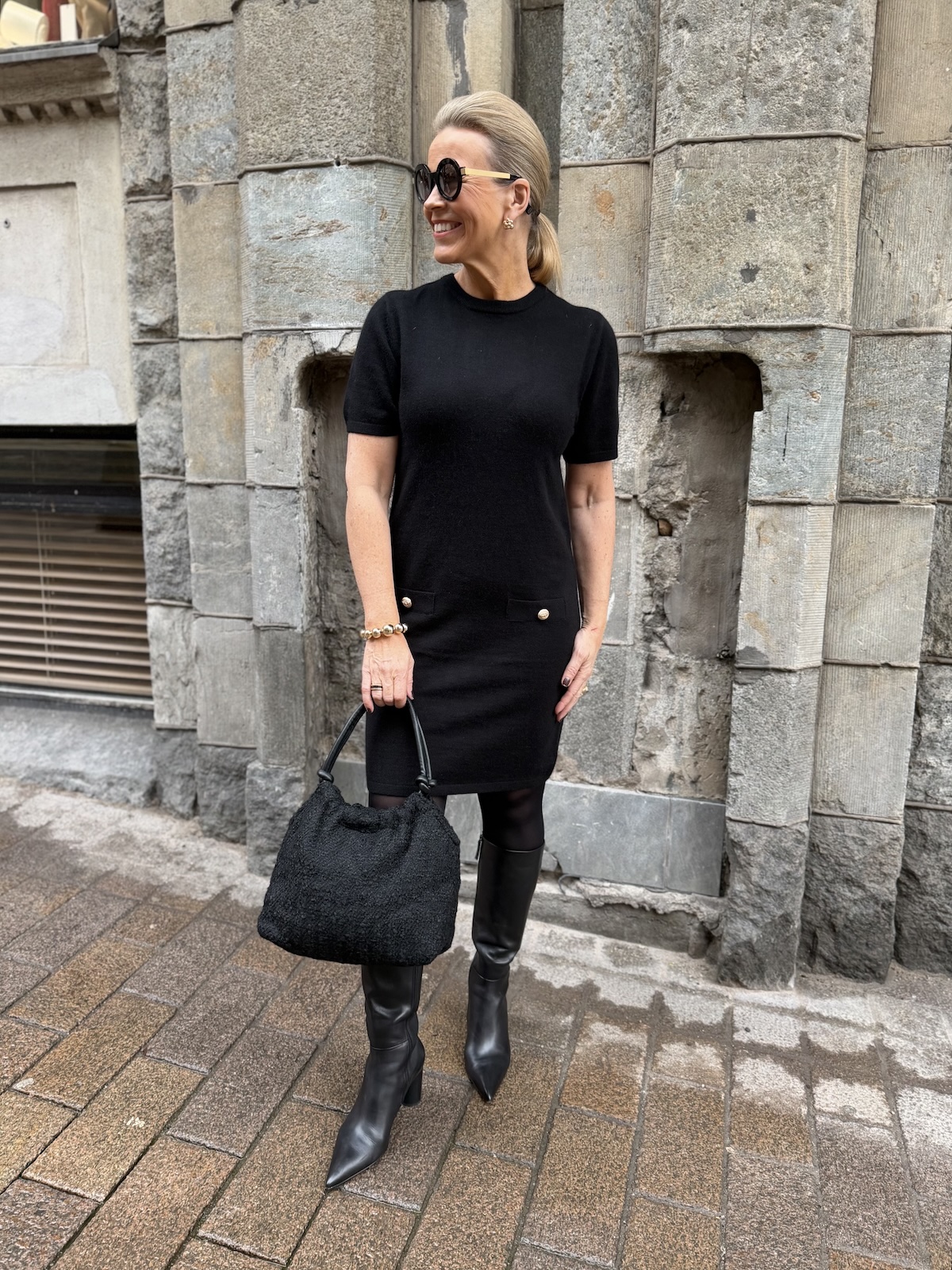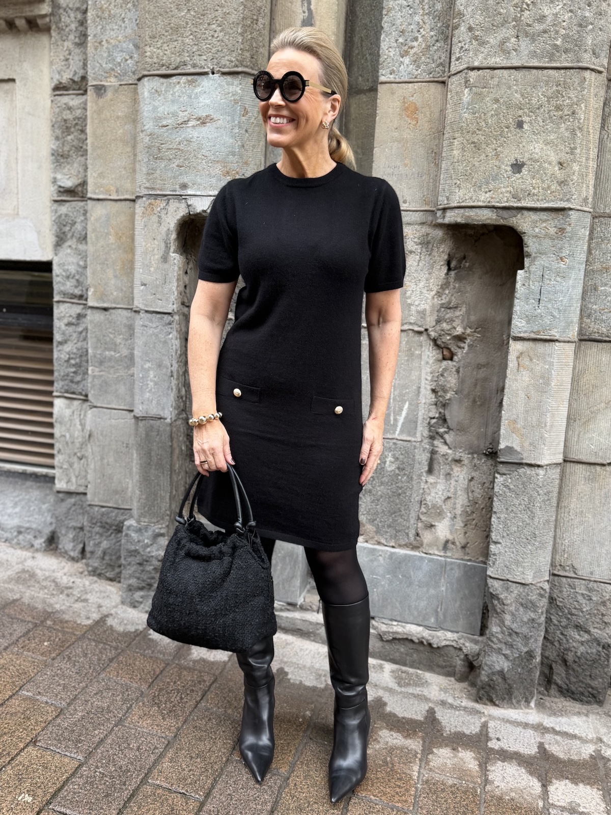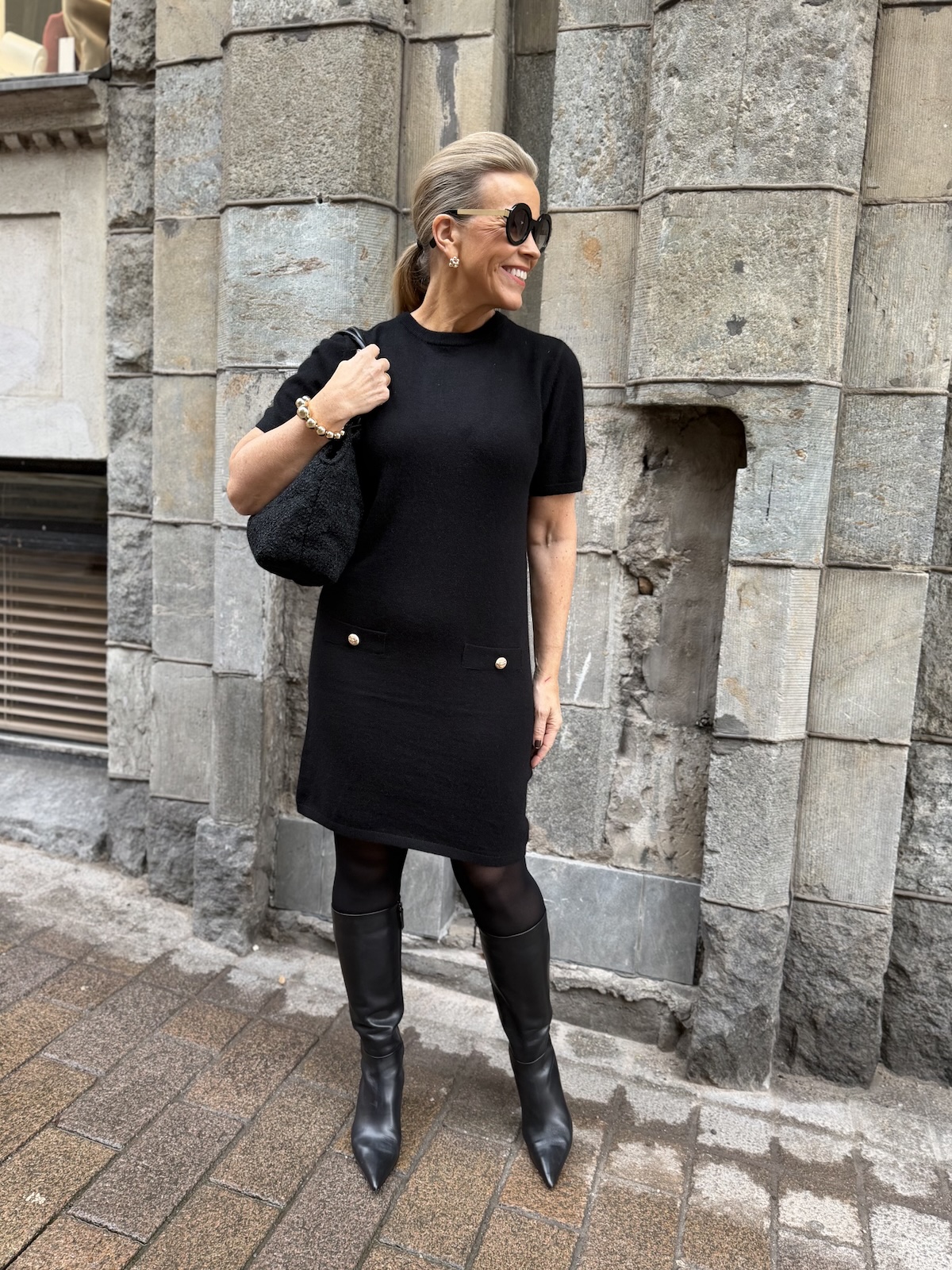 Monti neulemekko on tyylikäs ja ajaton mekko. Mekossa on O-kaula-aukko ja lyhkäiset hihat. Malliltaan mekko on suorahko ja se loppuu polvien yläpuolelle/päälle. Edessä on valetaskut kullanvärisillä napeilla. Katalla on mekosta päällä koko S.