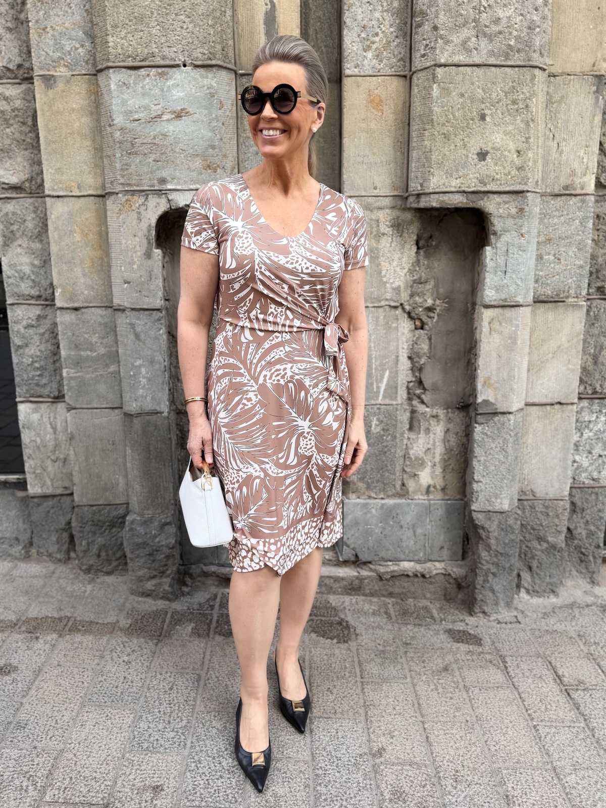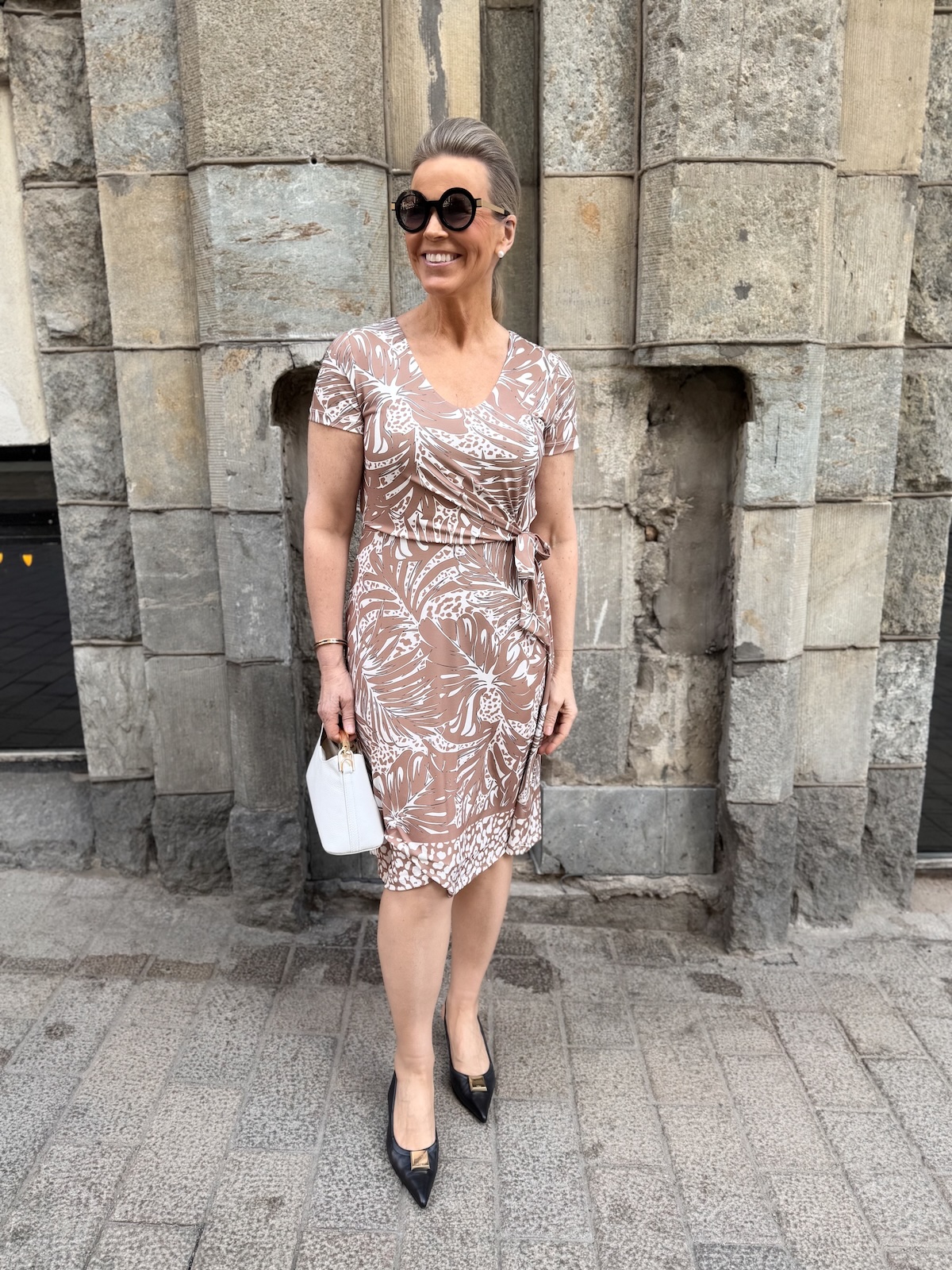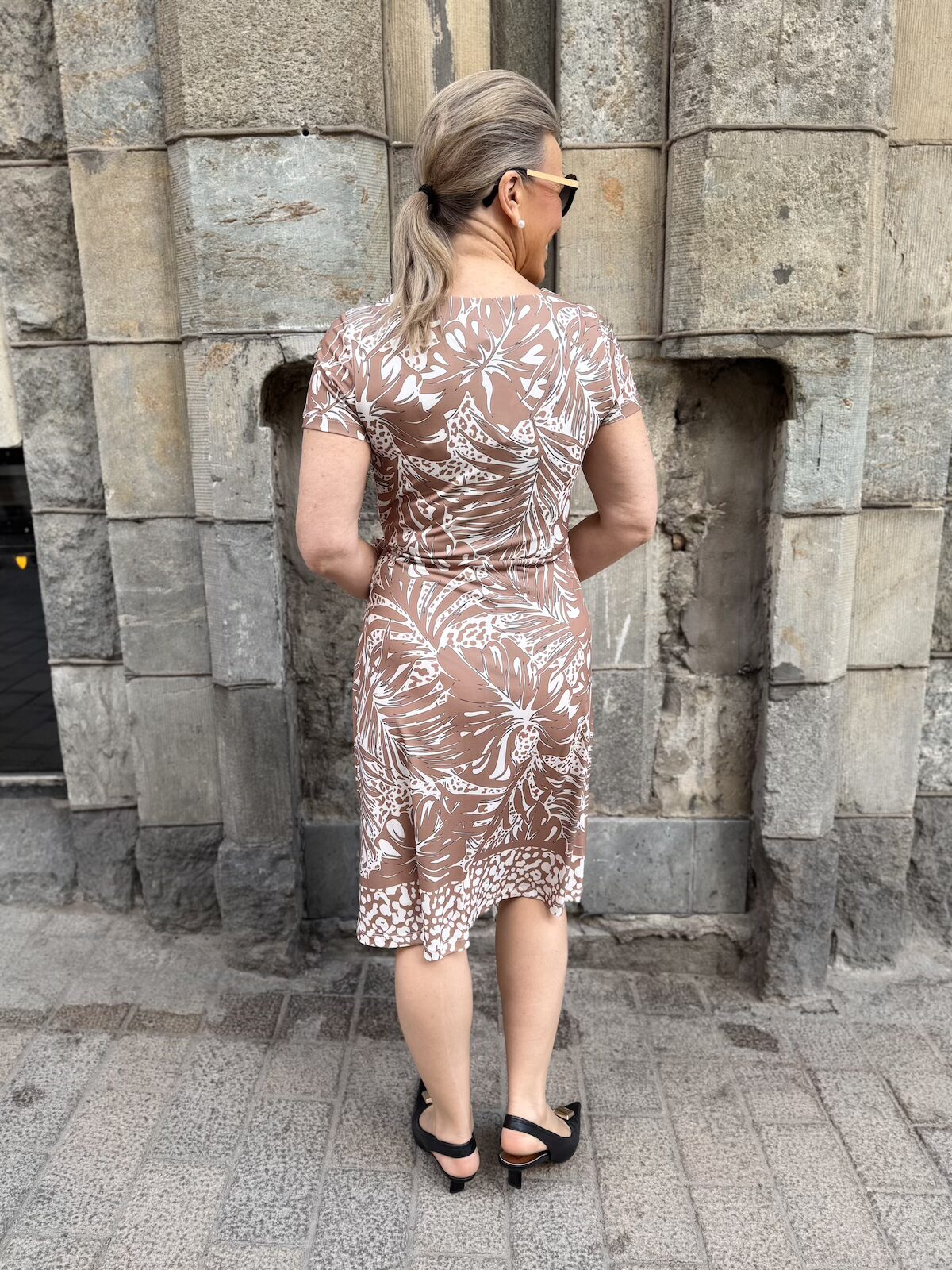 Sarah on joustavaa ja ja ihanaa materiaalia. Sitä vain pestään ja pidetään. Kaula-aukko on V-mallinen ja hihat ovat lyhkäiset. Vyötäröllä on nauhat eli mekko sidotaan toiselle puolelle vyötäröä. Yläosassa on kaksikertainen kangas. Helmaosa levenee kevyesti alaspäin ja mekko loppuu juuri ja juuri polven alapuolelle. Pituus toki riippuu naisen pituudesta sekä mekon koosta. Katalla on mekosta päällä koko 36.
