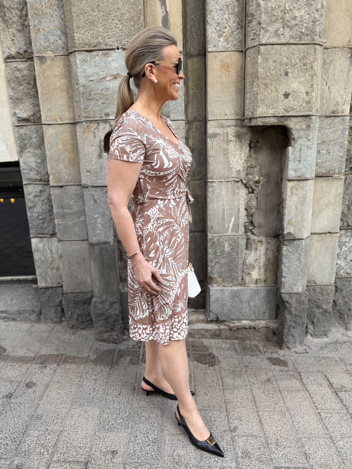 Sarah printtimekko; nougat/valkoinen