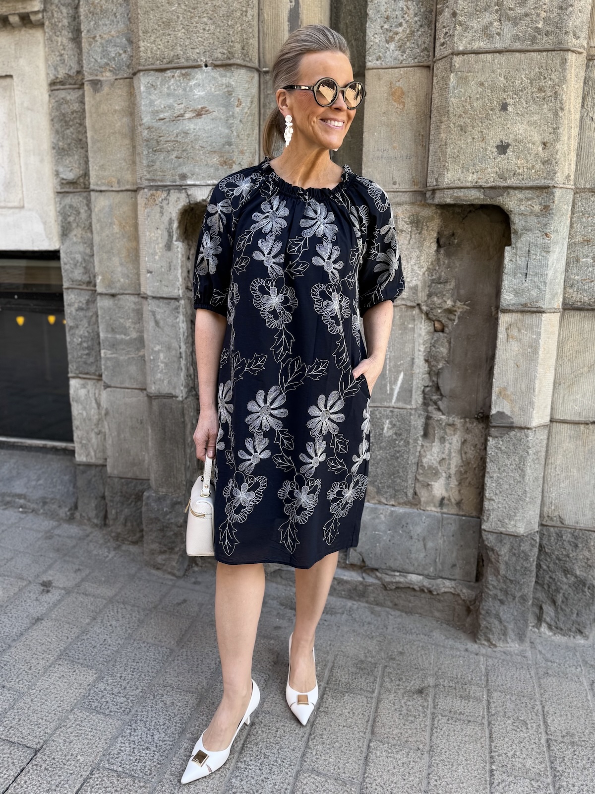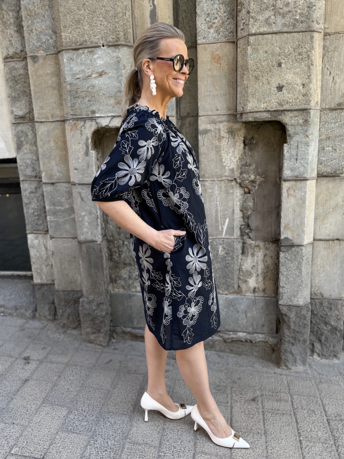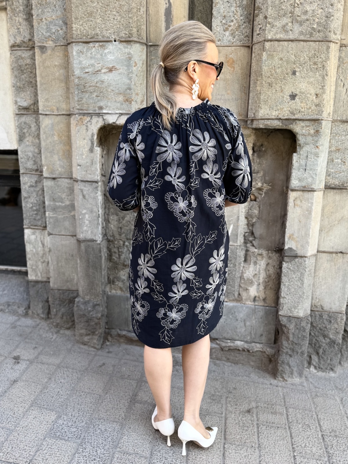 Airia brodeerattu mekko; tummansininen/valkoinen