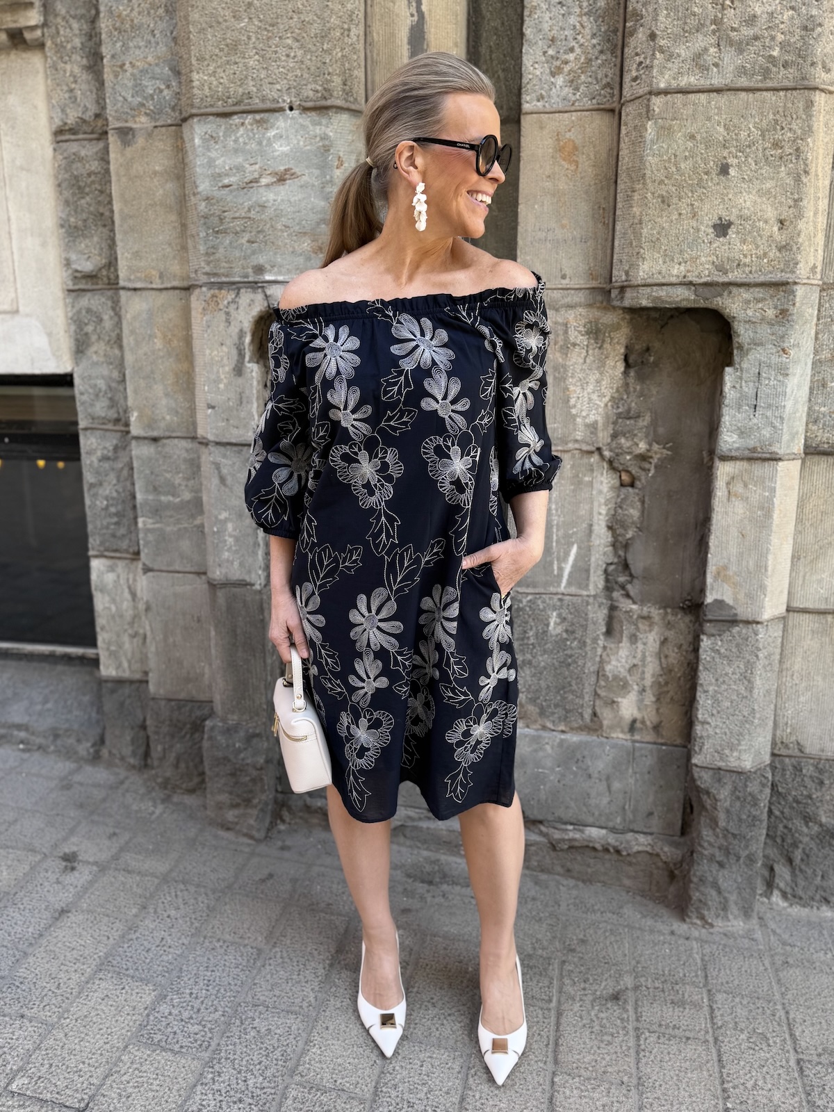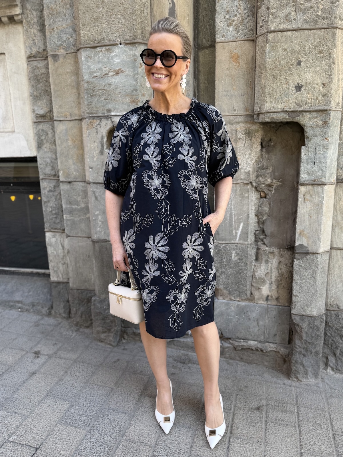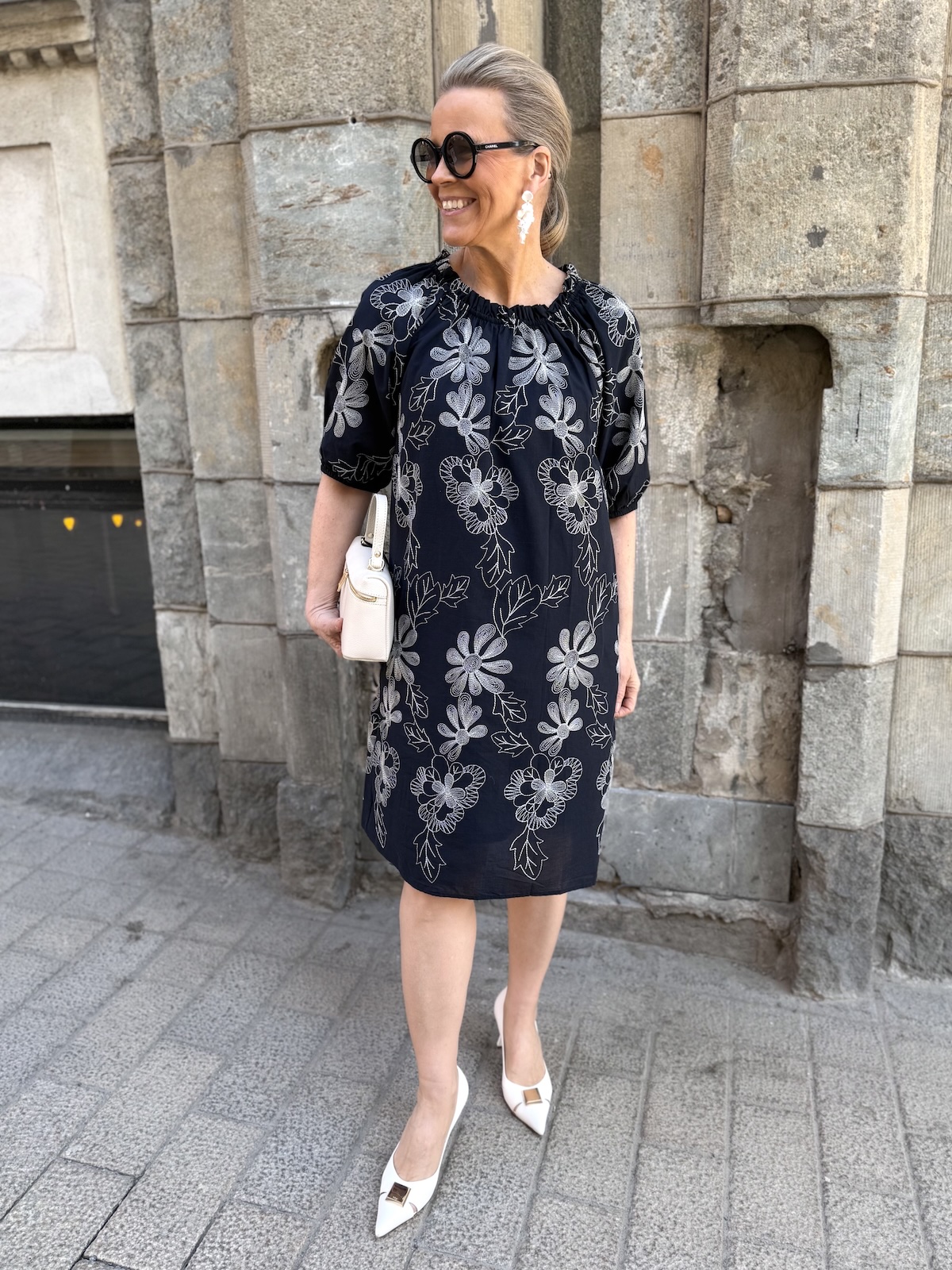 Airia brodeerattu mekko; tummansininen/valkoinen