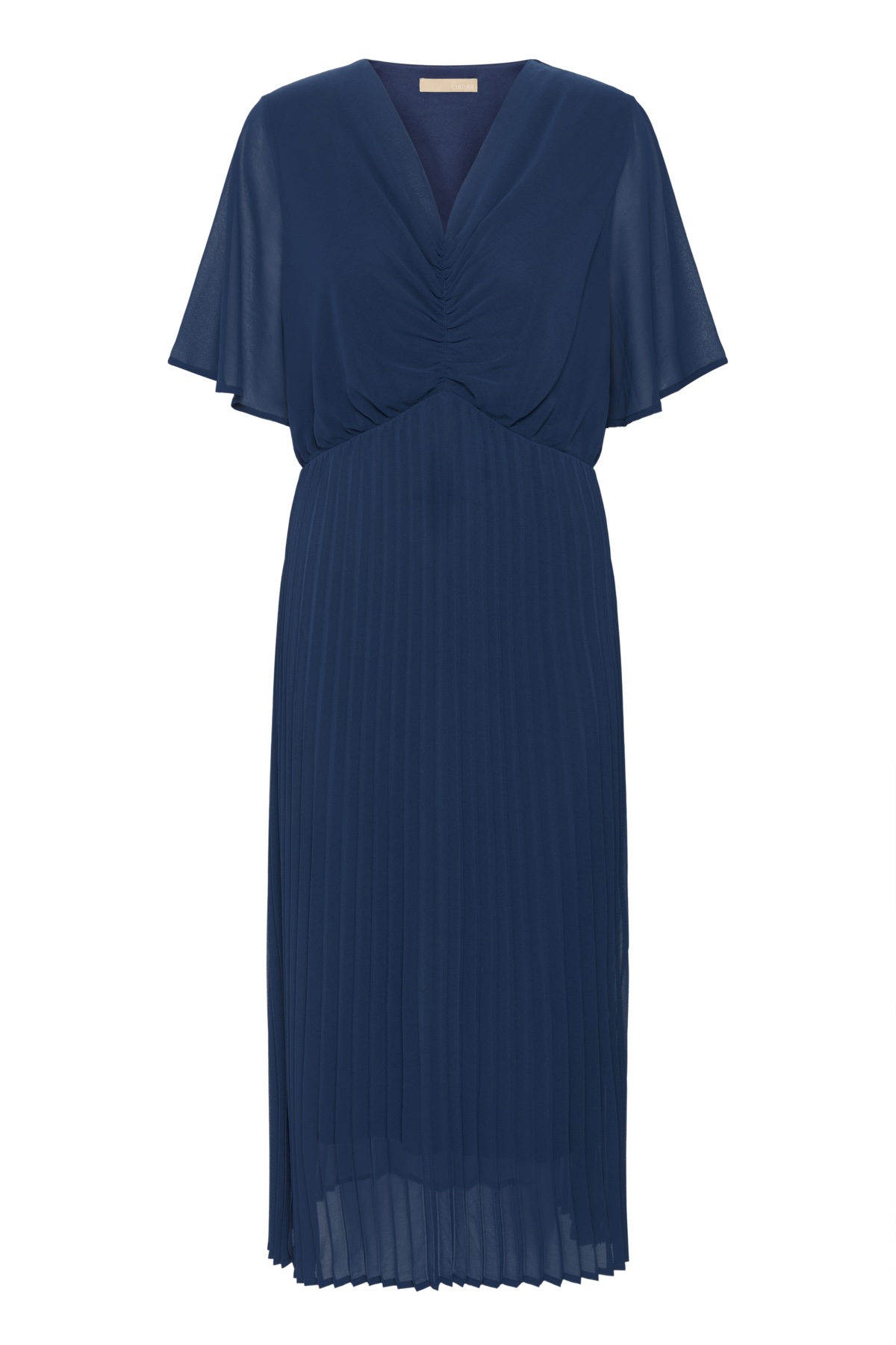 Alvia Cheila mekossa on loistavan mallinen yläosa. Kaula-aukko on V-mallinen ja keskellä edessä on joustava kuminauha. Hihat ovat kevyet ja ne ylettyvät noin kyynerpäiden kohdalle. Edessä oleva leikkaus on kaareva edestä ja se jatkuu selkäpuolelle. Helmaosa on plisetattu. Kata käyttää mekosta kokoa XS. Mekko on reiluhkoa kokoa.