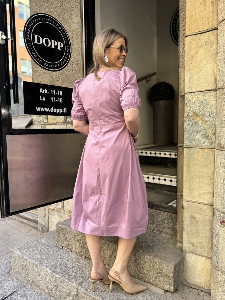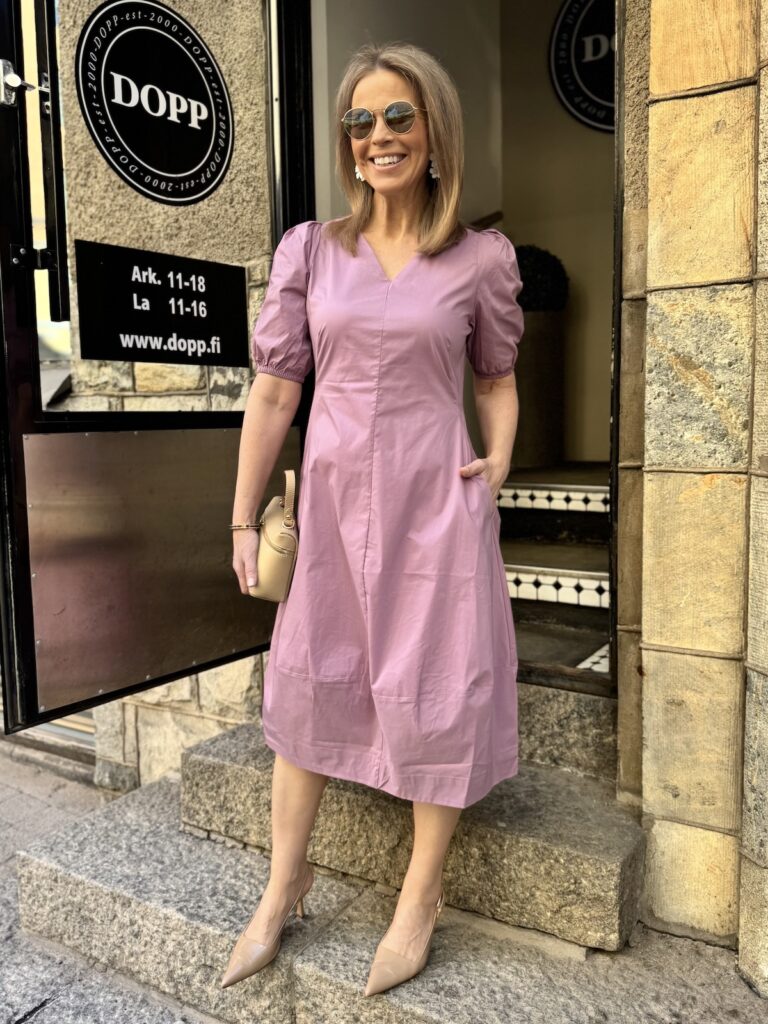 Antoinett pallomekko on hauska! Mekossa on Antoinett mekoille tyypillinen materiaali. Mekossa on lyhkäiset hihat, hihansuissa on kuminauha ja siinä on juuri sopivan syvä V-kaula-aukko. Mekossa on sisäänotot vyötäröllä ja poikkielikkaus takana selässä, joten se istuu loistavasti. Helmaosa on pallomainen (lantiolla on tilaa) ja mekon sivuissa on taskut. Katalla on mekosta päällä koko XS. Mekko on reilua kokoa ja koon ratkaisee rinnan- ja vyötärönympärys. Suosittelemme ottamaan mekosta yhden koon pienemmän kuin normaalisti. Mekko soveltuu pieneen menoon, työkäyttöön ja vapaa-aikaan. Mekkoon voi yhdistää tennareista korkkareihin.