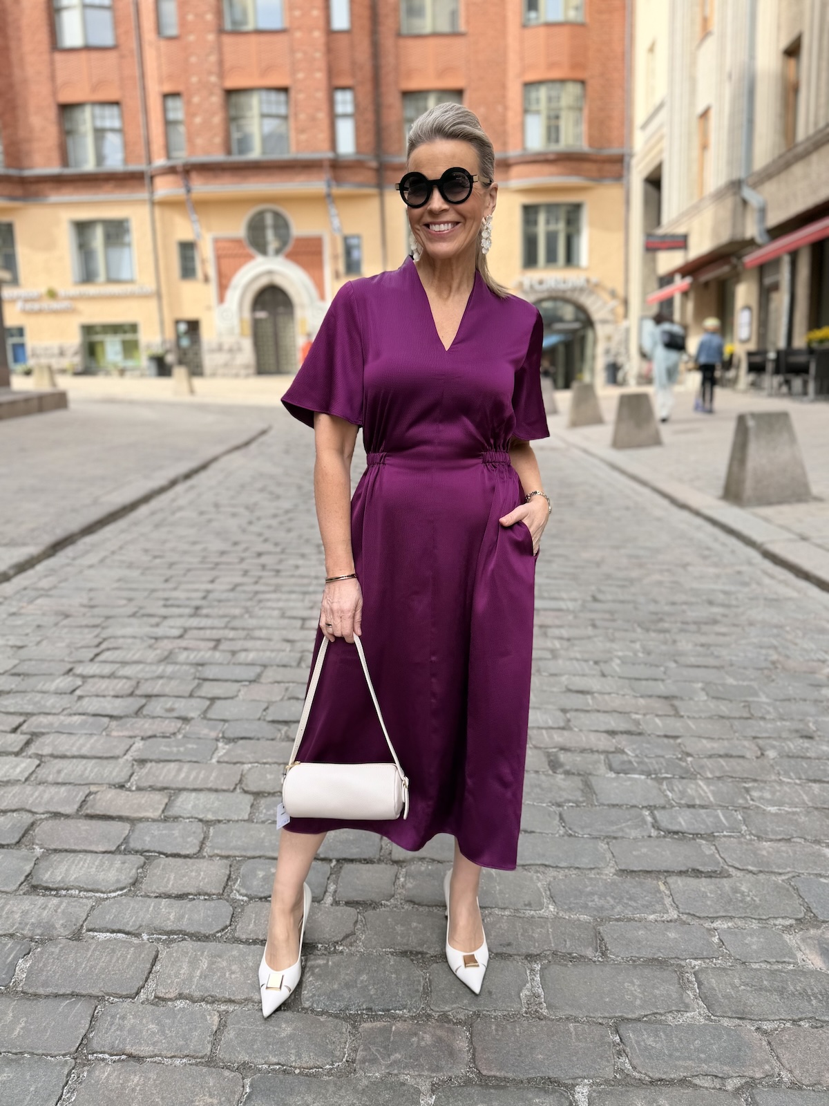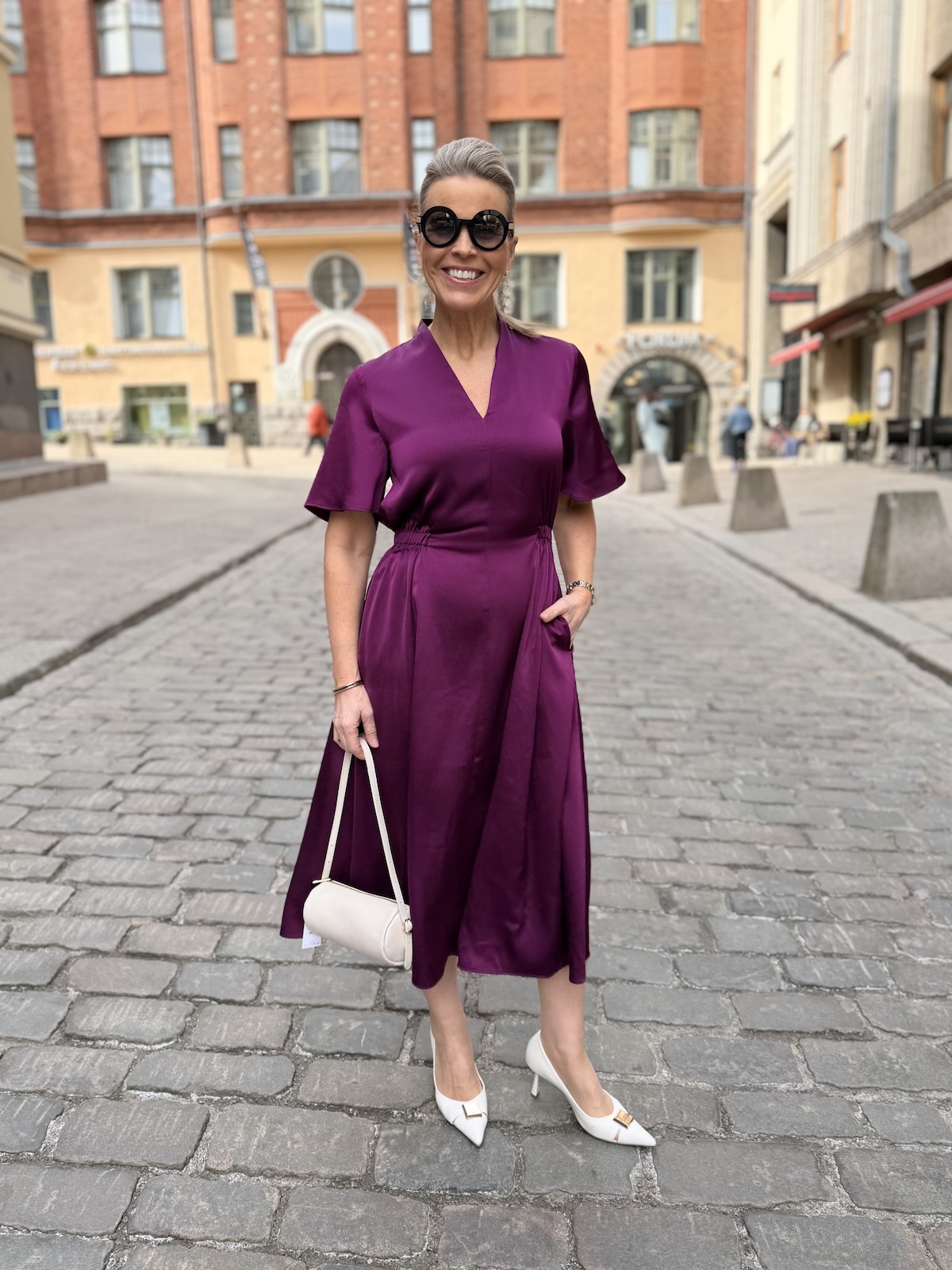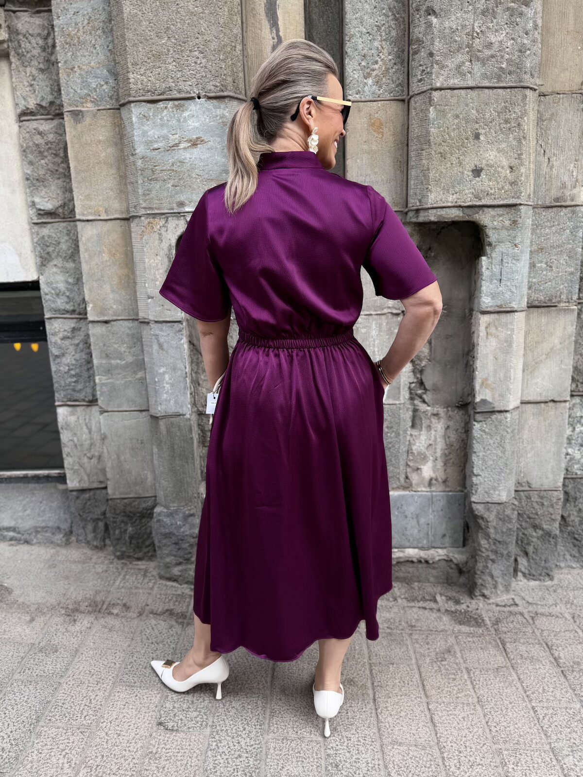 Balja mekko toimii pieneen menoon ja myös juhlien jälkeiseen arkeen. Mekossa on kaunis kaula-aukko. Edestä se on kapea ja terävähkö V-mallinen ja niskasta kaulus on nostettu eli se on on pukeva myös niskan puolelta. Hihat ovat löysähköt ja ne ylettyvät kyynerpäiden yläpuolelle. Vyötärölllä on poikkileikkaus. Edestä vyötärö on sileä, mutta sivuista ja takana on joustava kuminauha. Helmaosa levenee alaspäin ja loppuu polvien alapuolelle, mutta ei ole täysin midimittainen. Tämä soveltuu myös lyhkäisemmille naisille midimekoksi. Mekon sivuissa on taskut. Katalla on mekosta päällä koko 34 ja videolla gabilla on päällä koko 36.