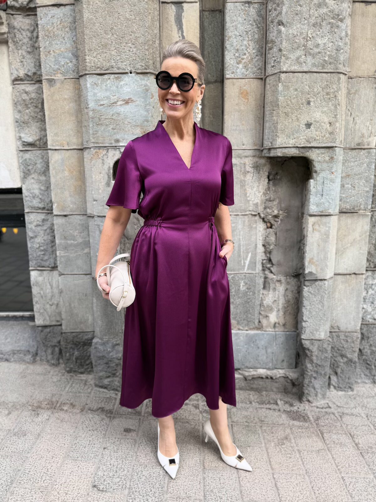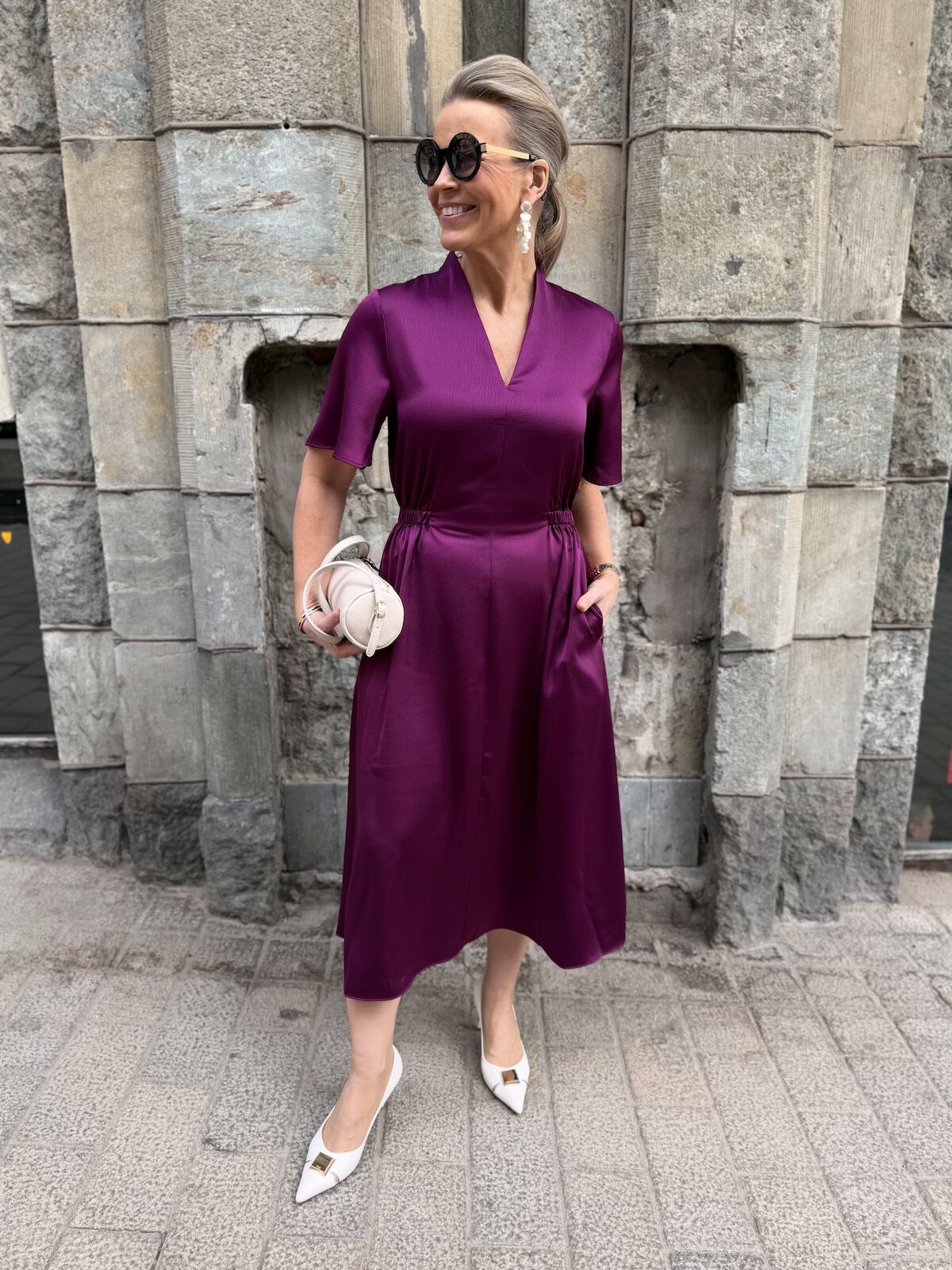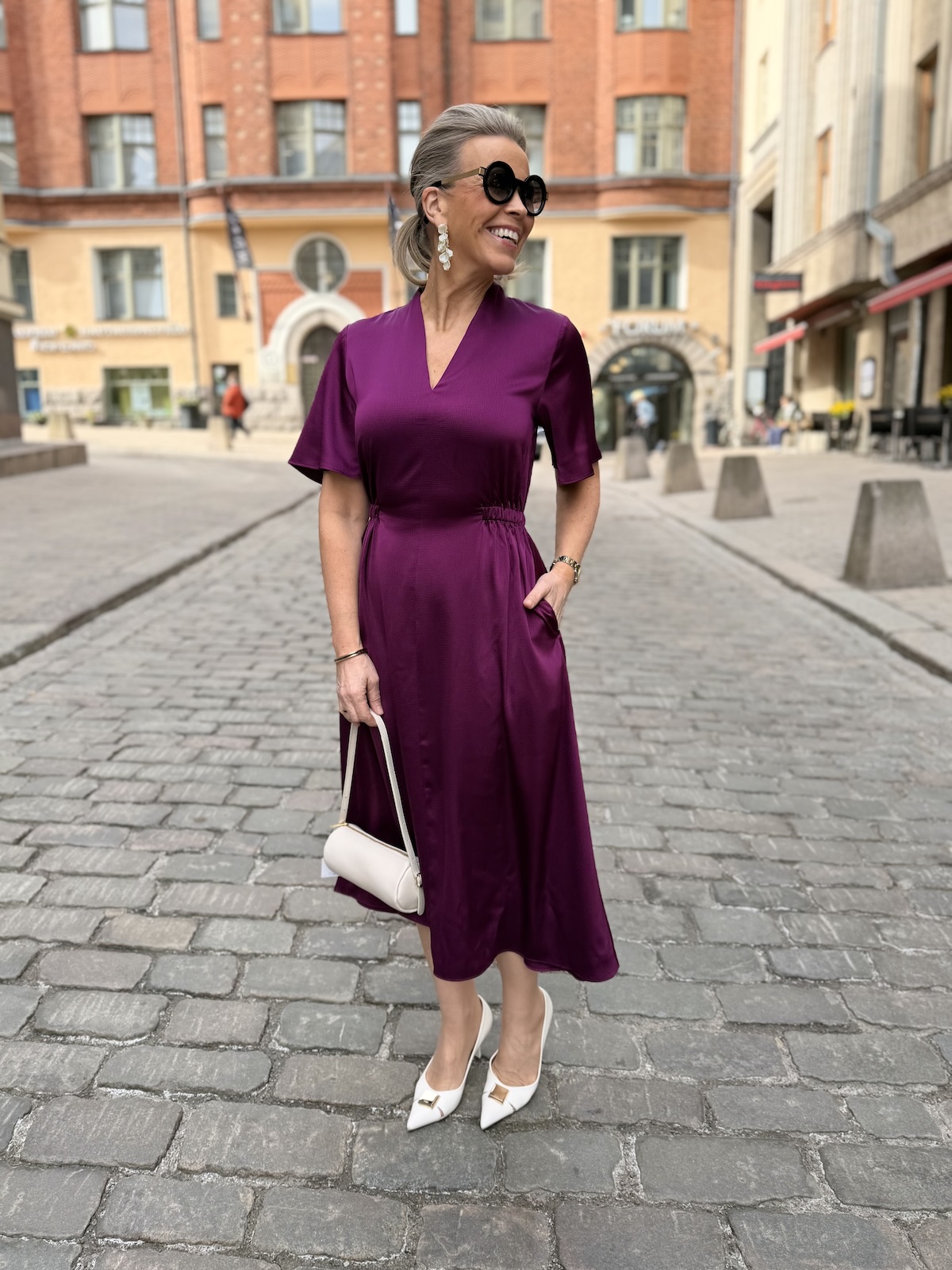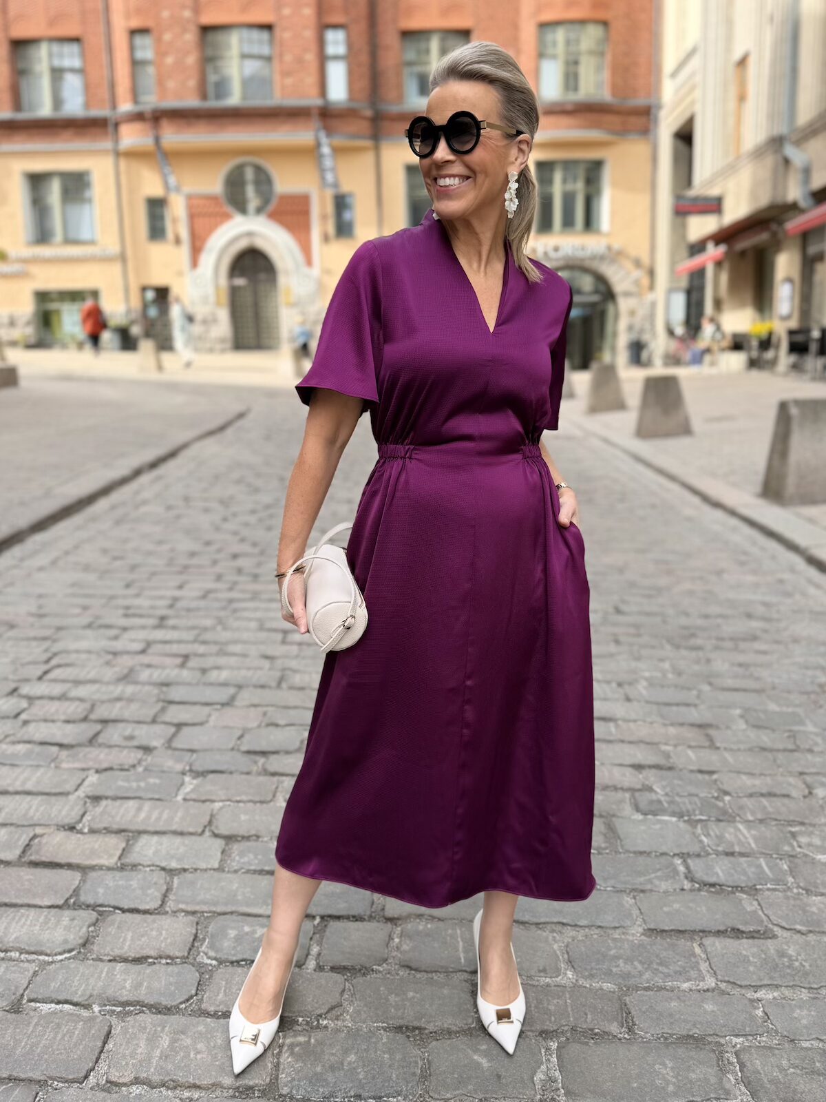 Balja mekko toimii pieneen menoon ja myös juhlien jälkeiseen arkeen. Mekossa on kaunis kaula-aukko. Edestä se on kapea ja terävähkö V-mallinen ja niskasta kaulus on nostettu eli se on on pukeva myös niskan puolelta. Hihat ovat löysähköt ja ne ylettyvät kyynerpäiden yläpuolelle. Vyötärölllä on poikkileikkaus. Edestä vyötärö on sileä, mutta sivuista ja takana on joustava kuminauha. Helmaosa levenee alaspäin ja loppuu polvien alapuolelle, mutta ei ole täysin midimittainen. Tämä soveltuu myös lyhkäisemmille naisille midimekoksi. Mekon sivuissa on taskut. Katalla on mekosta päällä koko 34 ja videolla gabilla on päällä koko 36.