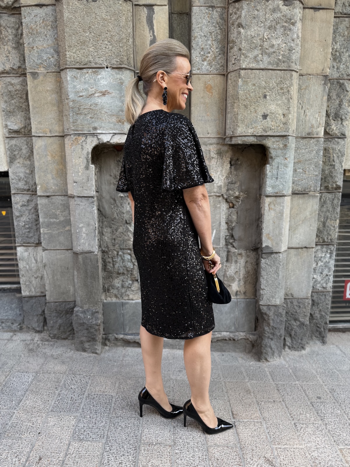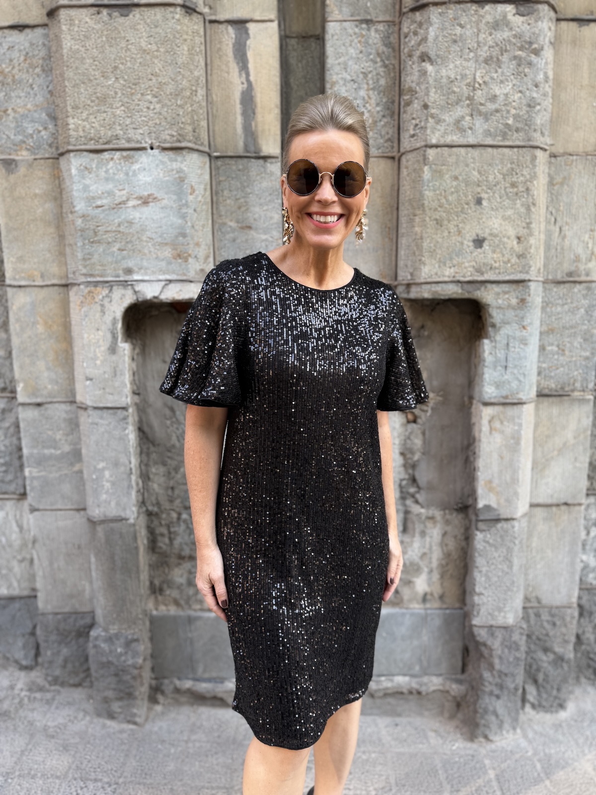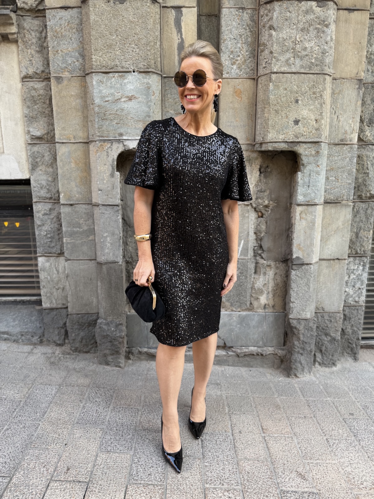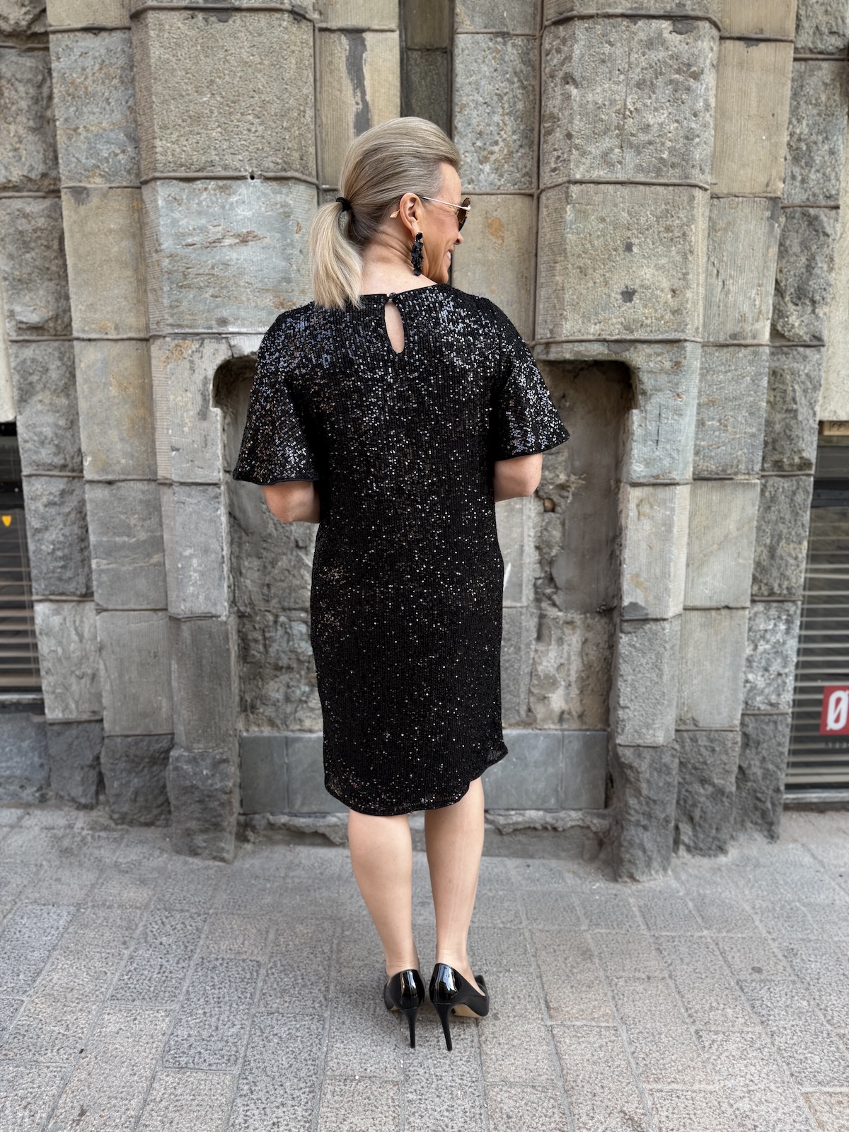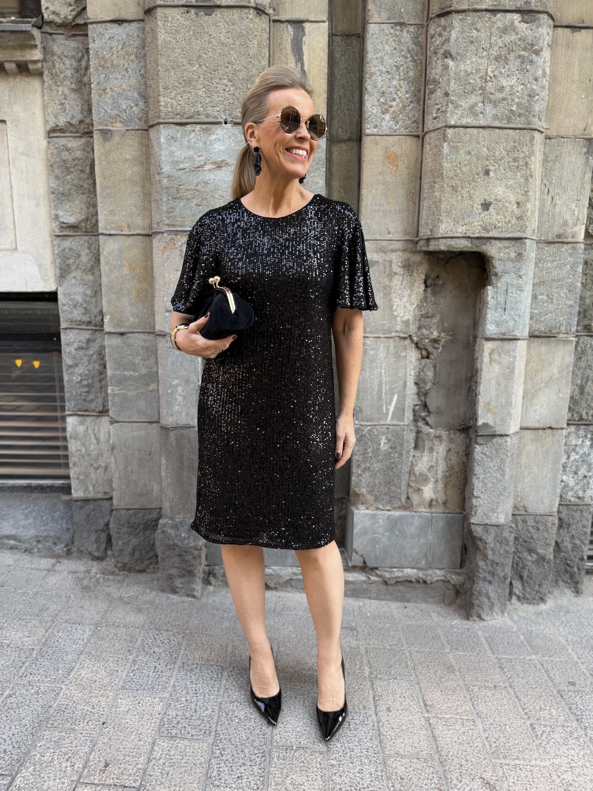 Barbara paljettimekko on sievä. Mekossa on O-kaula-aukko ja alaspäin levenevät hihat, jotka ylettyvät kyynerpäiden yläpuolelle. Mekko on malliltaan suora ja se loppuu juuri polvien päälle/alapuolelle. Mekossa on pehmoinen vuori ja mekko tuntuukin miellyttävältä päällä. Katalla on mekosta päällä koko S.