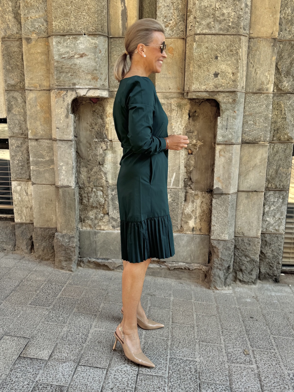 Beate mekko kuuluu suosittuun Antoinett mekko sarjaan. Mekossa on hieman venemallinen kaula-aukko. Olkapäillä on muutama vekki ja hihat ovat pitkät. Hihansuissa on kauniit luumu/kultaiset napit. Mekon sivuissa on taskut. Mekko on vartalonmyötäinen ja siro ylhäältä ja vyötärön jälkeen mekon helma levenee kevyesti alaspäin ja helmassa on vekkikantti. Mekko ylettyy juuri polvien alapuolelle. Katalla on mekosta päällä koko XS.