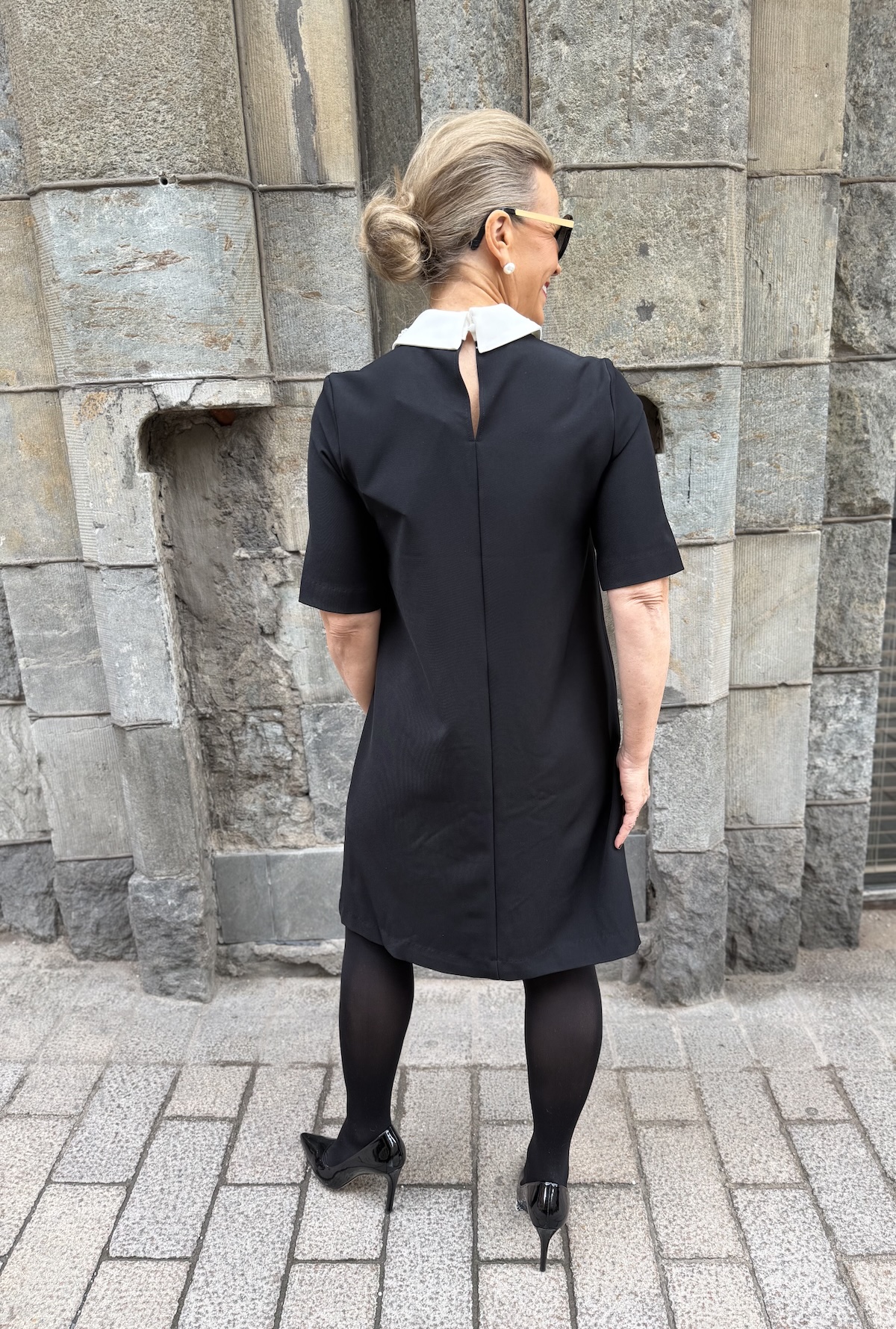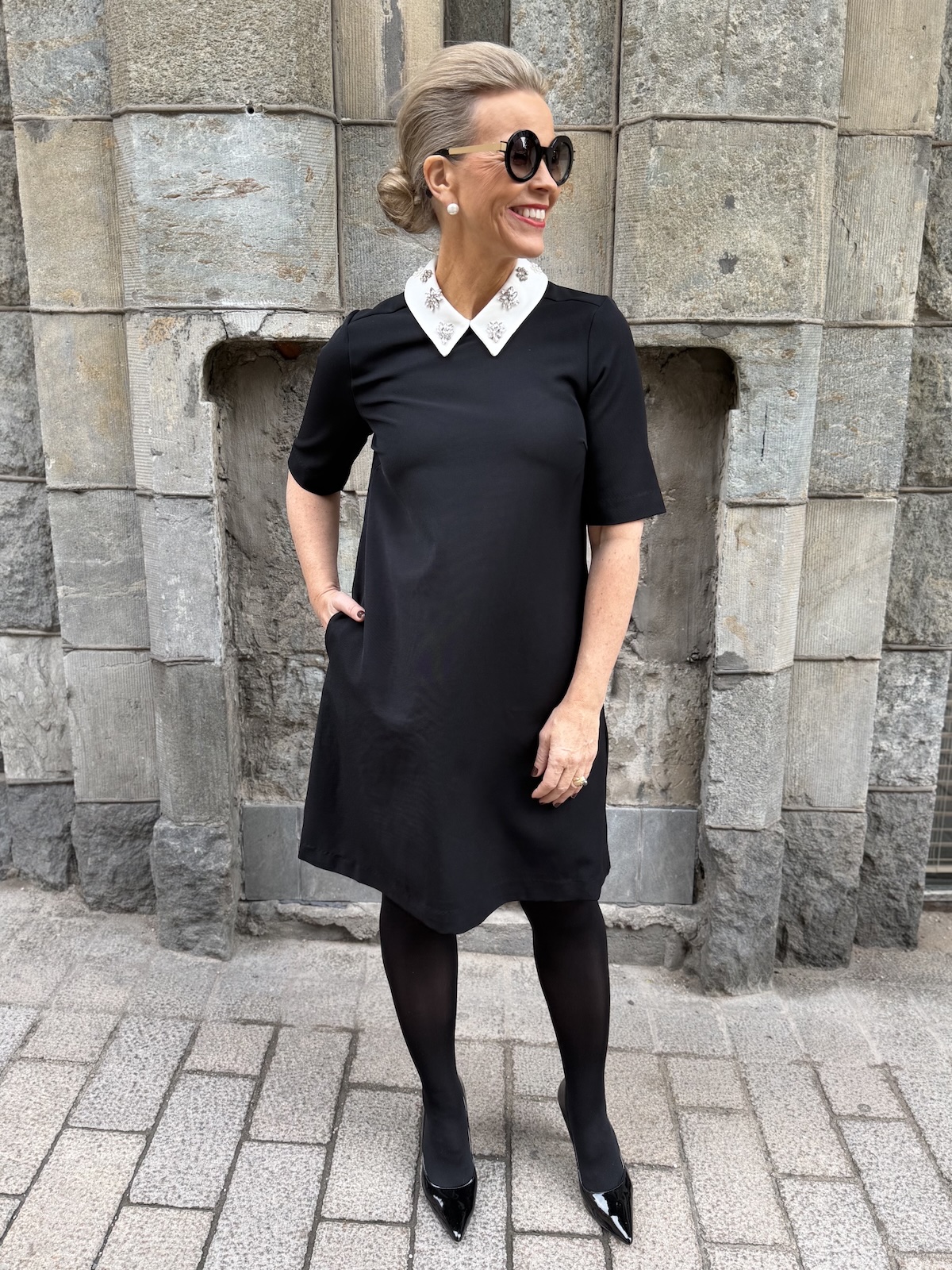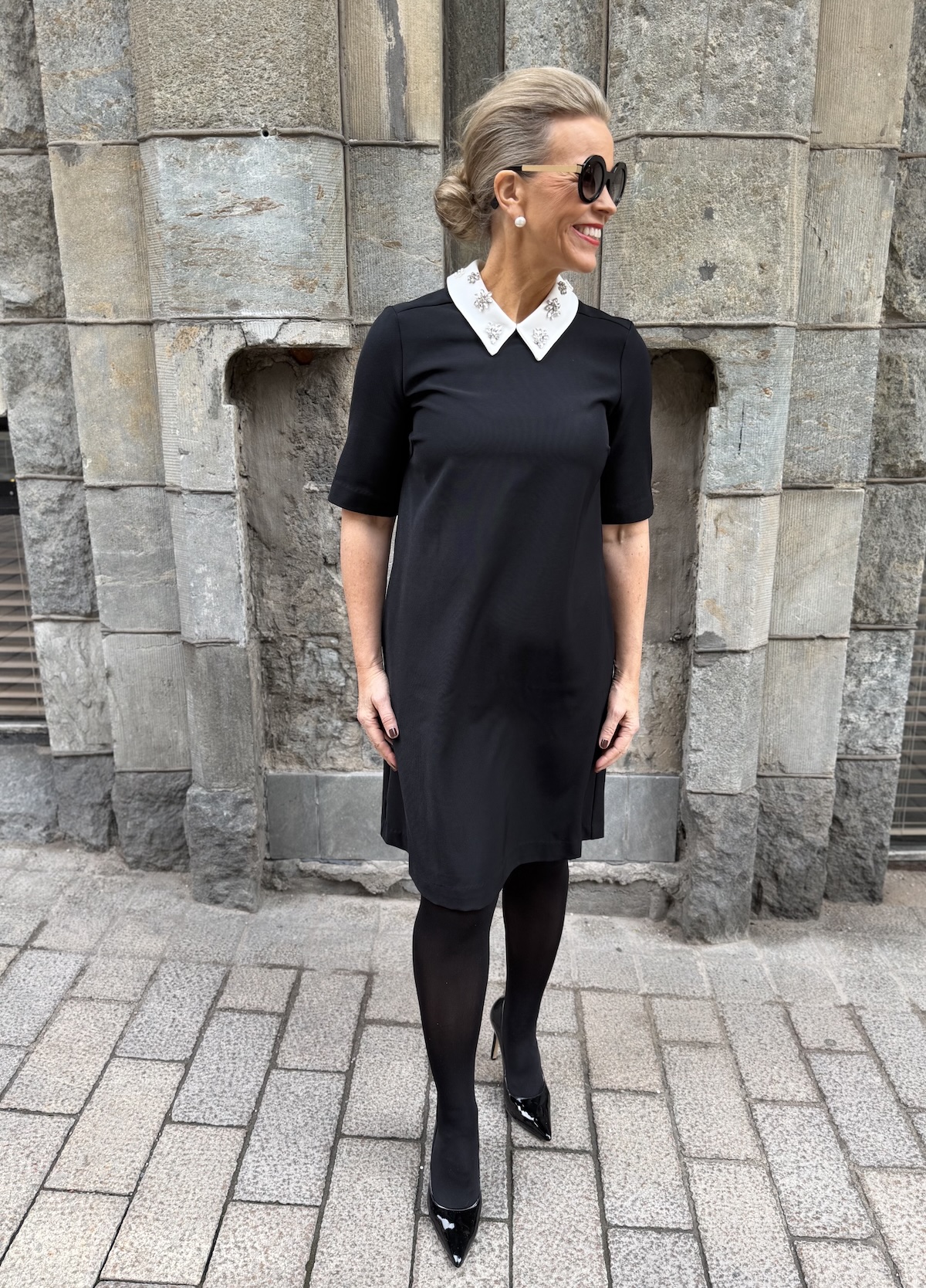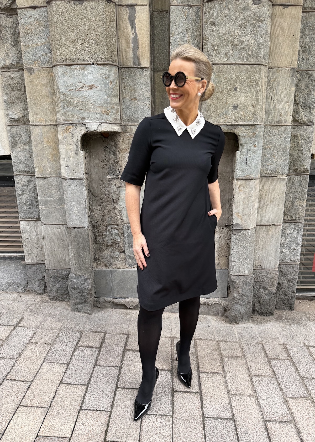 Belle Clara on super söpö mekko. Mekossa on ripaus 60-luvun henkeä. Mekossa on valkoiset kaulukset, joissa on kauniita strassikoristeita. Hihat ylettyvät kyynerpäiden yläpuolelle ja niskassa on nappi. Mekko on kevyesti A-linjainen eli se levenee alaspäin ja loppuu juuri polvien alapuolelle. Mekon sivuissa on taskut. Katalla on mekosta päällä koko XS.