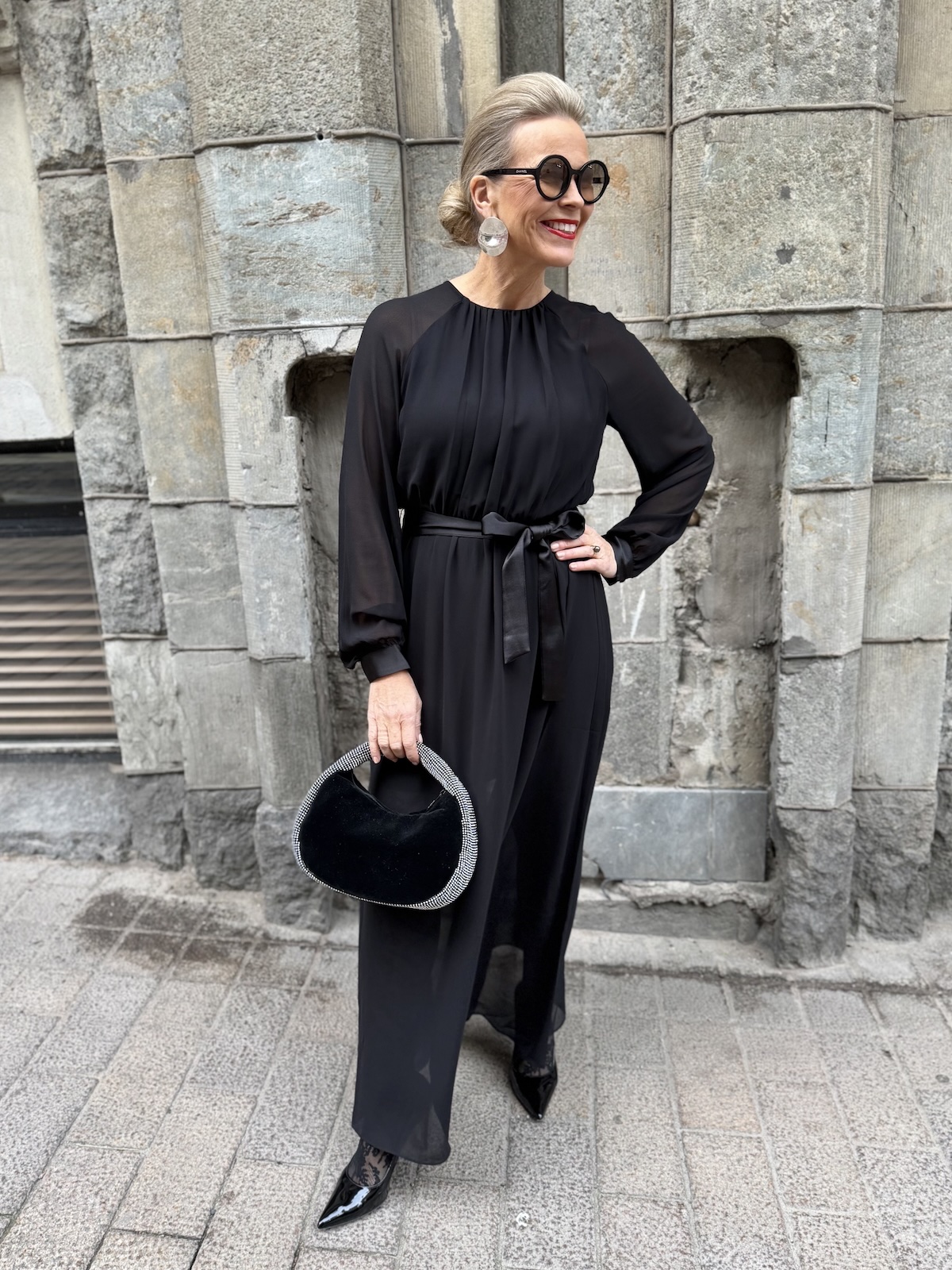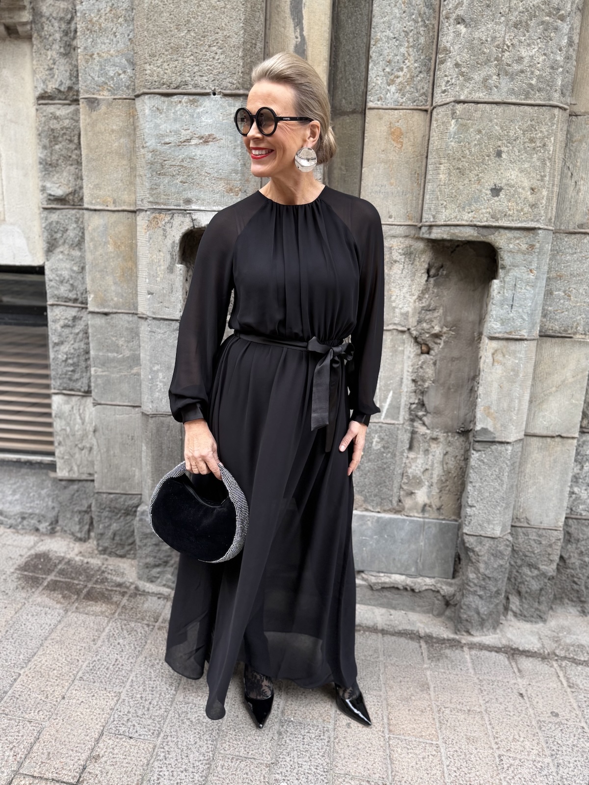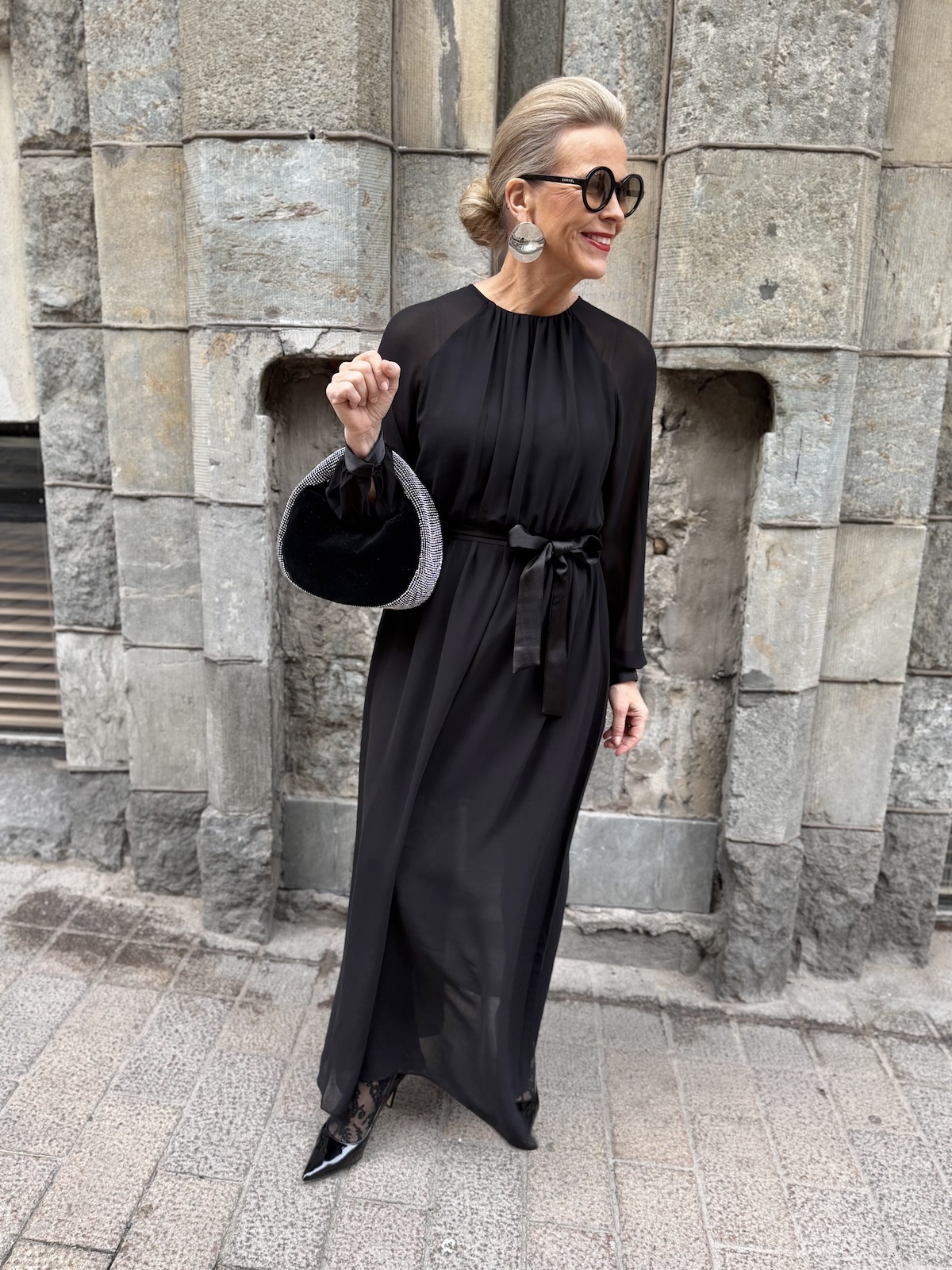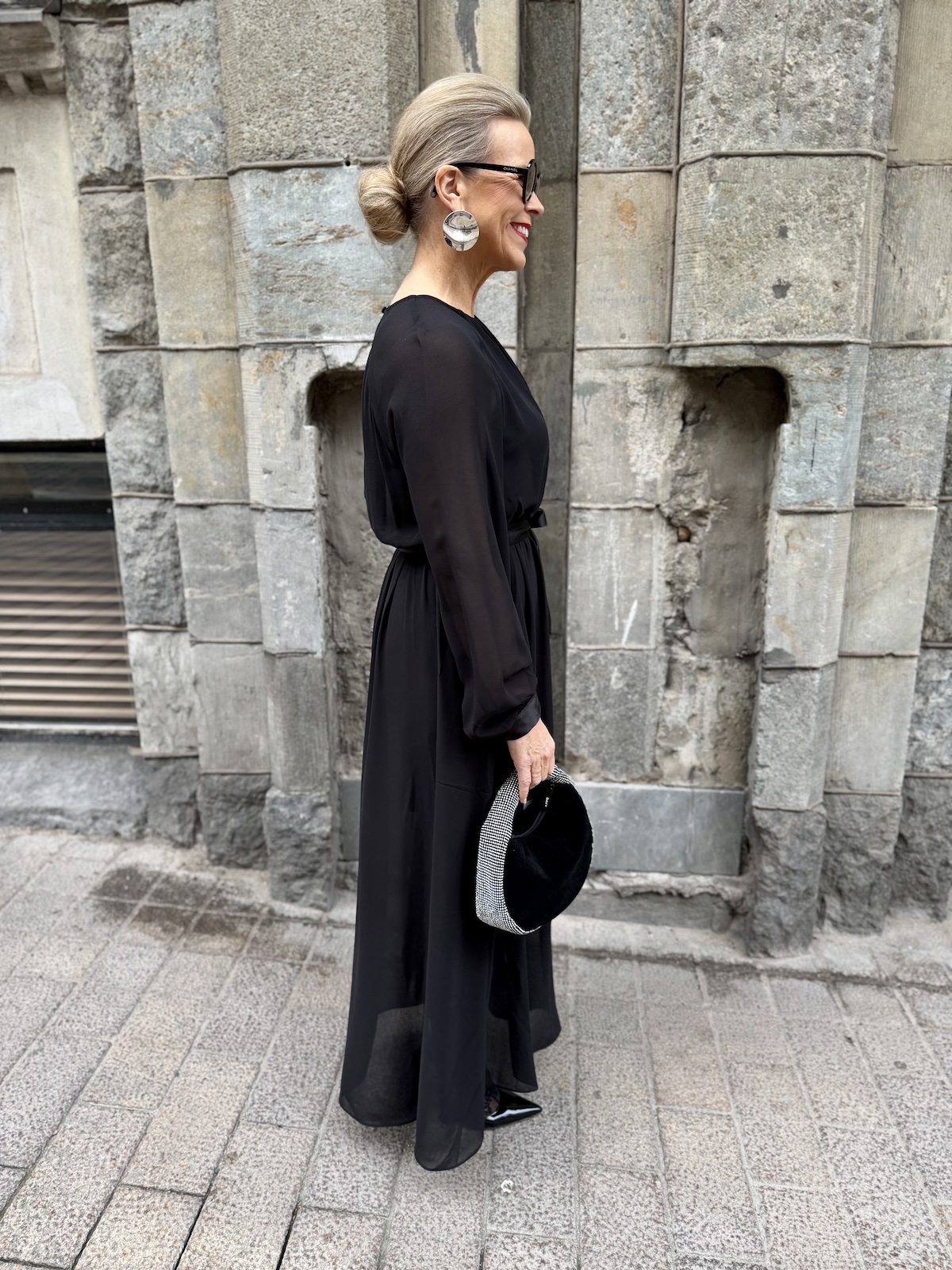 Daria on upea, selkeä ja tyylikäs maximekko niin ja ajaton. Mekossa on O-kaula-aukko ja kaula-aukon edessä on muutamia vekkejä. Mekon niskassa on nappi ja halkio. Hihat ovat raglan malliset ja vuorettomat eli läpikuultavat. Mekon edessä ja takana on vuori. Hihansuissa on satiinirannekkeet ja mekon vyö on myös satiininen. Mekon vuori ylettyy noin polvien kohdalle eli mekon alaosa on myös vuoreton ja kevyemmän oloinen. Vyötäröllä on ohut, joustava kuminauha, jonka päälle kietaistaan vyö. Katalla on mekosta päällä koko 34. Mekko on reiluhkoa kokoa.