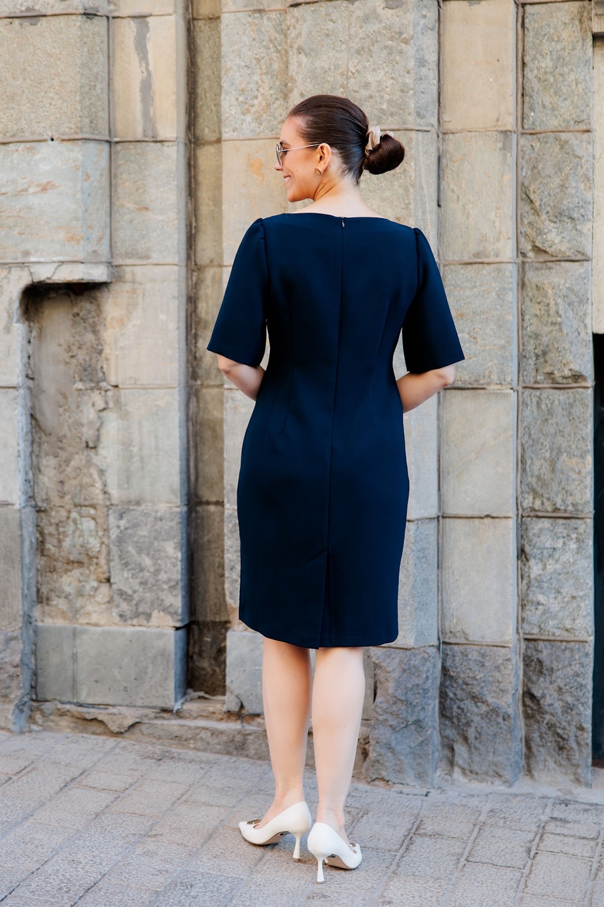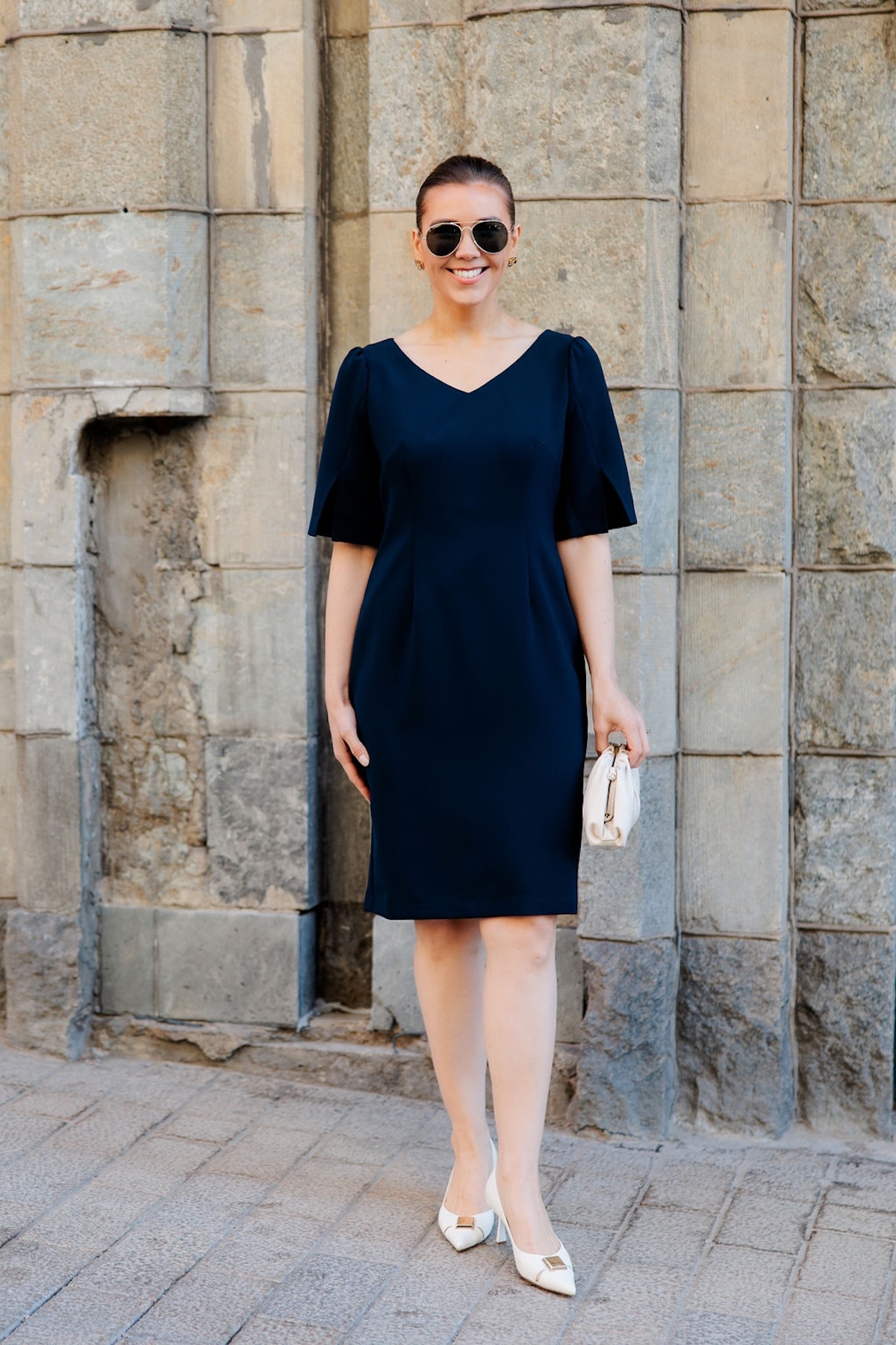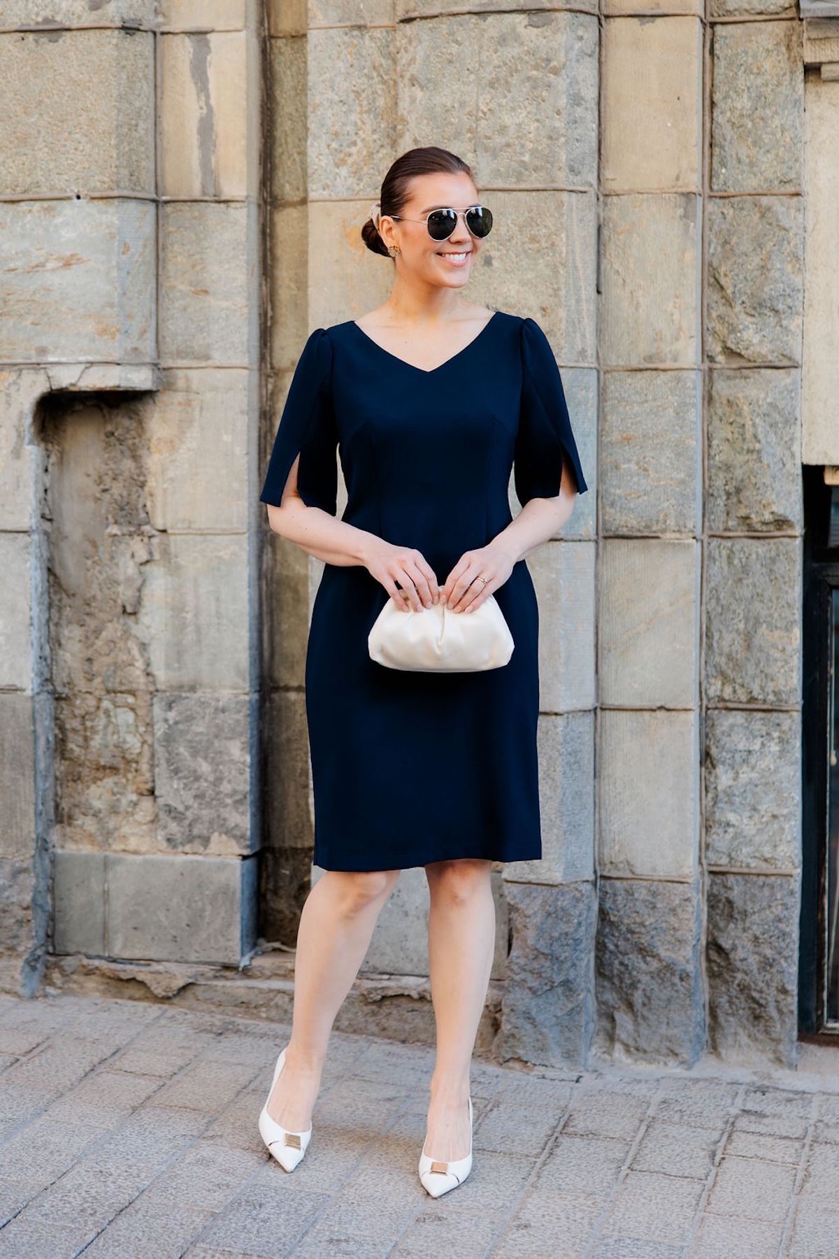 Doppwoman Penelope mekko on upea mekko. Mekossa on V-kaula-aukko ja hihat ylettyvät kyynerpäiden kohdalle. Hihoissa on halkiot, jotka keventävät koko mekon lookkia. Mekossa on sisäänotot edessä ja takana ja helmaosa kapenee naisellisesti alaspäin ja loppuu juuri polvien alapuolelle. Takana on halkio. Katalla on mekosta päällä koko S ja Gabilla on koko M. Kata on 163 cm pitkä ja Gabi on 170 cm pitkä.