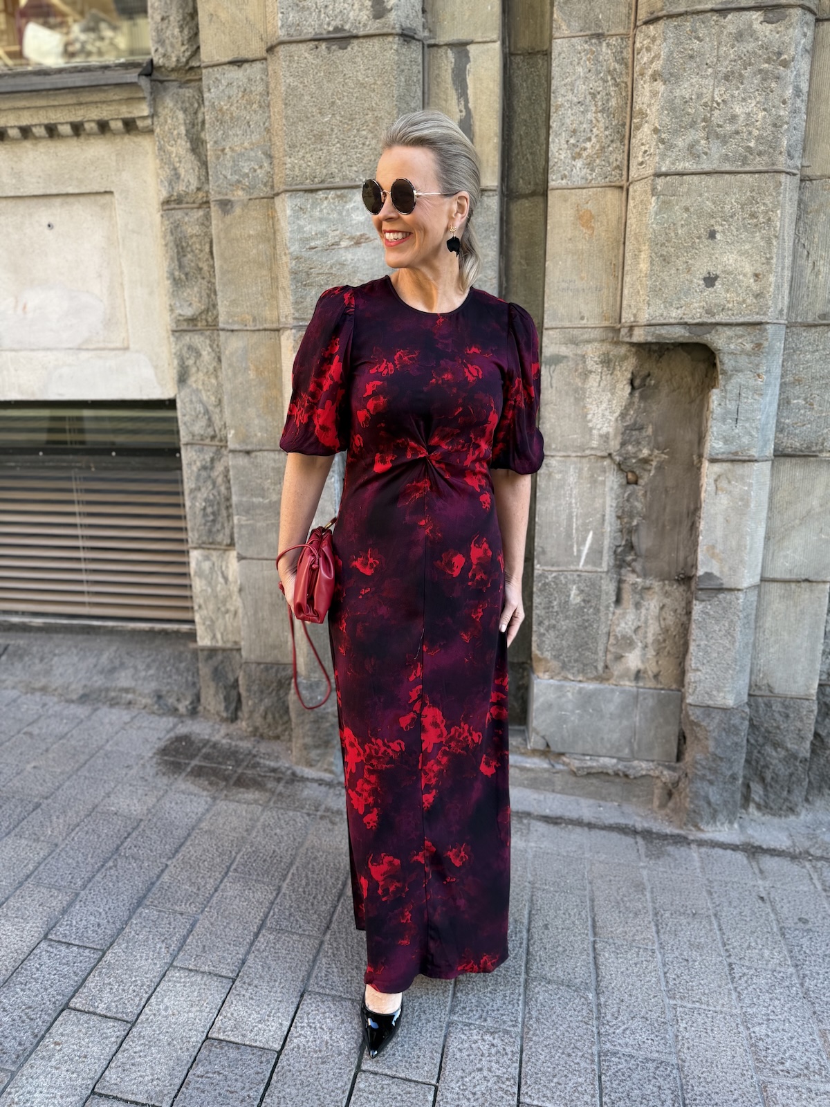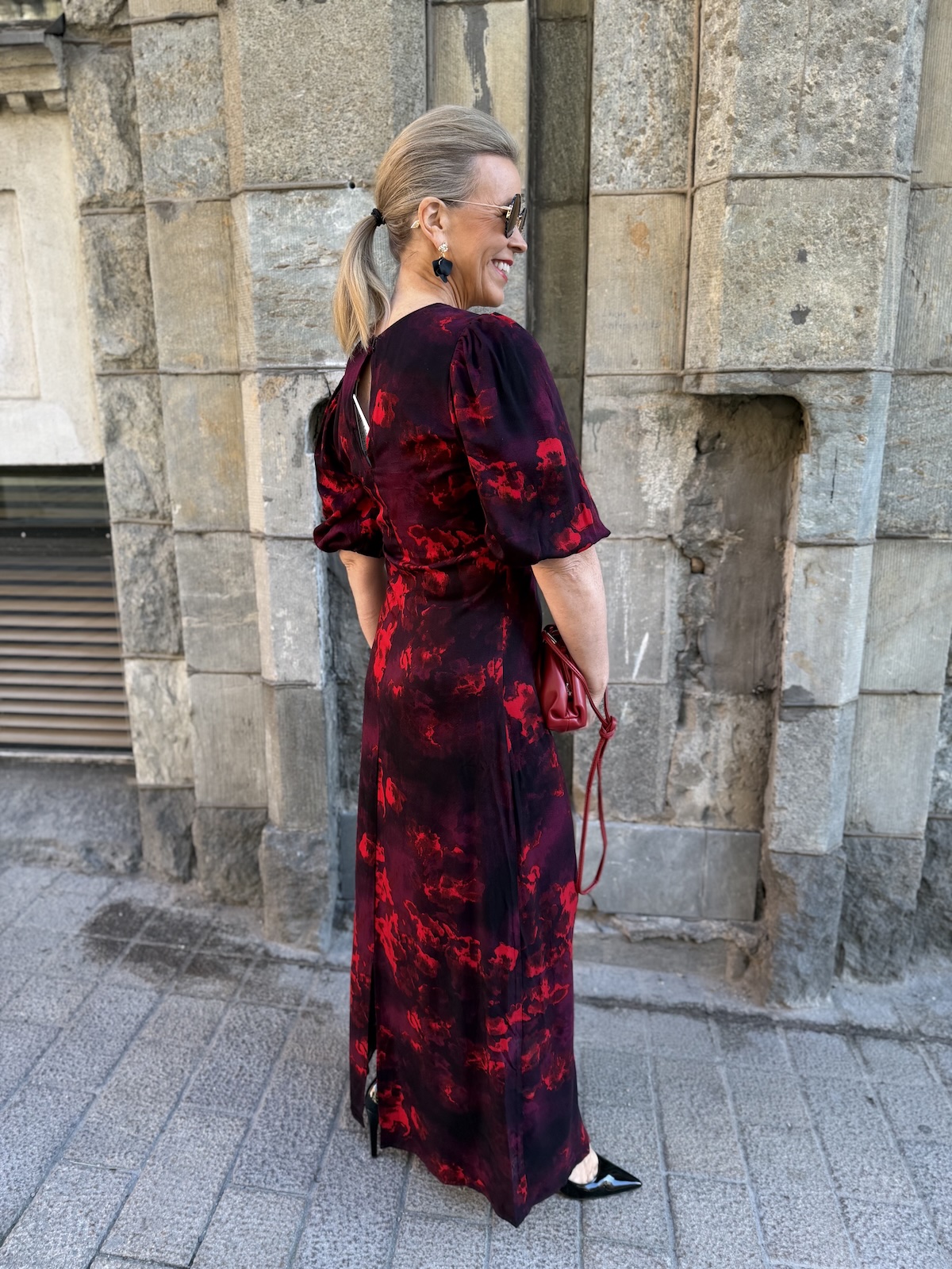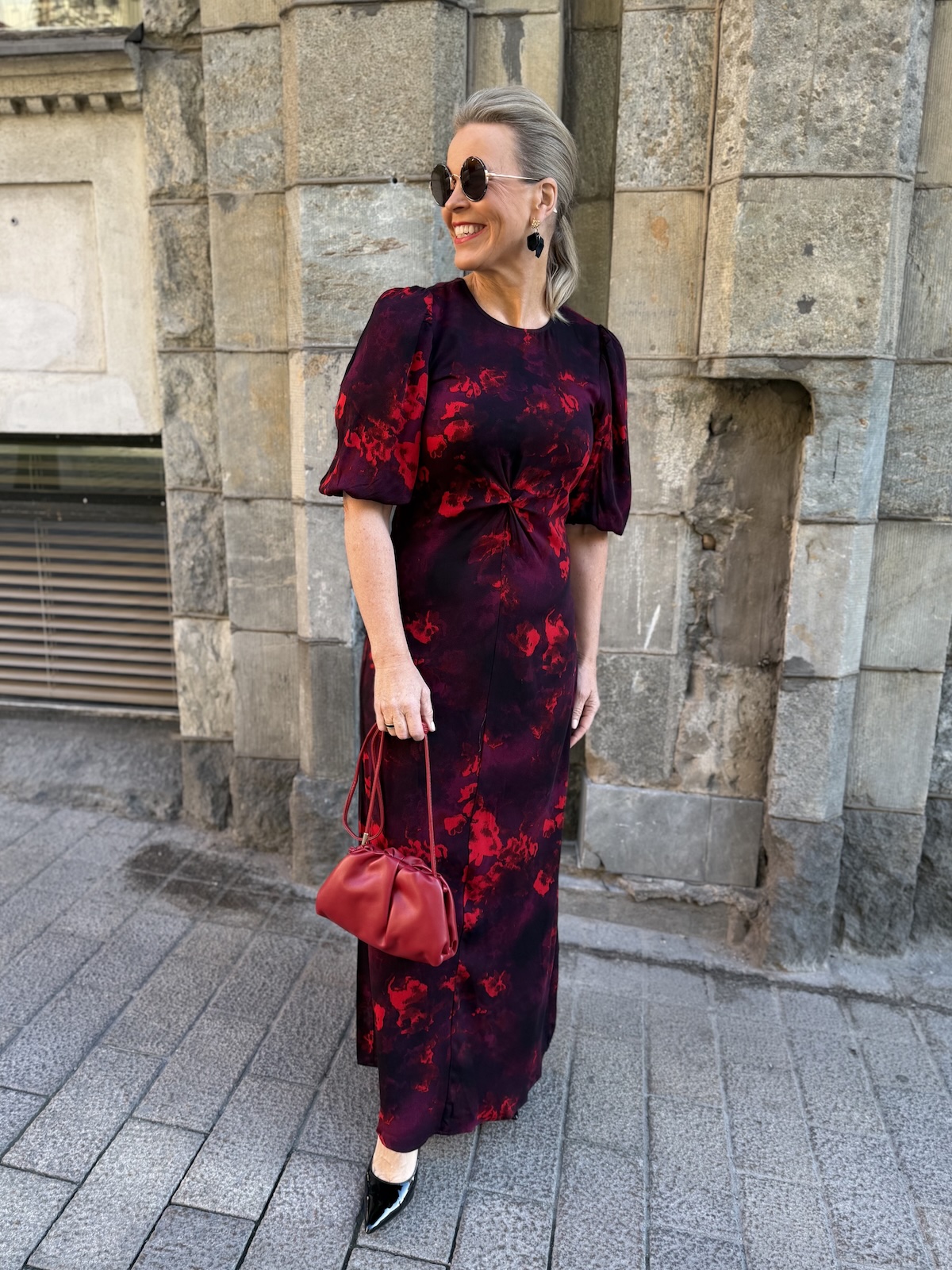 Elsie mekko on upea! mekossa on O-kaula-aukko ja niskassa on halkio ja nappi eli mekko puetaan yläkautta päälle. Mekossa on pussimaiset hihat ja ne ylettyvät kyynerpäiden kohdalle. Edessä vyötärön kohdalla onpieni rypytys, joka onkin loistava vyötärölle. Mekko on vartalonmyötäinen lantion kohtaan saakka, jonka jälkeen helma levenee kevyesti alaspäin ja loppuu nilkkojen/jalkapöydän päälle. Katalla on mekosta päällä koko XS.