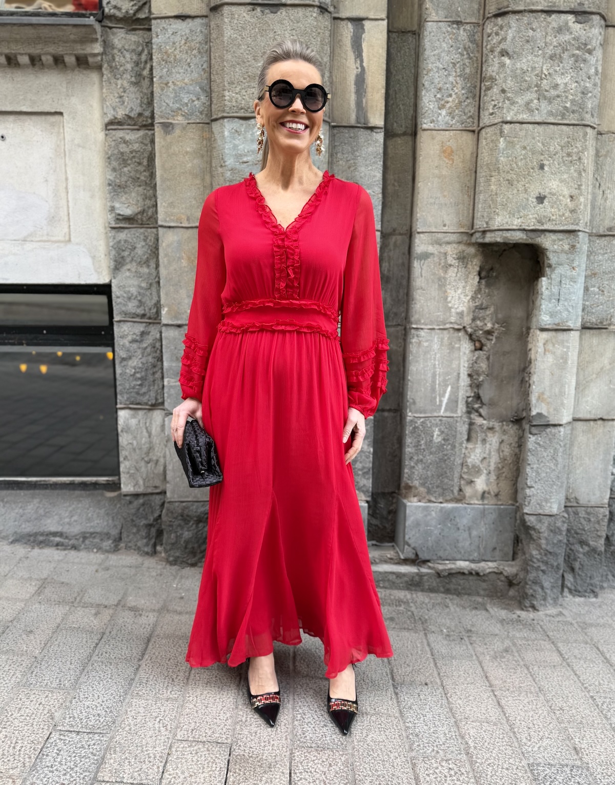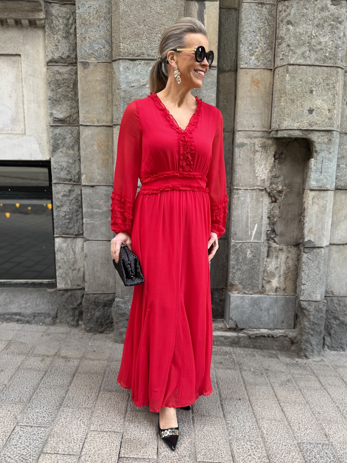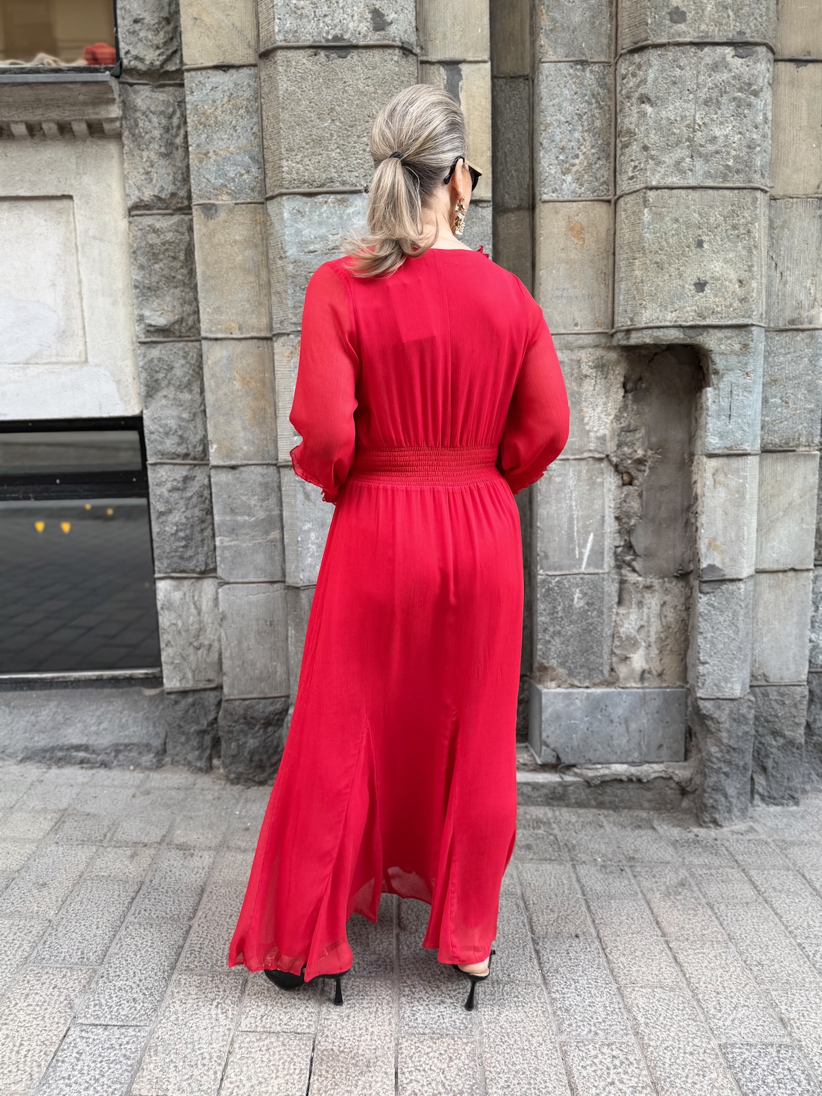 Findira on upea maximekko! Mekossa on kaunis V-kaula-aukko ja hiha ovat täyspitkät. Vyötärön kapeimmalla kohtaa on leveählö kantti ja kantin jälkeen helmaosa levenee kevyesti alaspäin ja loppuu nilkkojen kohdalle. Kauluksen reunassa, edessä ja hihansuissa on kapeaa fyrrykanttia. Selkäpuolella on joustvaa kumilankarypytystä. Mekon edessä ja takana on vuori, hihat ovat vuorettomat. Mekko vastaa normaalia kokoa.