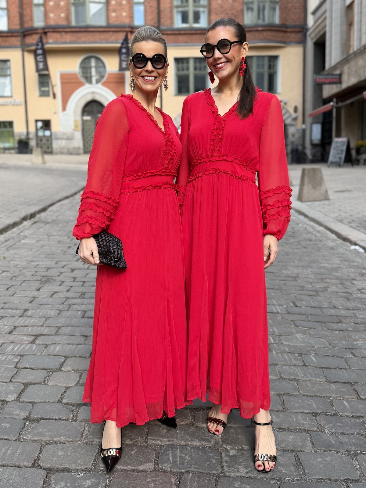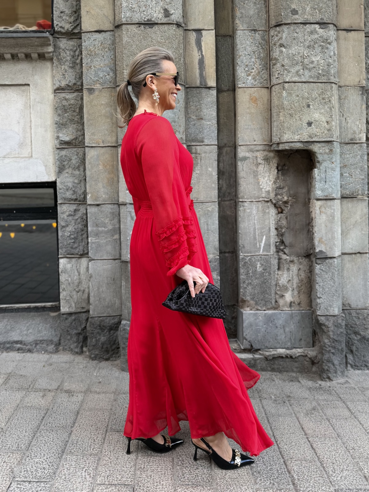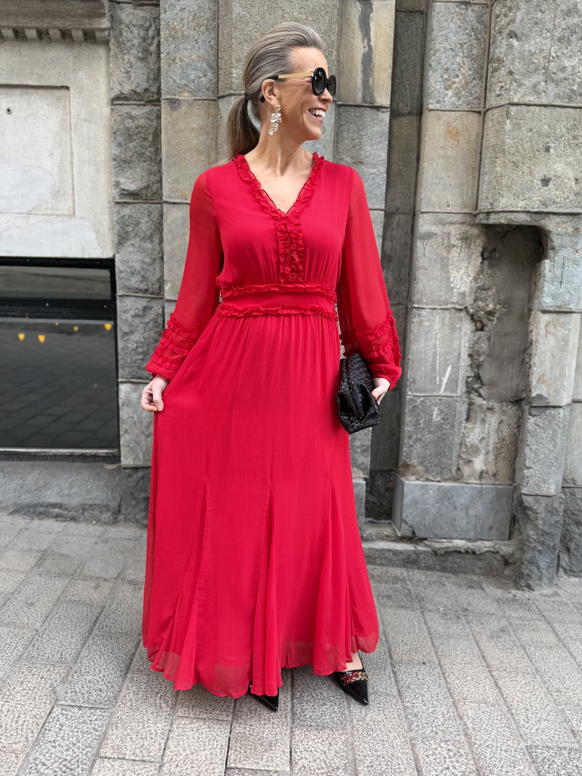 Findira on upea maximekko! Mekossa on kaunis V-kaula-aukko ja hiha ovat täyspitkät. Vyötärön kapeimmalla kohtaa on leveählö kantti ja kantin jälkeen helmaosa levenee kevyesti alaspäin ja loppuu nilkkojen kohdalle. Kauluksen reunassa, edessä ja hihansuissa on kapeaa fyrrykanttia. Selkäpuolella on joustvaa kumilankarypytystä. Mekon edessä ja takana on vuori, hihat ovat vuorettomat. Mekko vastaa normaalia kokoa.