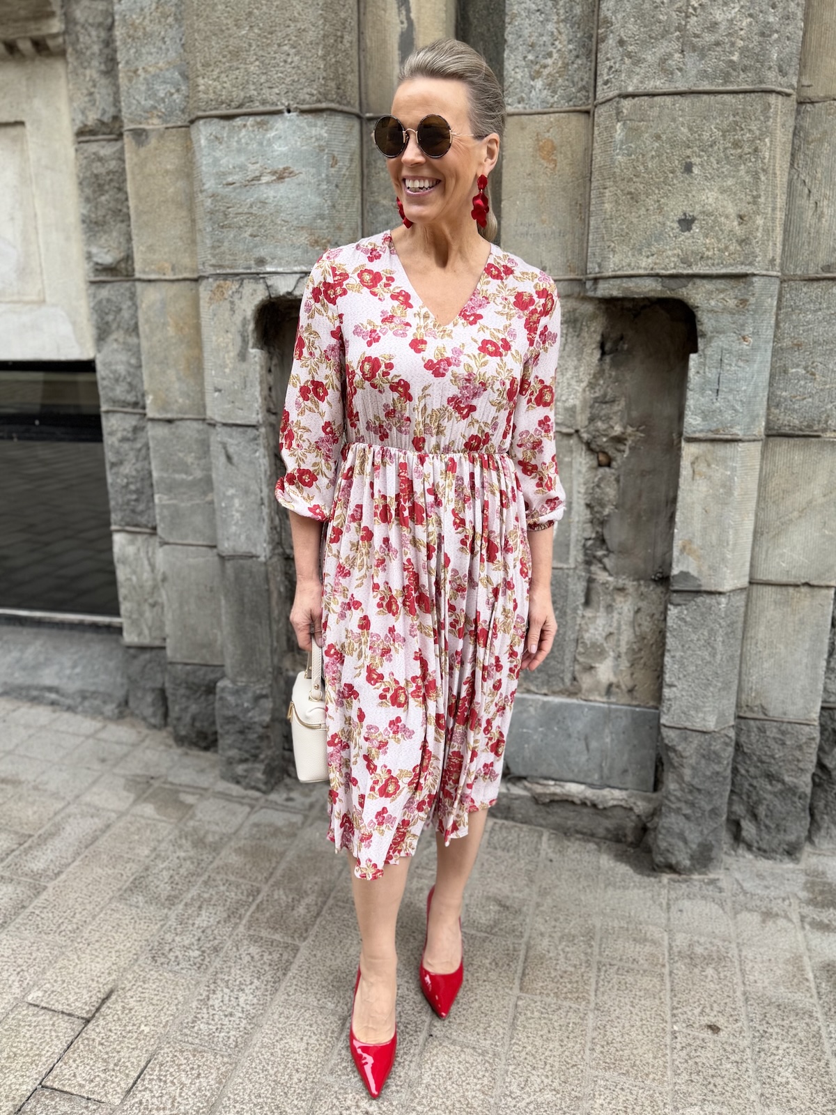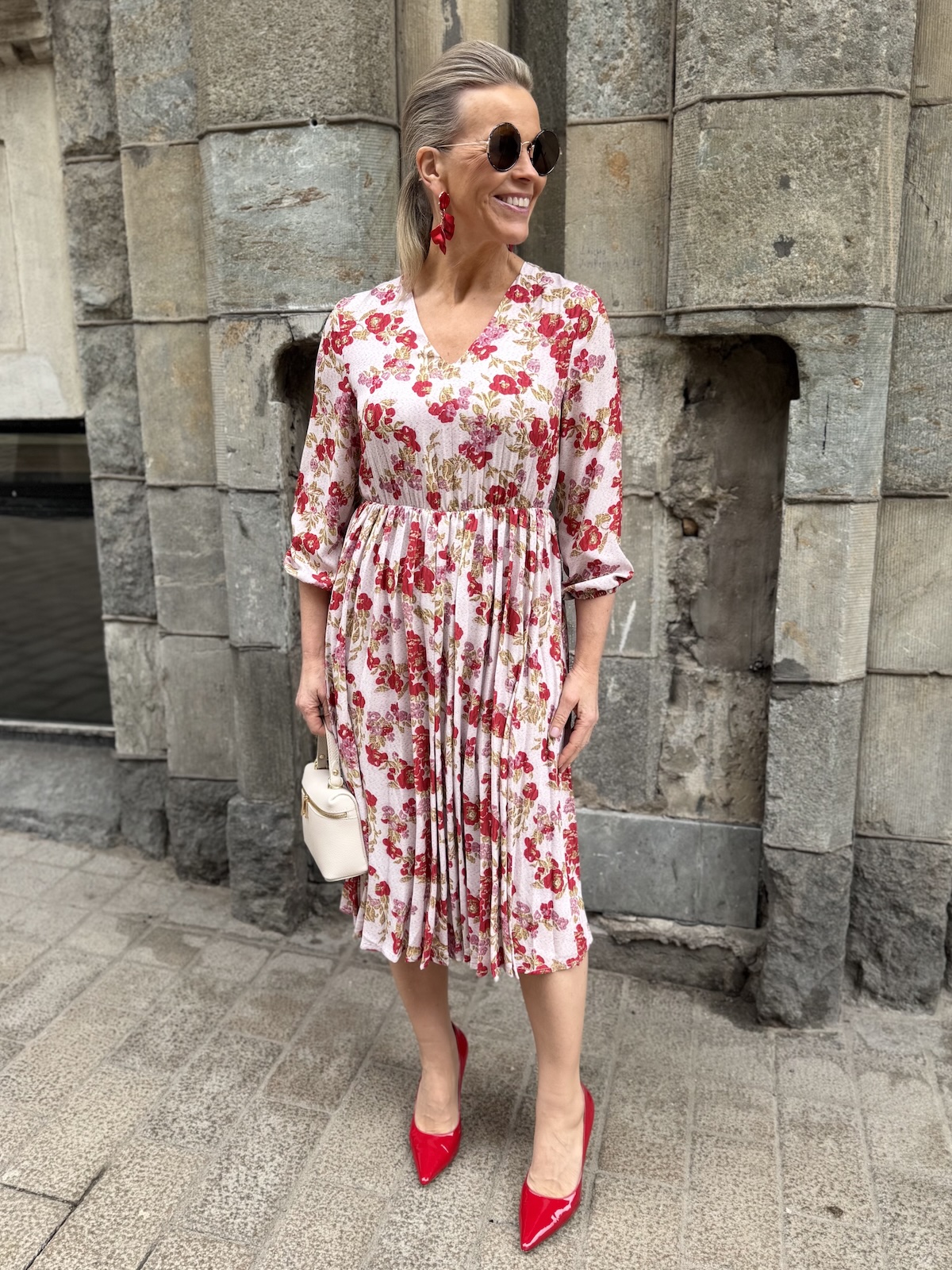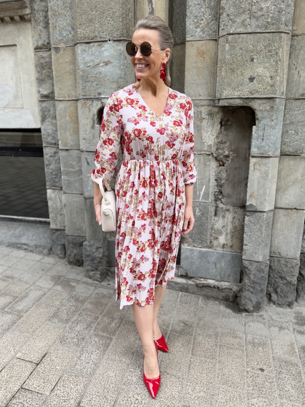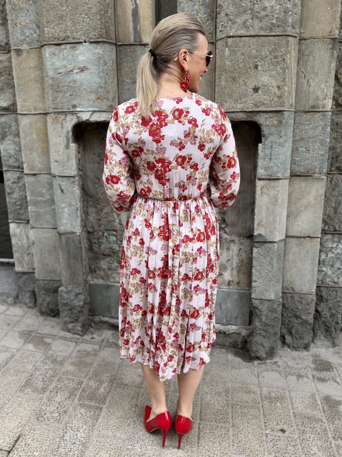 Jenna kukkamekko on söpö mekko, joka toimii myös arkimekkona. Mekossa on hailakan rosa pohjasävy ja punaiset kukat, joista löytyy myös kullansävyjä. Mekossa on V-kaula-aukko ja puolipitkät hihat, joidenka hihansuissa on kuminauhat. Vyötärön kapeimmalla kohtaa on poikkileikkaus ja joustava kuminauha. Helmaosa on plisemallinen ja kevyesti alaspäin levenevä. Mekko loppuu polvien alapuolelle. Katalla on mekosta päällä koko XS, mekko joustaa.