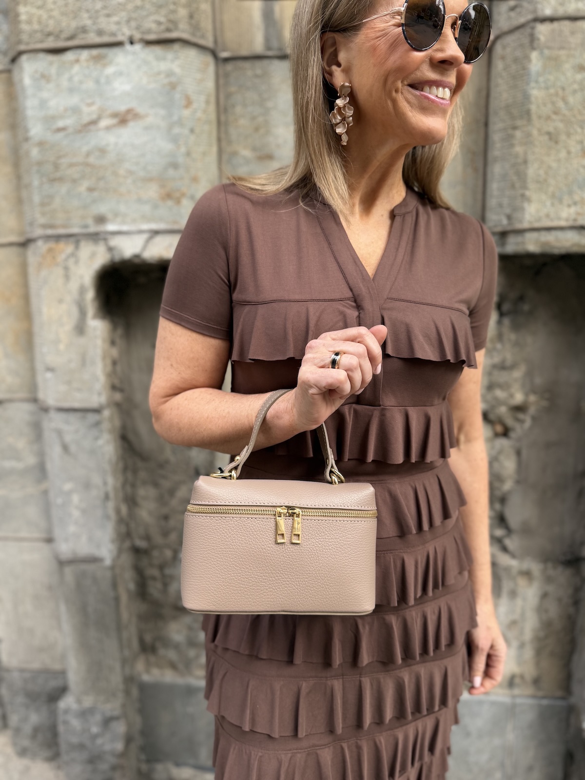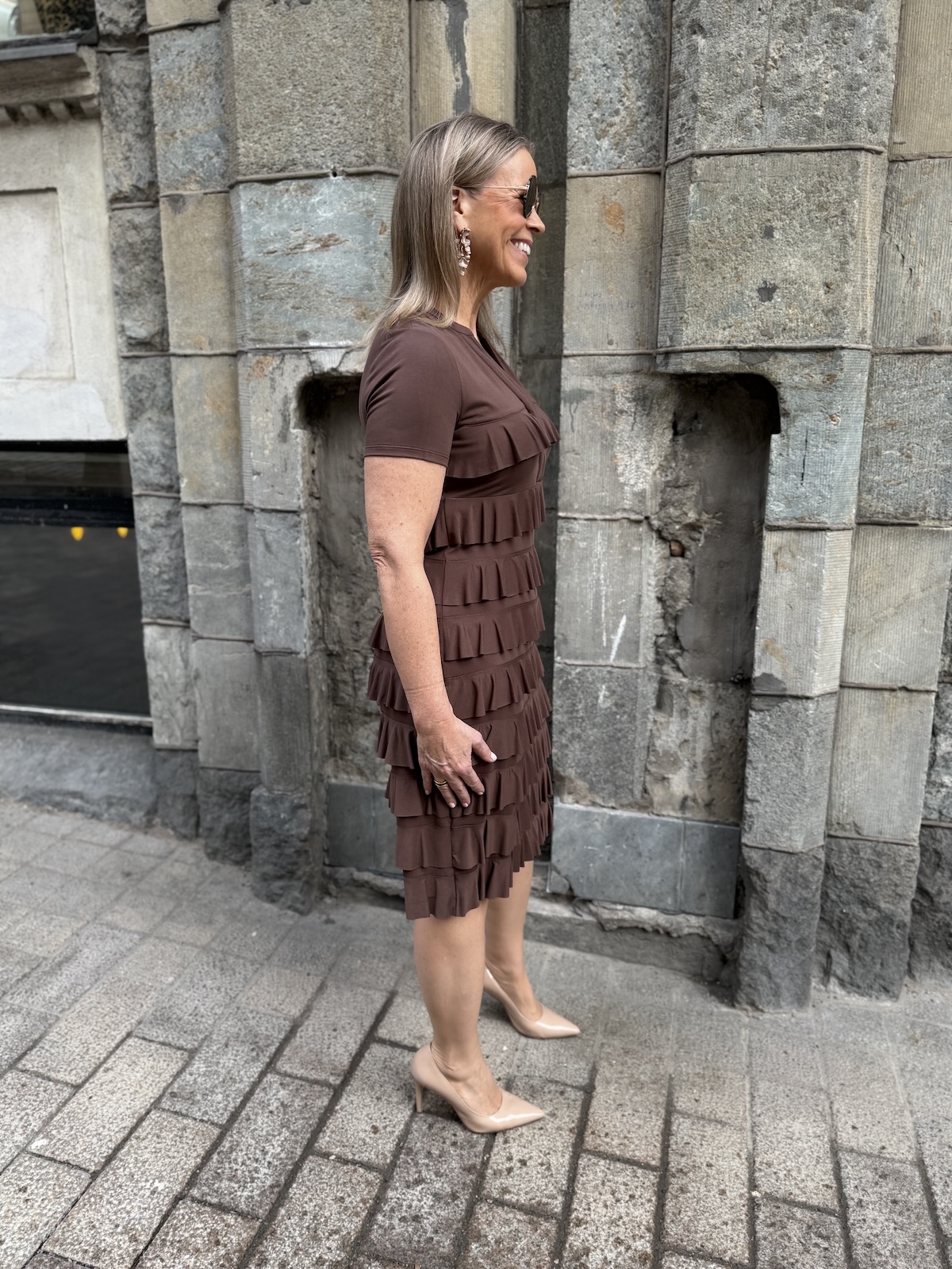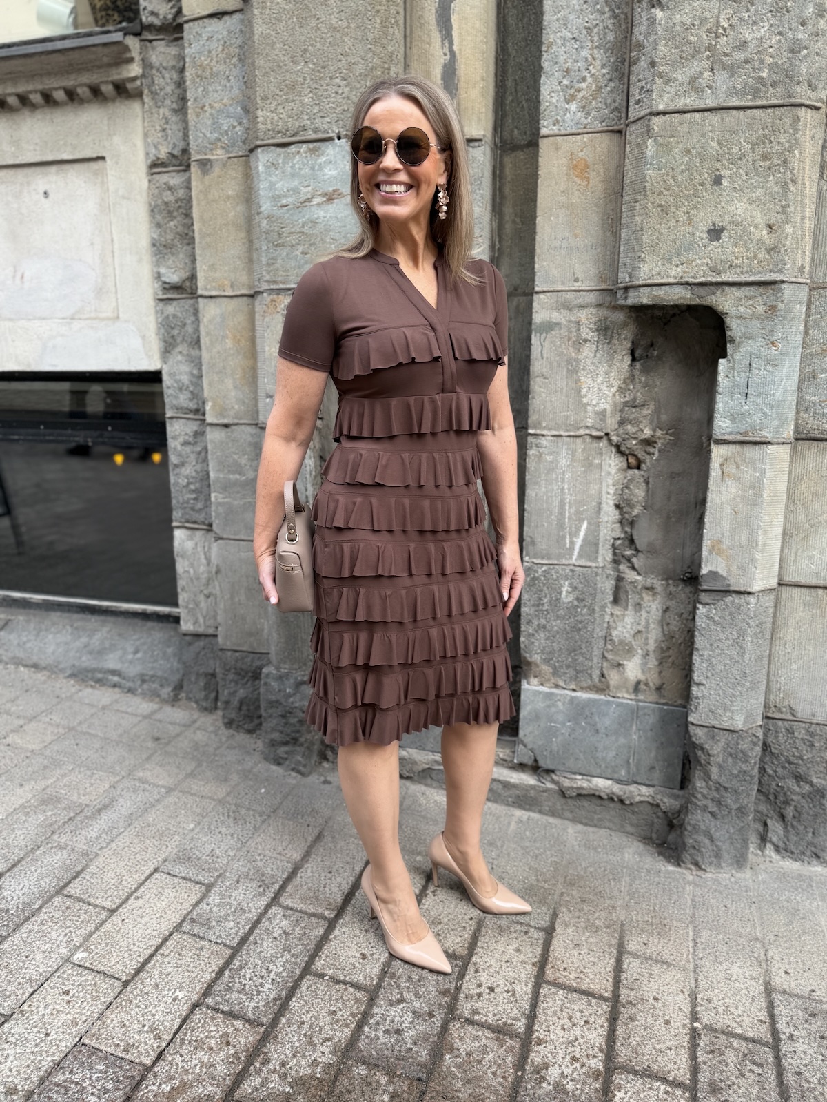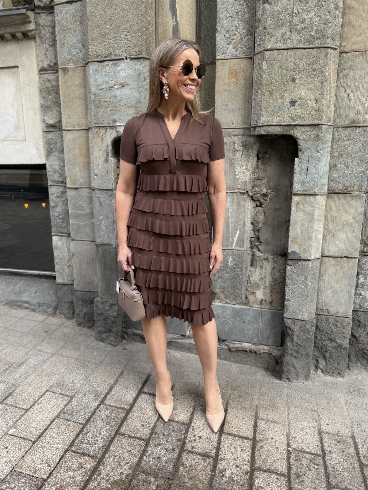 Jolaf salsamekko on kerrassaan loistava vartalolle ja ennen kaikkea se on ihana päällä, kun se joustaa. Mekossa on V-kaula-aukko ja kauluksessa on listan alla muutama nappi. Hihat ovat lyhkäiset. Mekko on leikattu vartaloystävällisesti ja se loppuu polveen/polven alapuolelle. Mekossa on joustavia salsakantteja edessä ja takana. Mekko on joustavaa materiaalia eli mekosta ei tule ottaa liian isoa kokoa, muuten se ”roikkuu” päällä. Katalla on mekosta päällä koko XS. Alla oleviin mittoihin mekko venyy noin 6 cm lisää.
