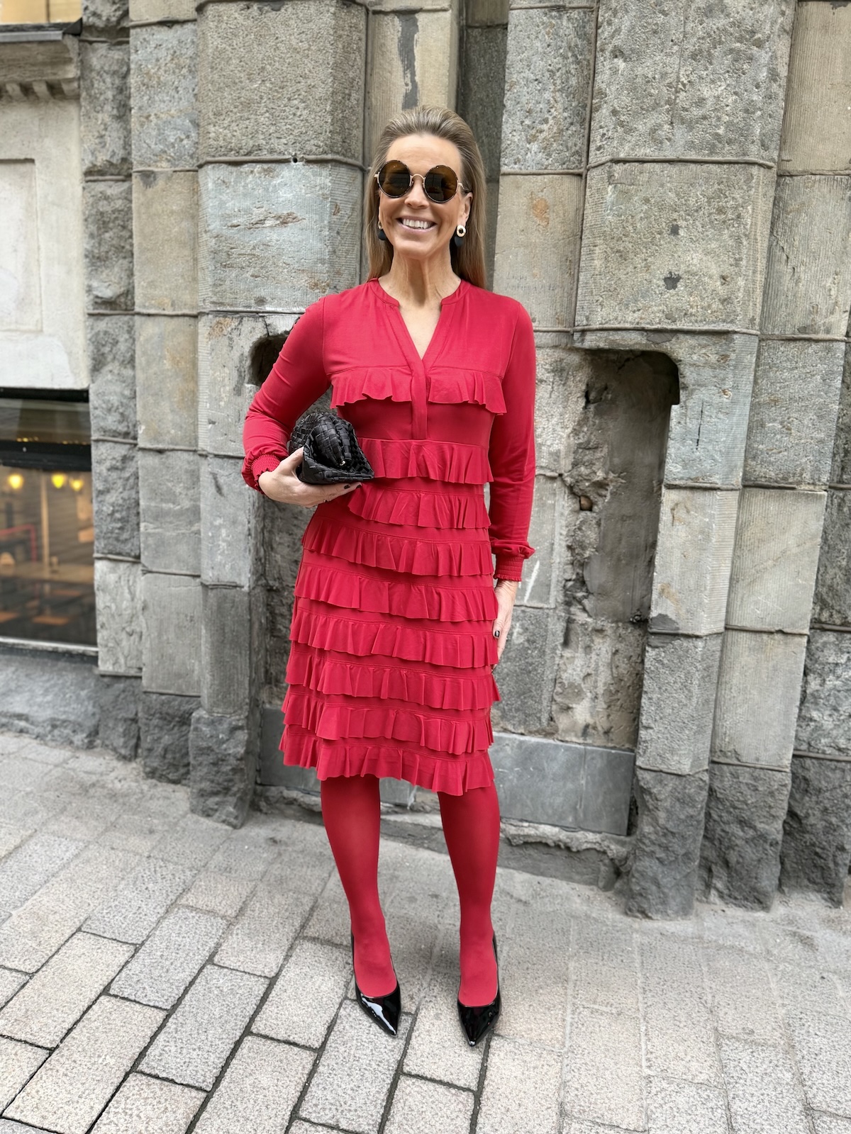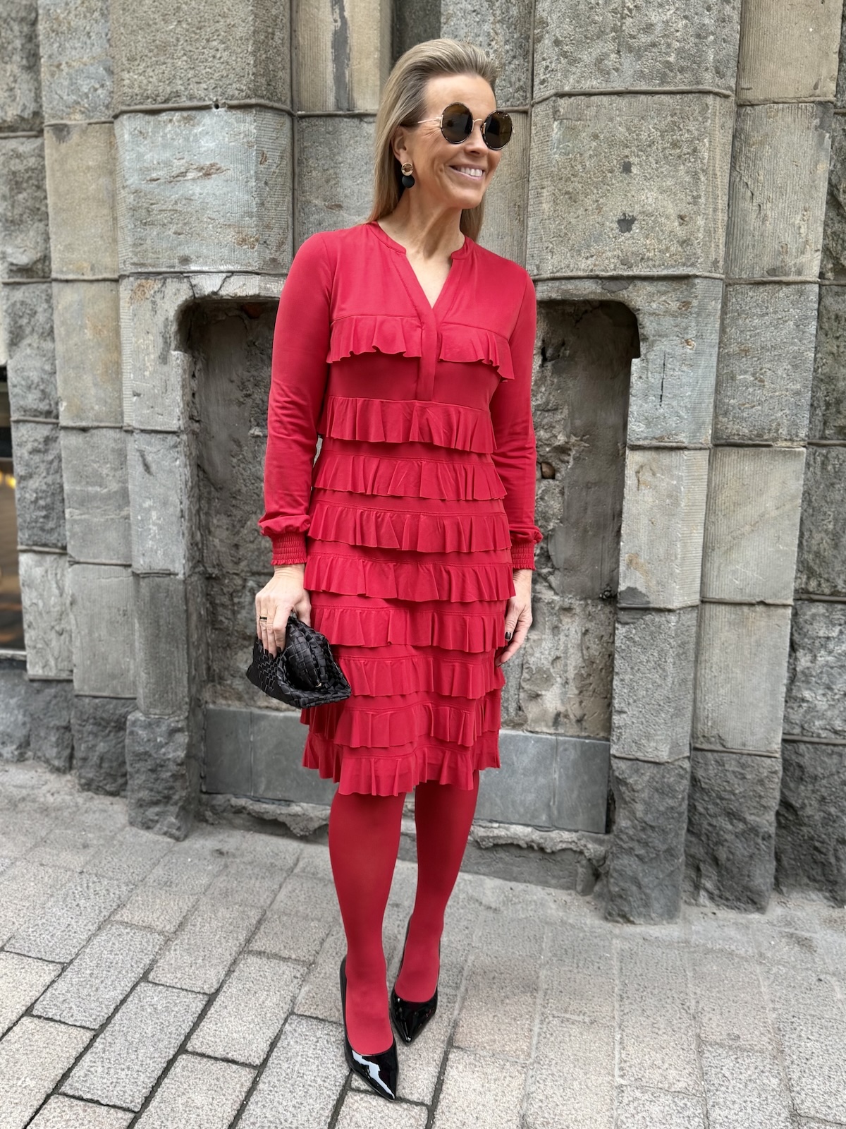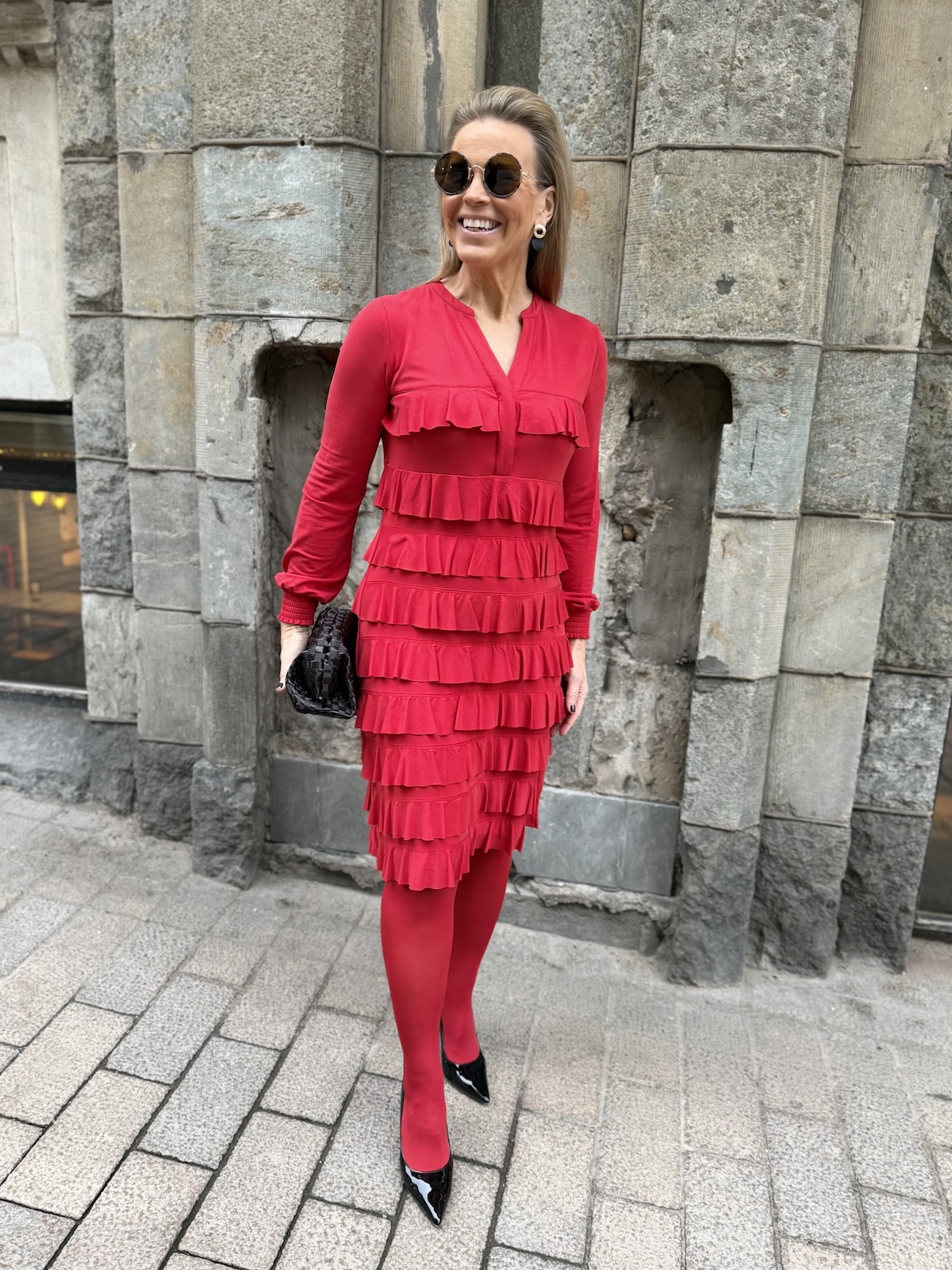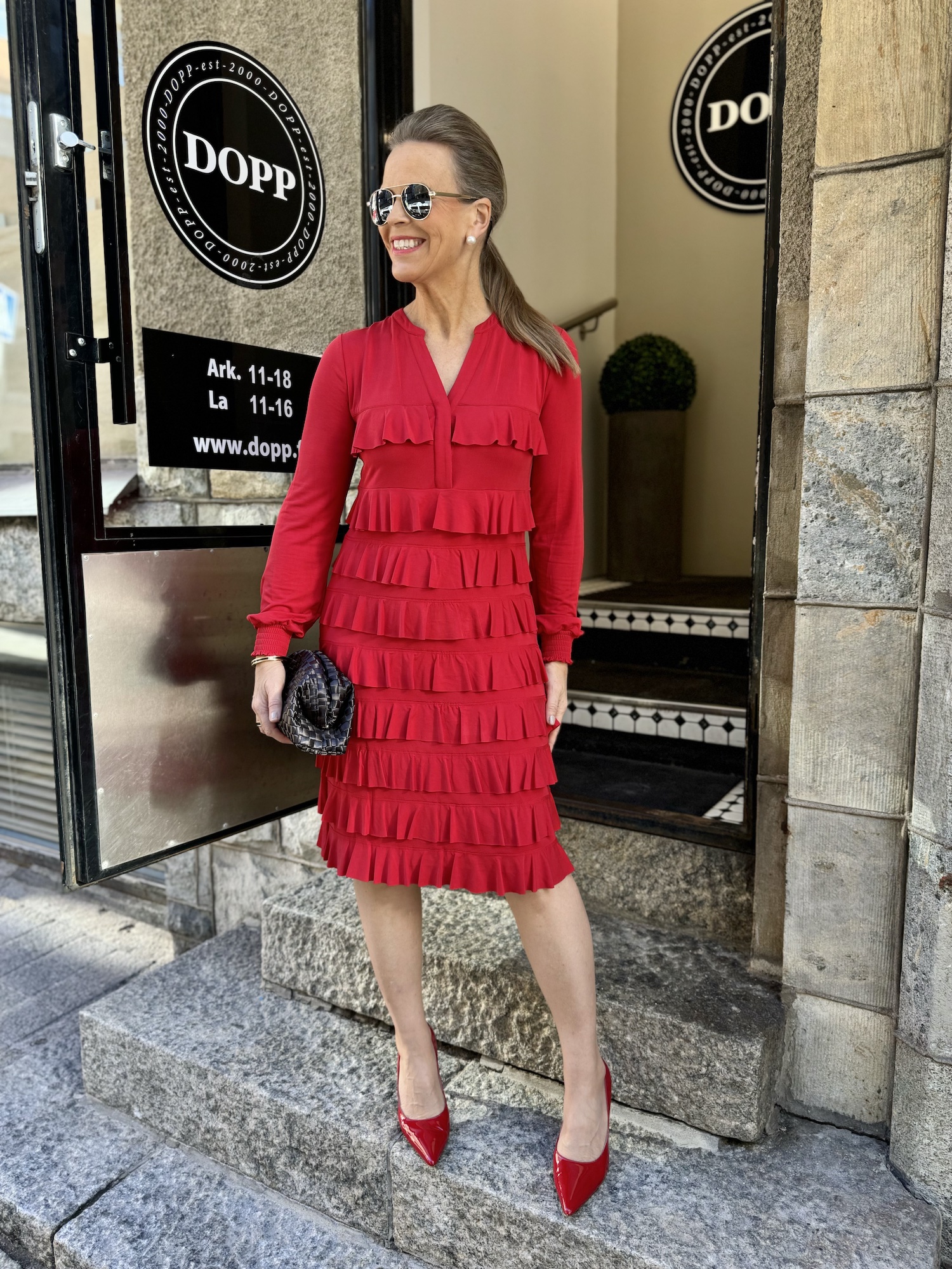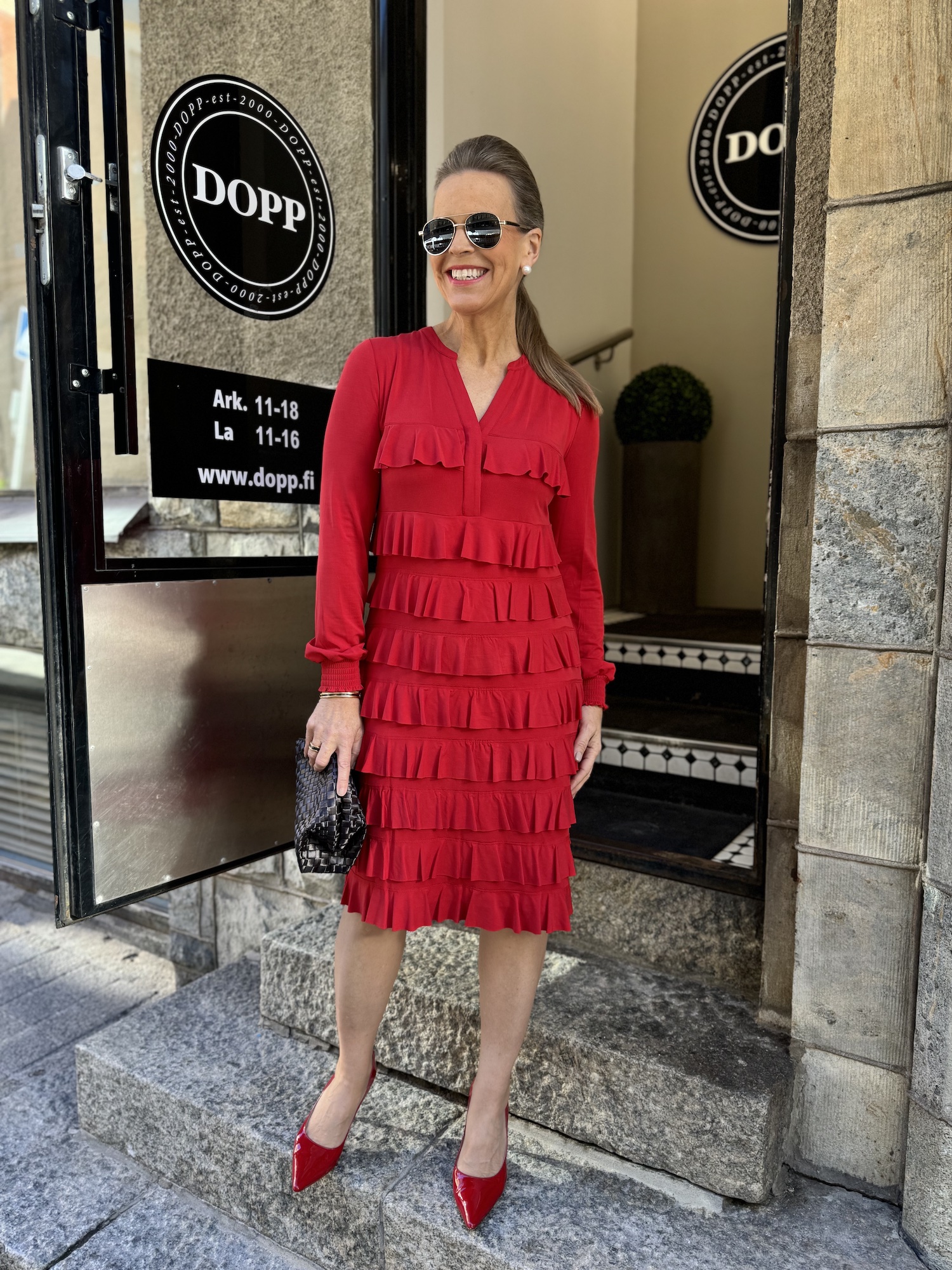 Kalaf salsamekko on kerrassaan loistava vartalolle ja ennen kaikkea se on ihana päällä, kun se joustaa. Mekossa on V-kaula-aukko ja kauluksessa on listan alla muutama nappi. Hihat ovat täyspitkät ja hihasuissa on joustava kuminauhavenyke. Mekko on leikattu vartaloystävällisesti ja se loppuu polveen/polven alapuolelle. Mekossa on joustavia salsakantteja edessä ja takana. Mekko on joustavaa materiaalia eli mekosta ei tule ottaa liian isoa kokoa, muuten se ”roikkuu” päällä. Katalla on mekosta päällä koko XS.