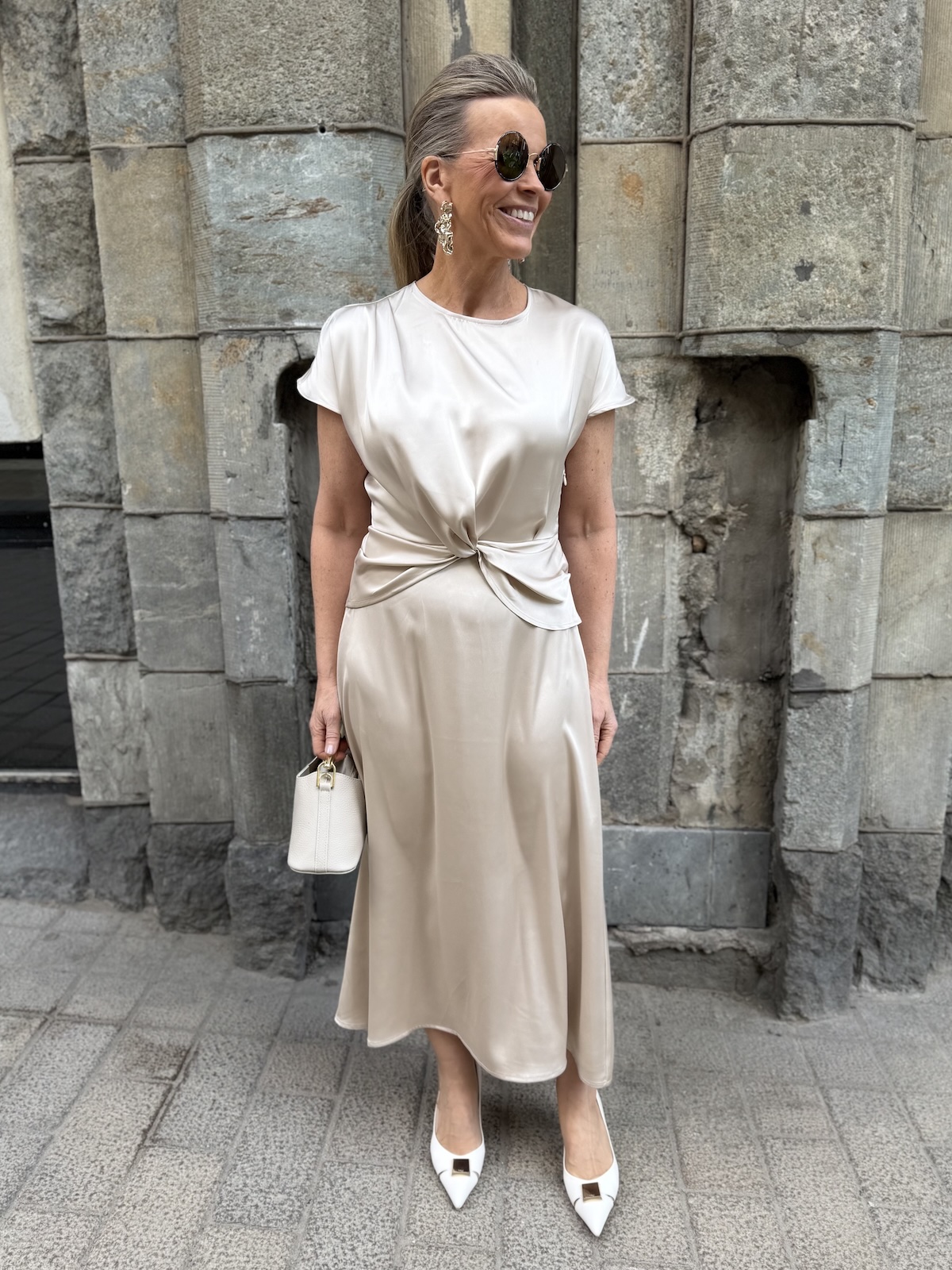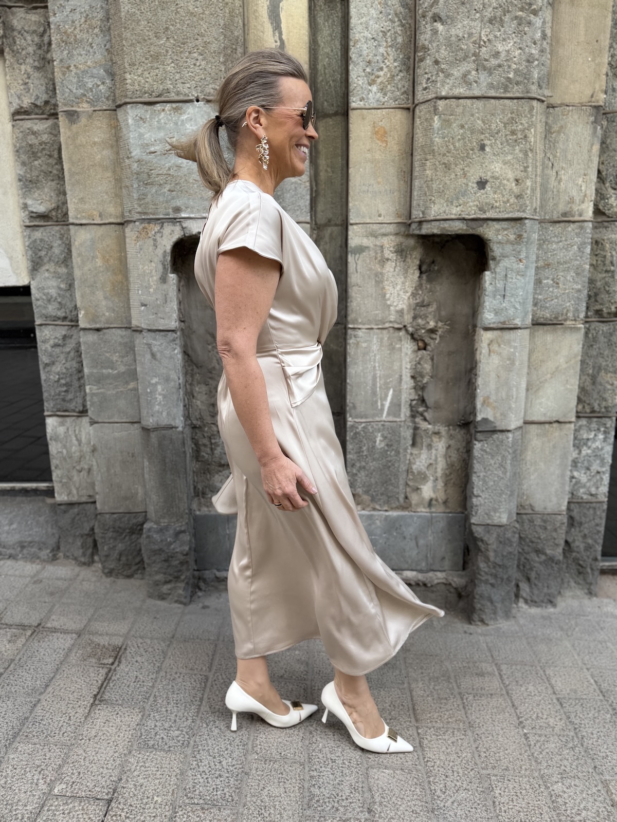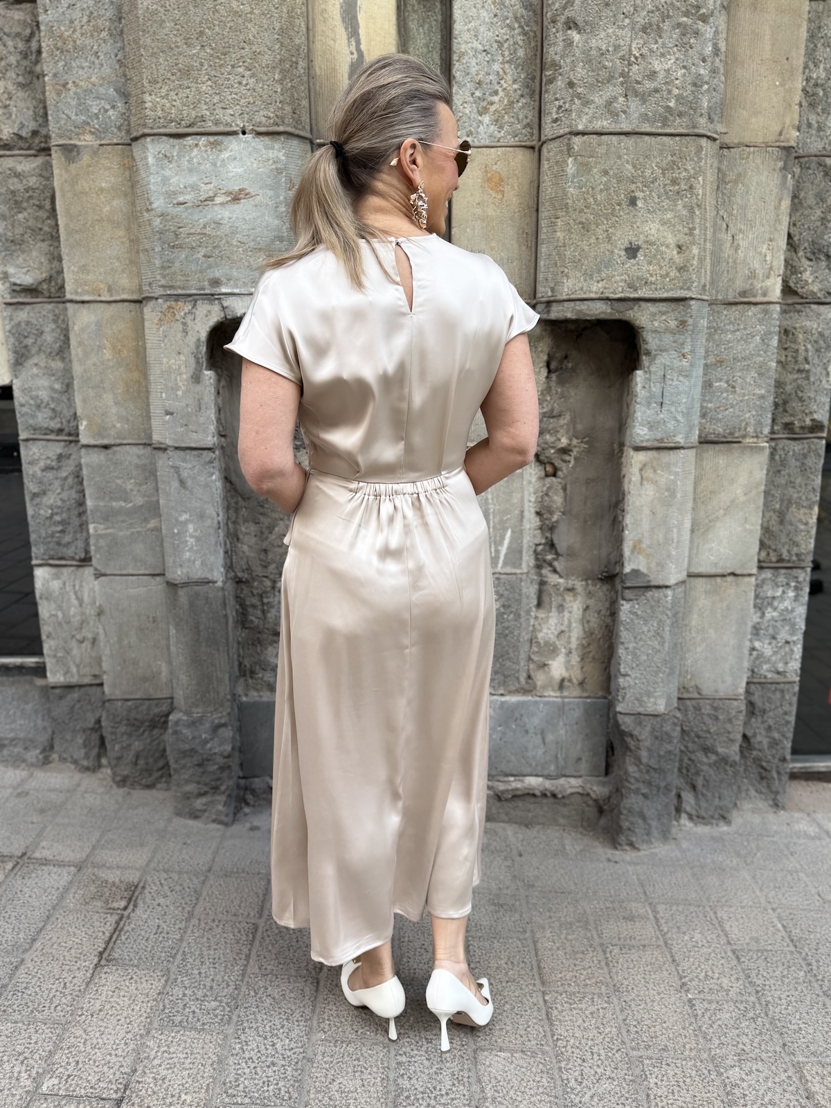 Lake fest midimekossa on todella kaunis malli. Mekossa on O-kaula-aukko ha hihat laskeutuvat reilusti olkapäiden alapuolelle. Mekon vyötäröllä on solmuke, jonka jälkeen mekko levenee alaspäin ja loppuu nilkkojen kohdalle. Mekon sivussa on vetoketju ja niskassa on nappi. Selkäpuolella, vyötärön kohdalla on kuminauha venyke. Katalla on mekosta päällä koko 34. Mekko vastaa normaalia kokoa ja vyötärö joustaa takana olevan kuminauhan johdosta noin 6 cm alla oleviin mittoihin.