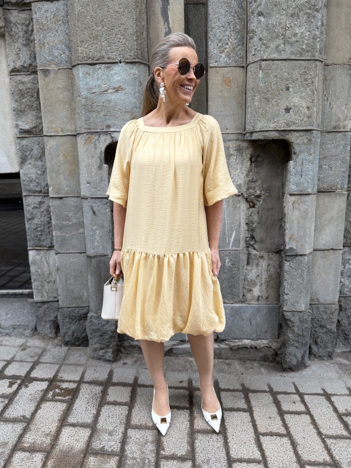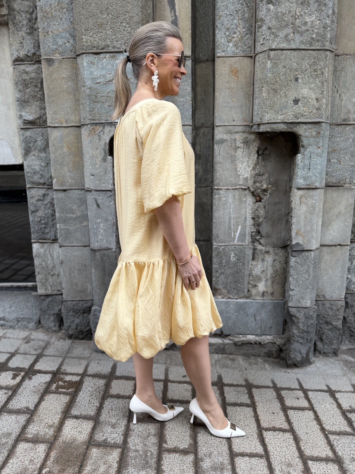 Lyla Fest mekko on kevyt ja kepeä. Mekossa on neliönmallinen kaula-aukko sekä edessä että takana. Mekossa on pussimaiset hihat, jotka ylettyvät kyynerpäiden kohdalle. Mekossa on lantiolle laskettu poikkileikkaus ja helmaosa on pussimainen ja ylettyy juuri polvien alapuolelle. Katalla on mekosta päällä koko 34.