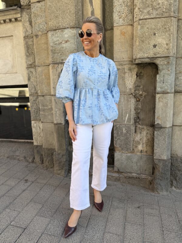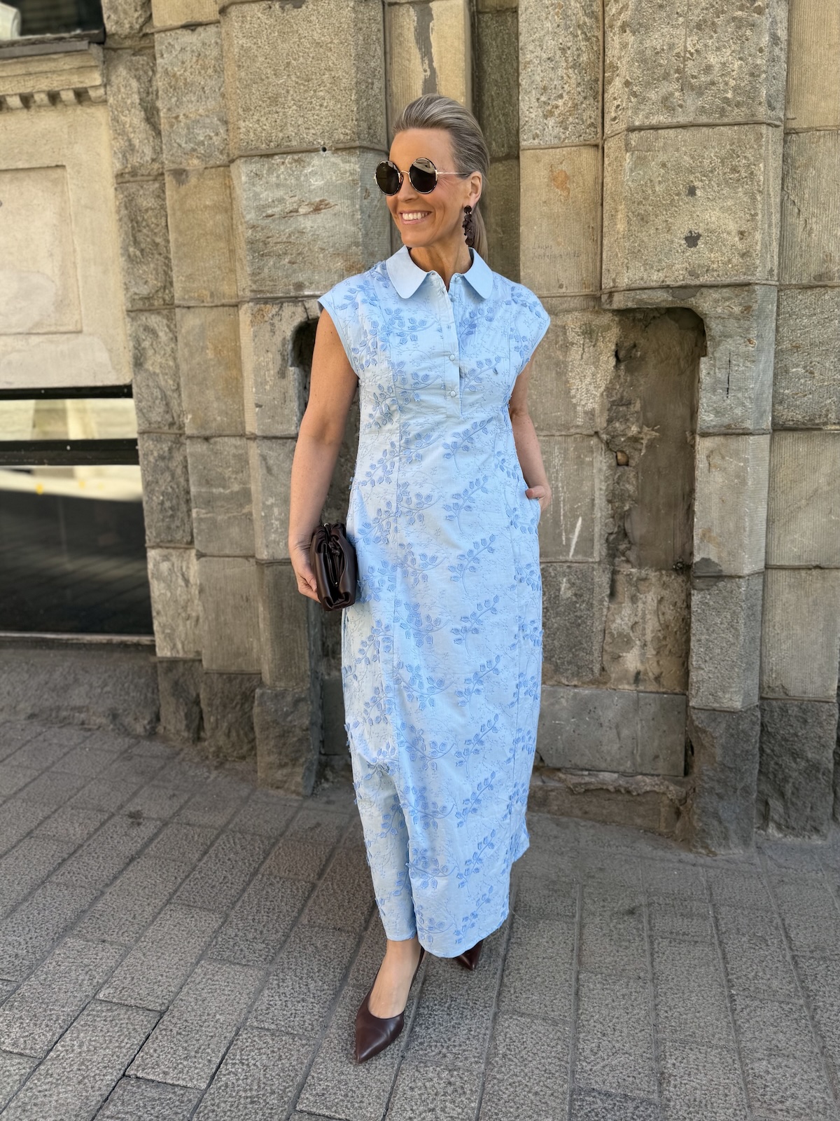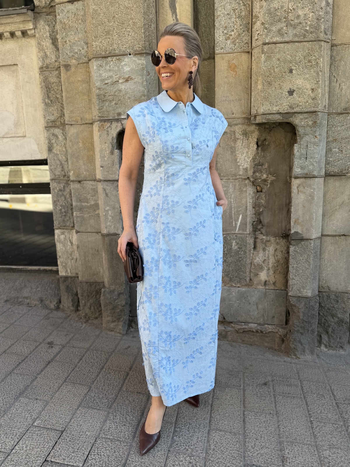 Moni Neda on ihana mekko, erilainen kuin hetkeen ollaan nähty. Mekossa on pukevat kaulukset ja edessä on muutamia nappeja. Olkasaumat ovat leveät. Mekko on kauniisti vartalonmyötäinen vyötäröön asti, jonka jälkeen se levenee alaspäin ja loppuu lähelle nilkkoja. Kankaassa on päällä kukkabrodeerausta, kuten saman sarjan paidassa.