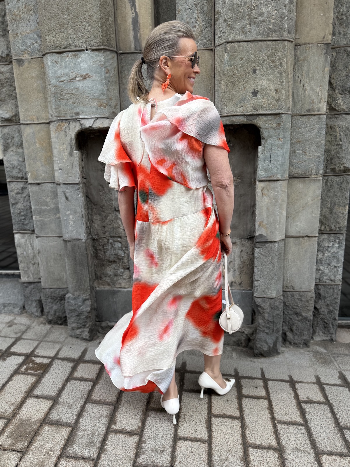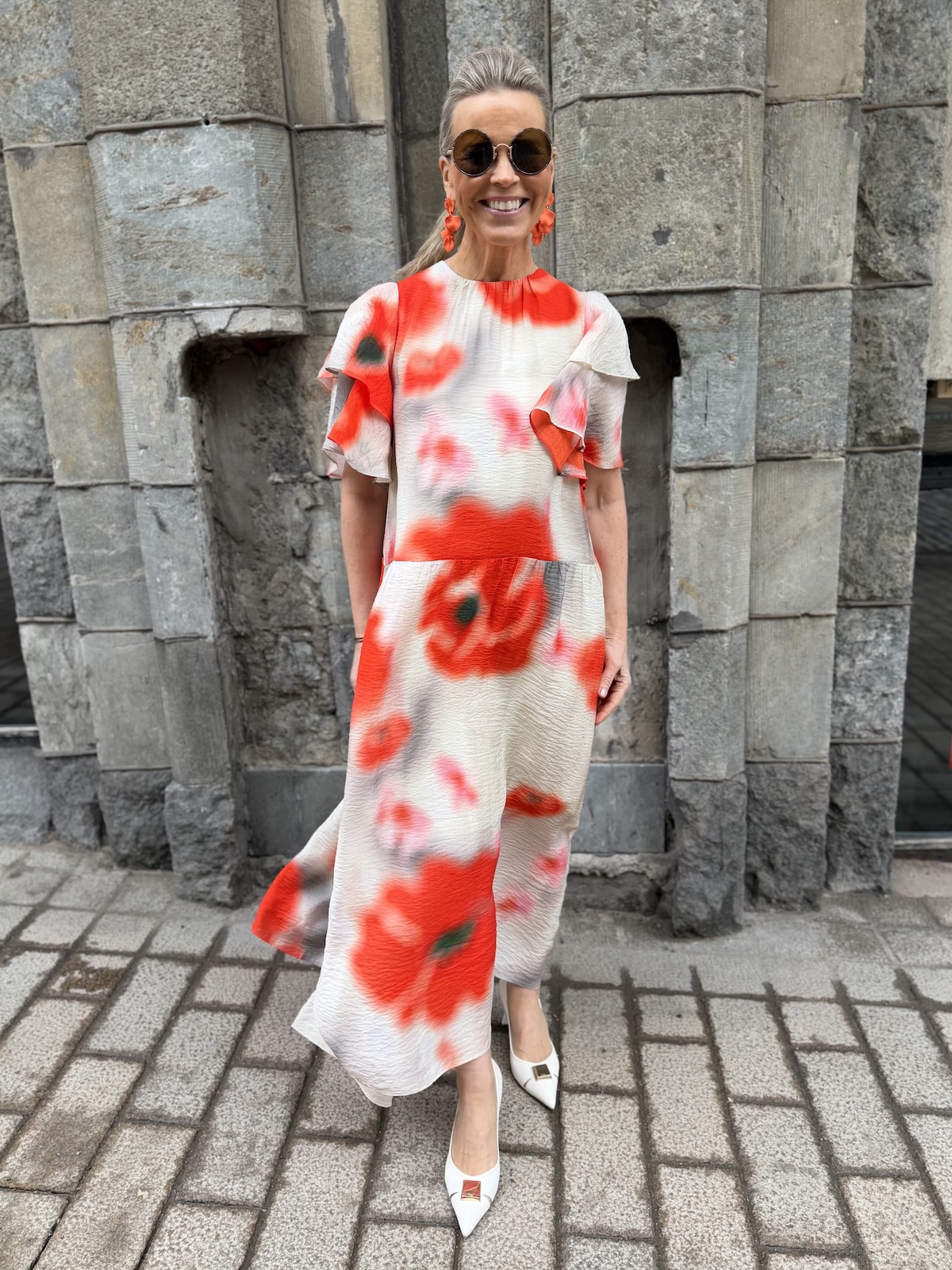 Reagan midimekossa on aivan ihana väritys ja upea kangas. Mekossa on O-kaula-aukko ja niskassa on nauhat. Hihat ovat löysät, kerrokselliset ja ne ylettyvät kyynerpäiden kohdalle. Mekko levenee kevyesti alaspäin ja loppuu nilkkoihin/lähelle nilkkoja. Mekossa on laskettu poikkileikkaus. Katalla on mekosta päällä koko 34.