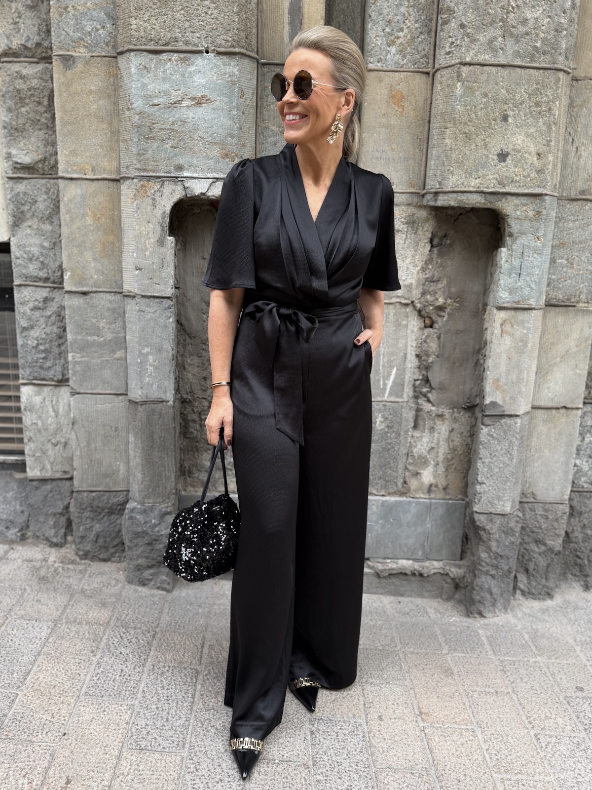Haalari on upea! Haalari kuuluu saman sarjaan muiden upeiden Sendra midimekkojen kanssa. Haalarissa on kietaisumallinen yläosa. Jos yläosa aukeaa liikaa, voi se kiinnittää sisäpuolelta pienellä hakaneulalla. Haalarin vyötärön kohdalla on leveä vyö ja lahkeet ovat ihan suorat ja täyspitkät. Hihat ovat löysähköt ja ylettyvät kyynerpäiden kohdalle. Katalla on haalarista päällä koko 34.
