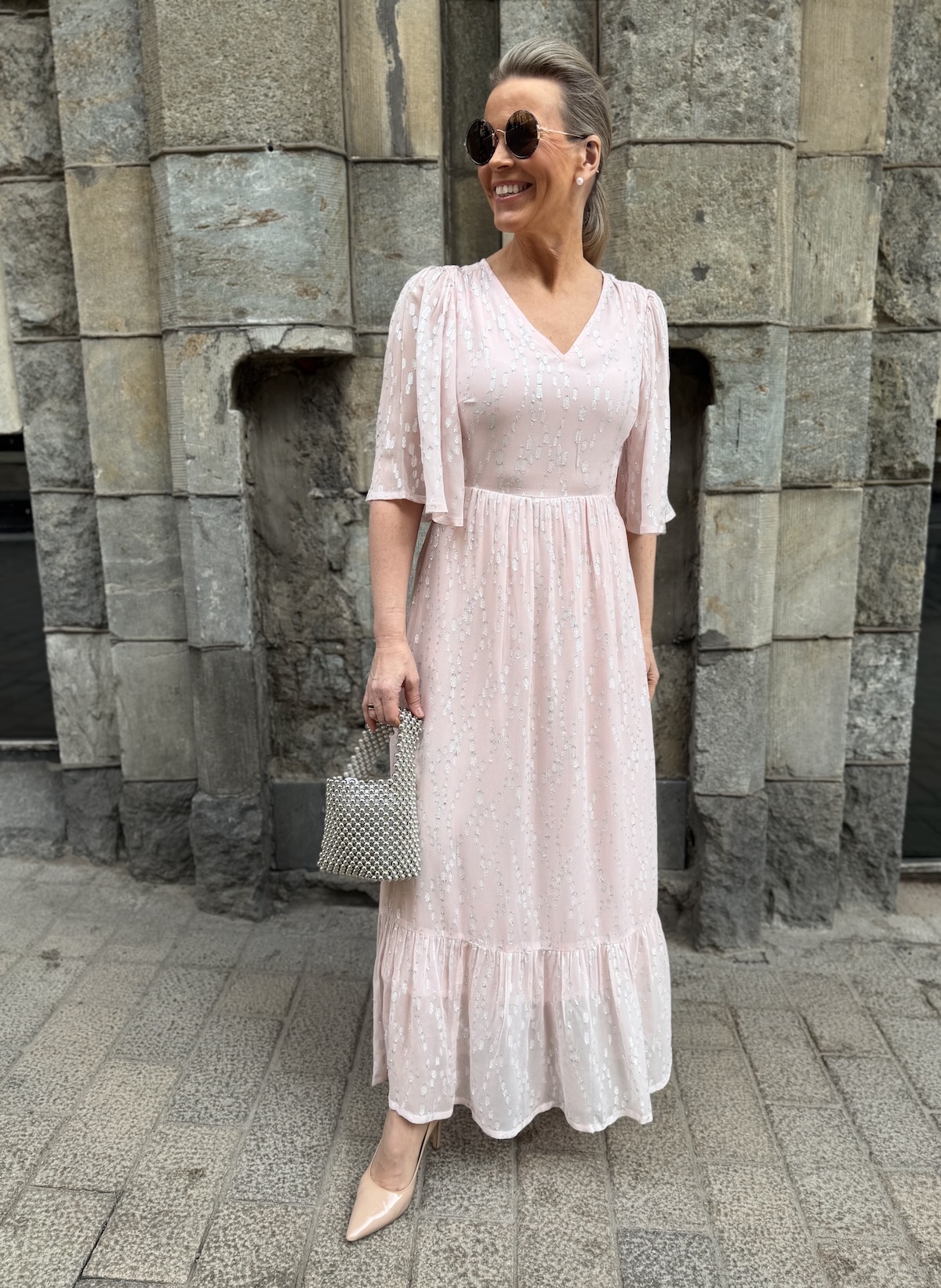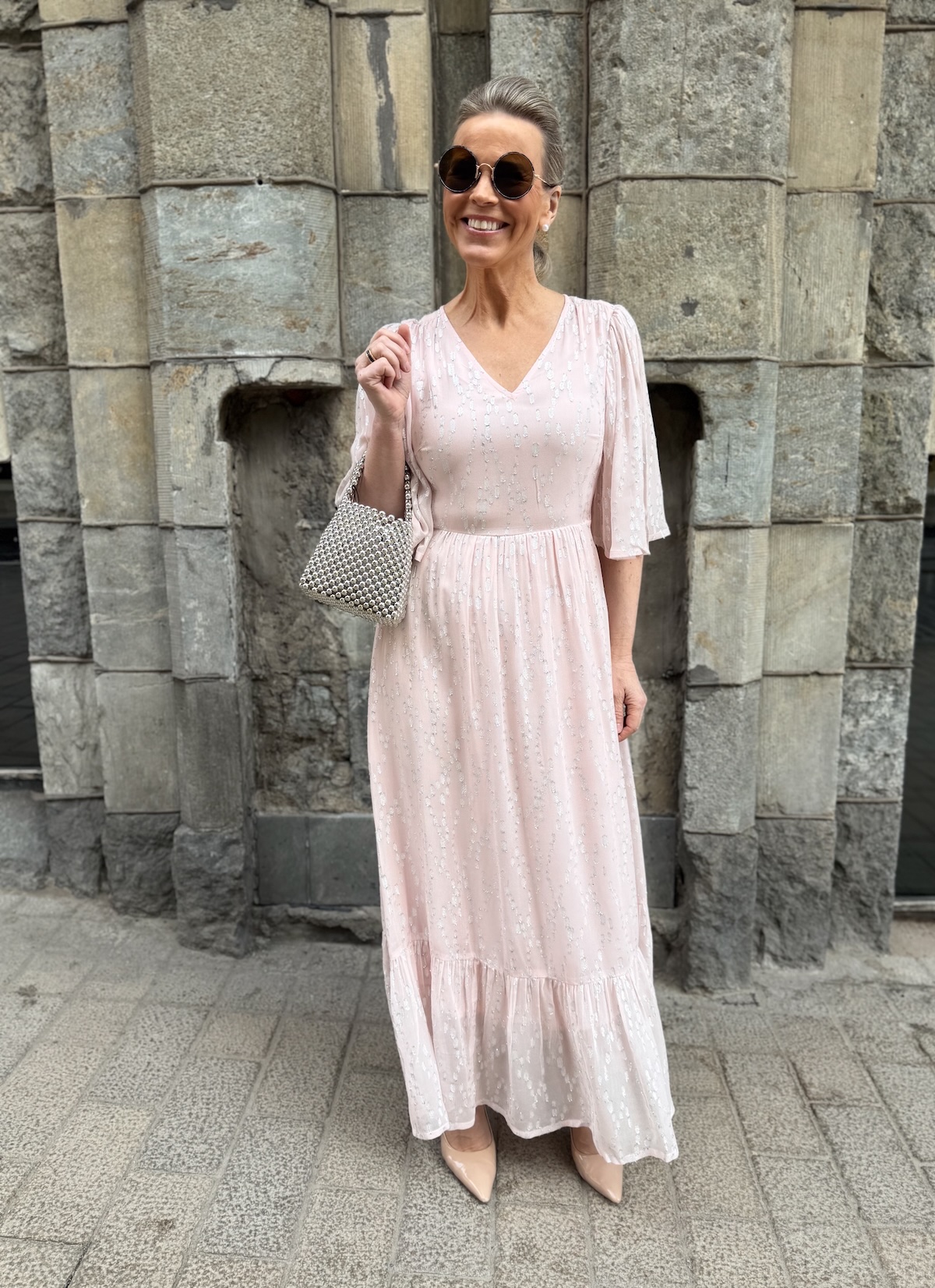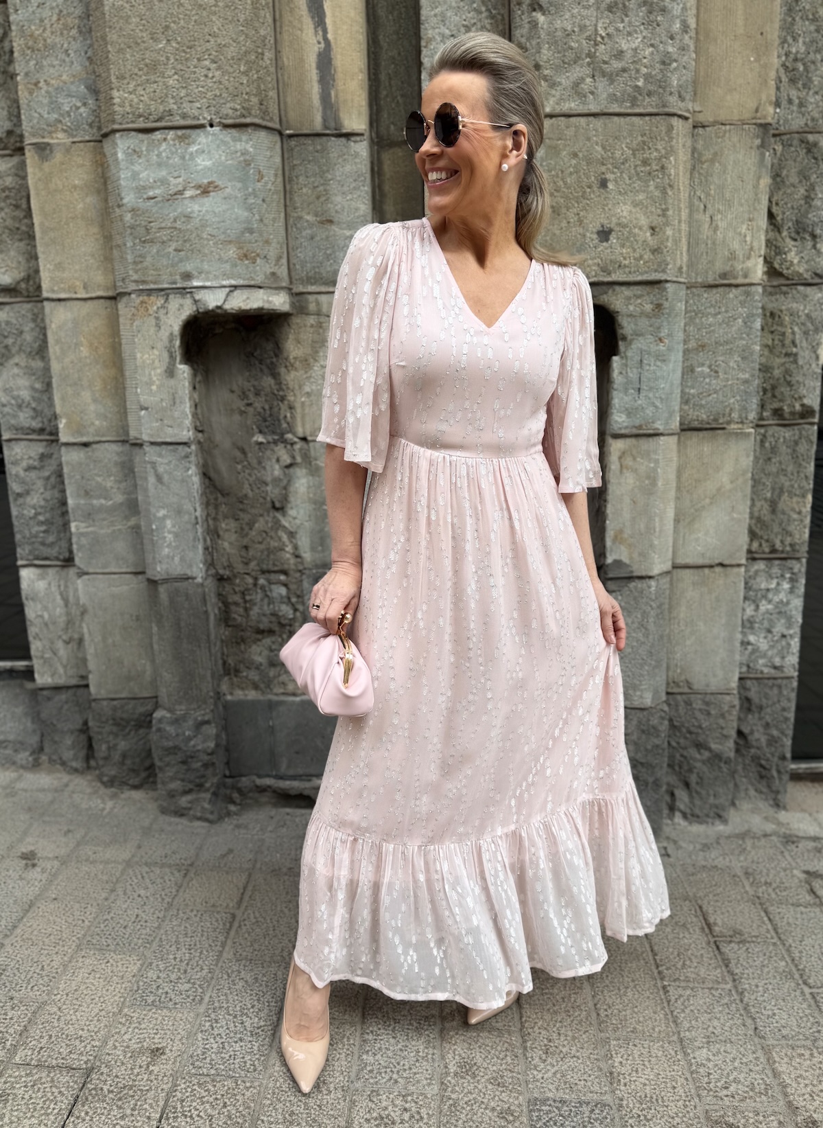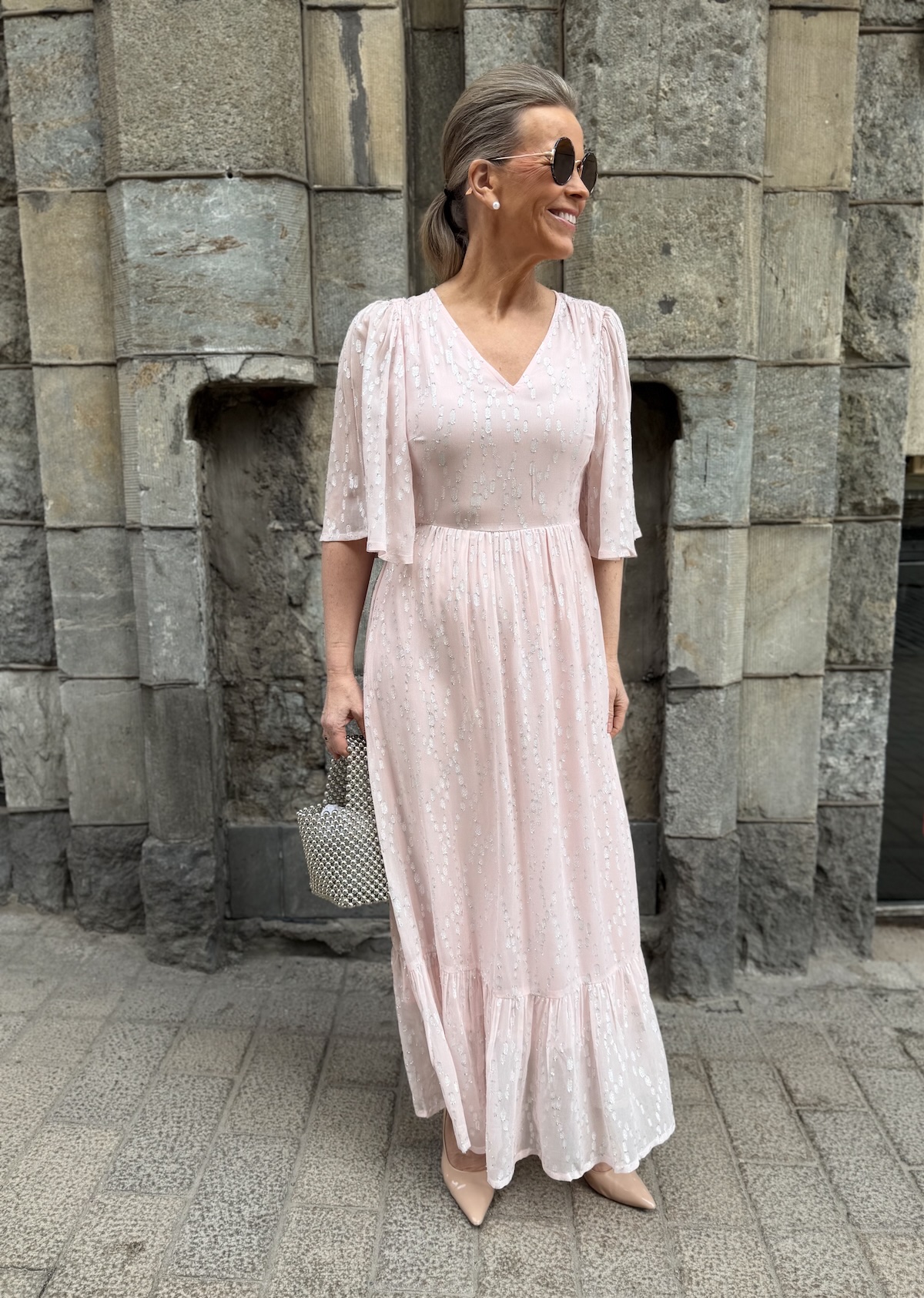 Terja on upea midimekko. Kangas on kaunis ja väritys on hailakka vaaleanpunainen ja mekosta löytyy hopean värisiä kuvioita. Mekossa on sopivan syvä V-kaula-aukko ja hihat ovat loistavan mittaiset, ne ylettyvät kyynerpäiden kohdalle. Vyötäröllä on poikkileikkaus ja helmaosa levenee kevyesti alaspäin ja loppuu nilkkoihin. Takana selän kohdalla on joustava kuminauharypytys. Helmassa on leveähkö salsakantti. Mekossa on vuori. Katalla on mekosta päällä koko 34. Mekko vastaa normaalia kokoa.