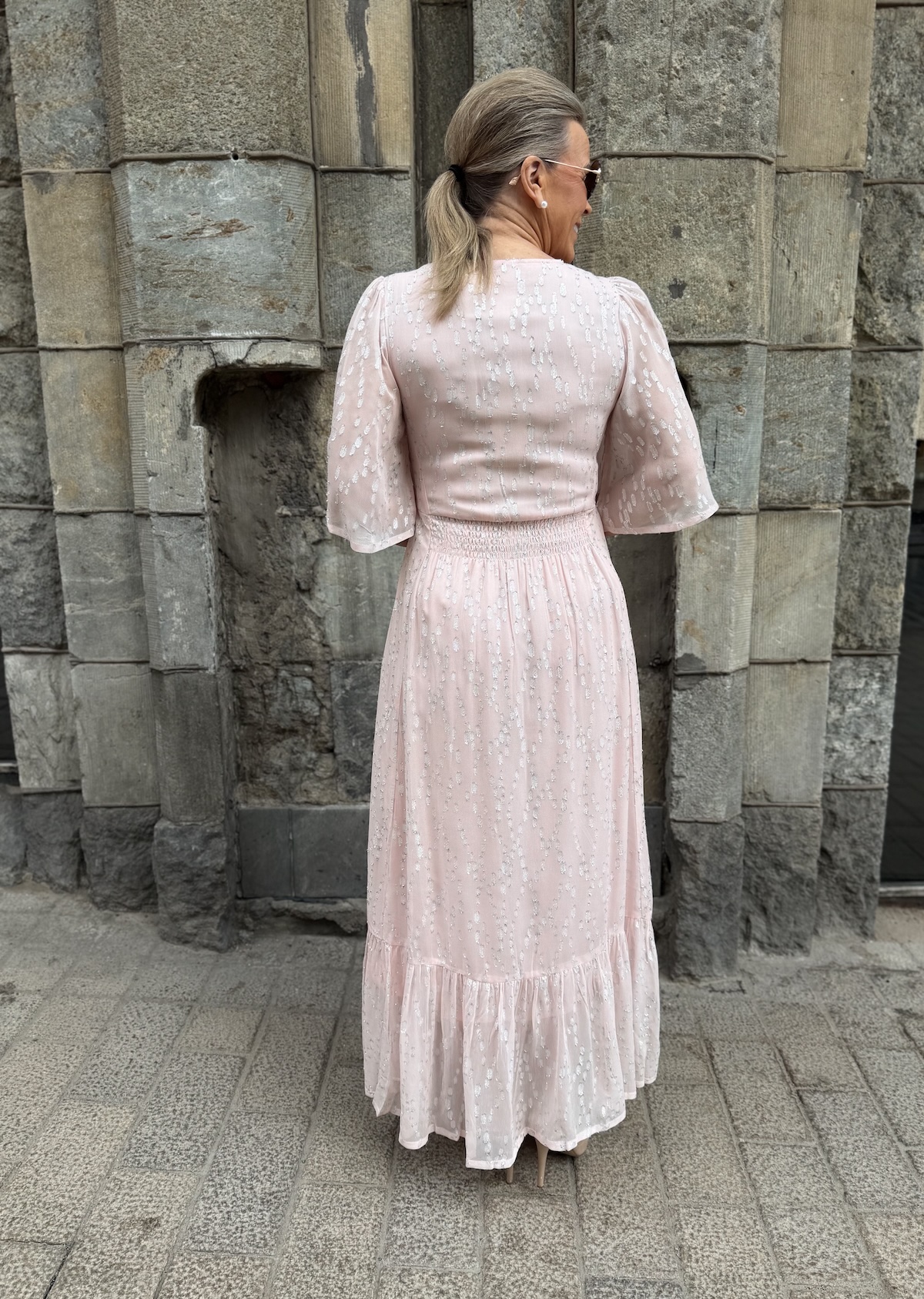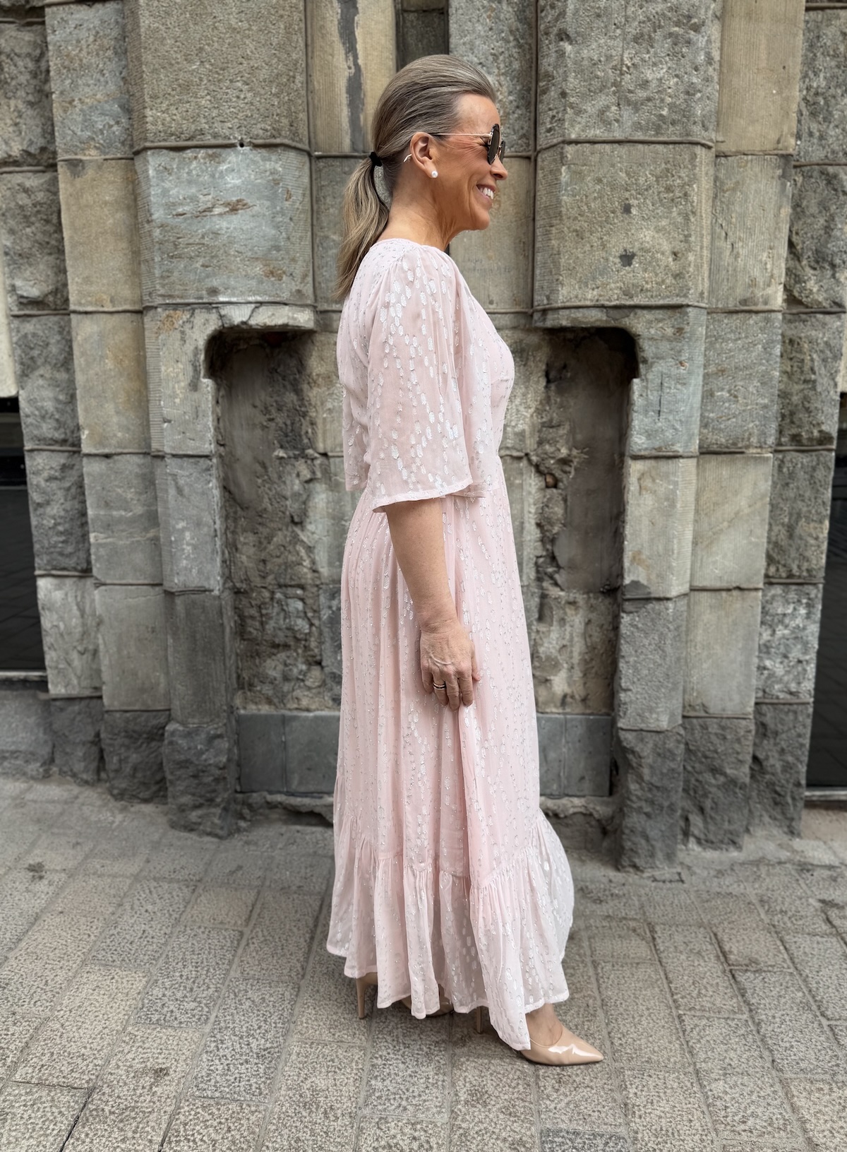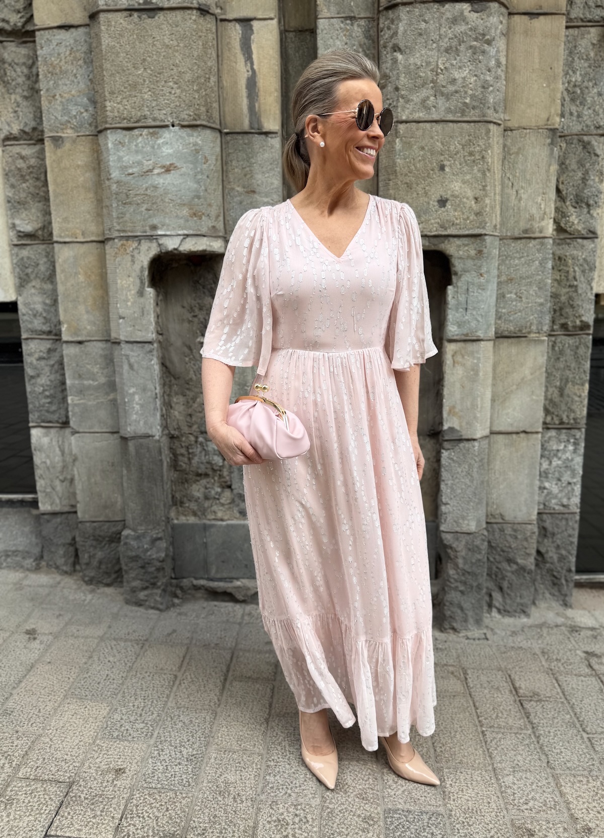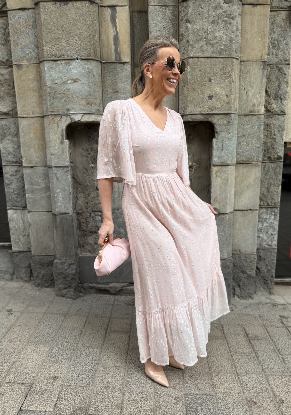 Terja on upea midimekko. Kangas on kaunis ja väritys on hailakka vaaleanpunainen ja mekosta löytyy hopean värisiä kuvioita. Mekossa on sopivan syvä V-kaula-aukko ja hihat ovat loistavan mittaiset, ne ylettyvät kyynerpäiden kohdalle. Vyötäröllä on poikkileikkaus ja helmaosa levenee kevyesti alaspäin ja loppuu nilkkoihin. Takana selän kohdalla on joustava kuminauharypytys. Helmassa on leveähkö salsakantti. Mekossa on vuori. Katalla on mekosta päällä koko 34. Mekko vastaa normaalia kokoa.