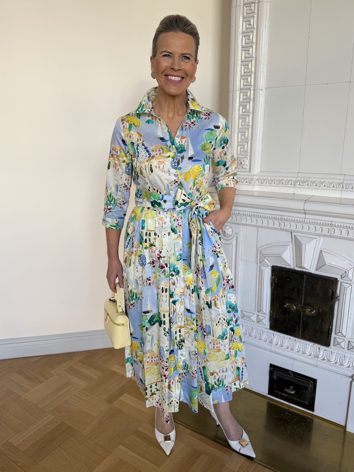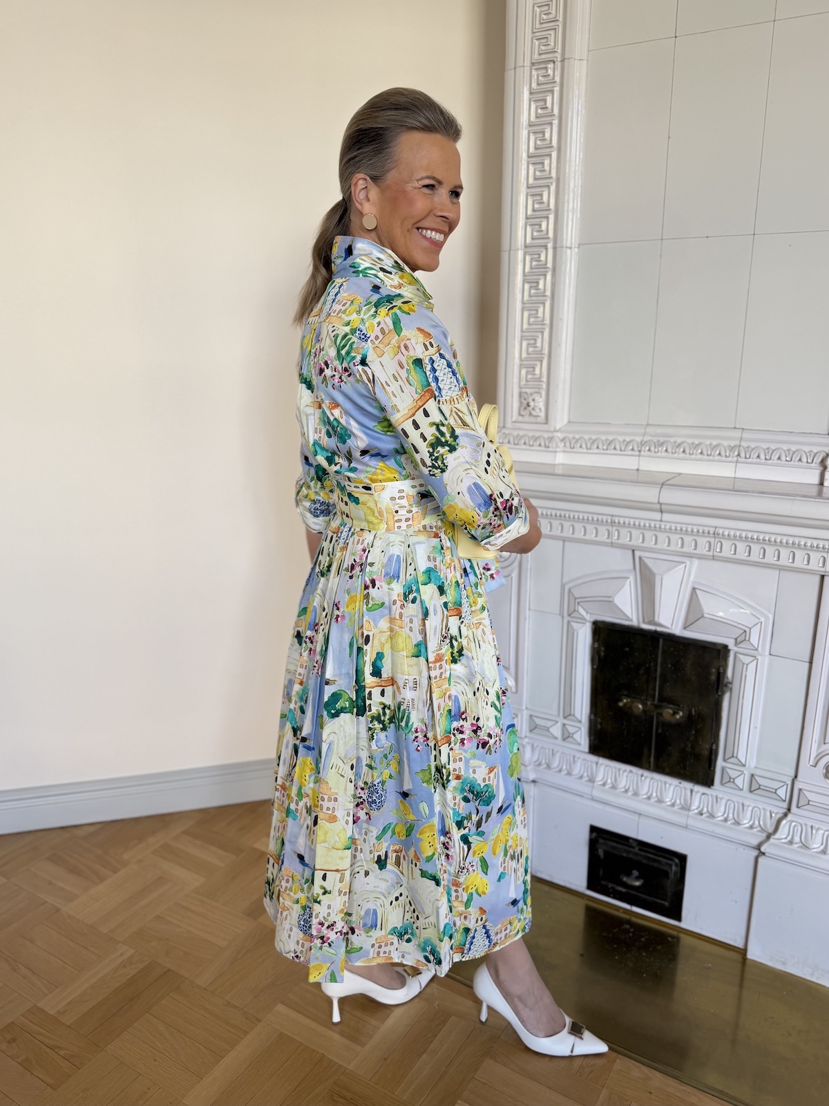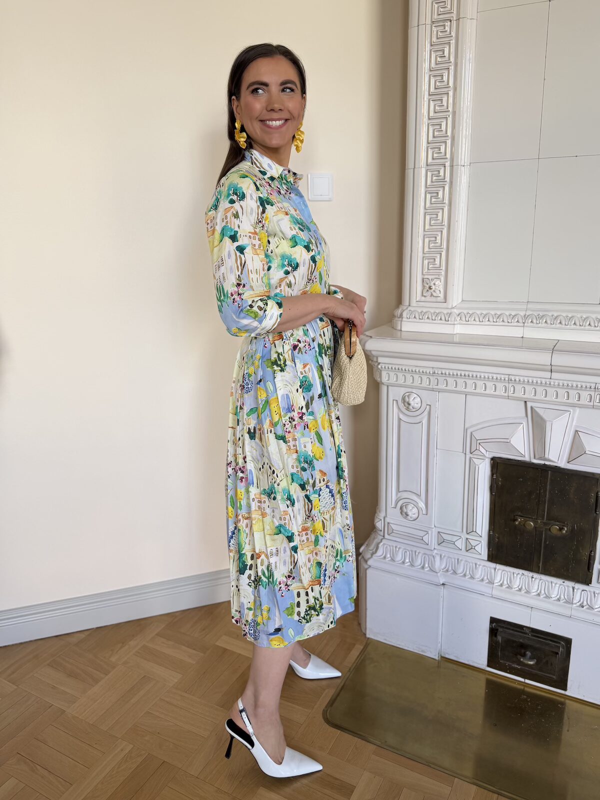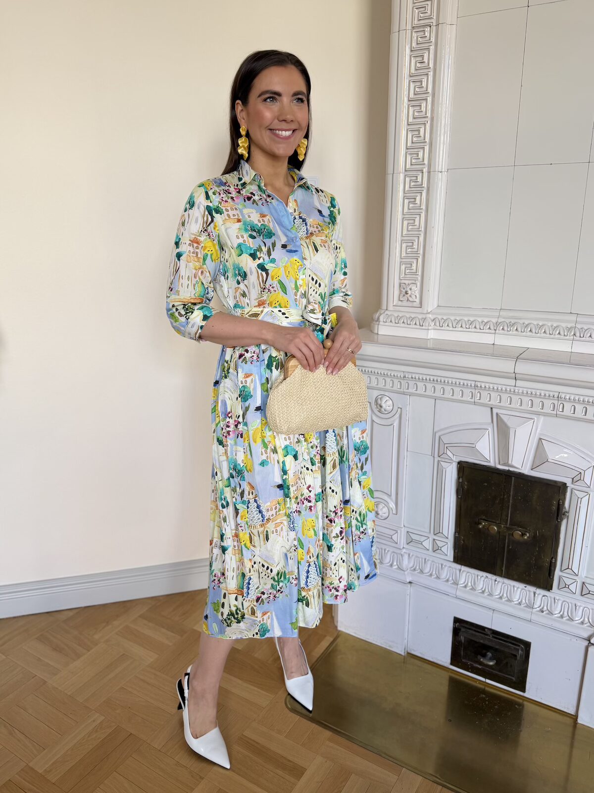 Tilly on värikäs midimekko. Mekossa on kaulukset ja edessä on napit. Hihat ovat vajaamittaiset. Mekko on linjakas yläosasta, vyötärön kohdalla on poikkileikkaus, jonka jälkeen helmaosa levenee alaspäin ja loppuu pohkeiden alapuolelle. Vyötäröllä on nauhavyö ja mekon sivuissa on taskut. Katalla on mekosta päällä koko 34 ja Gabilla on koko 36. Mekko on reiluhkoa kokoa.