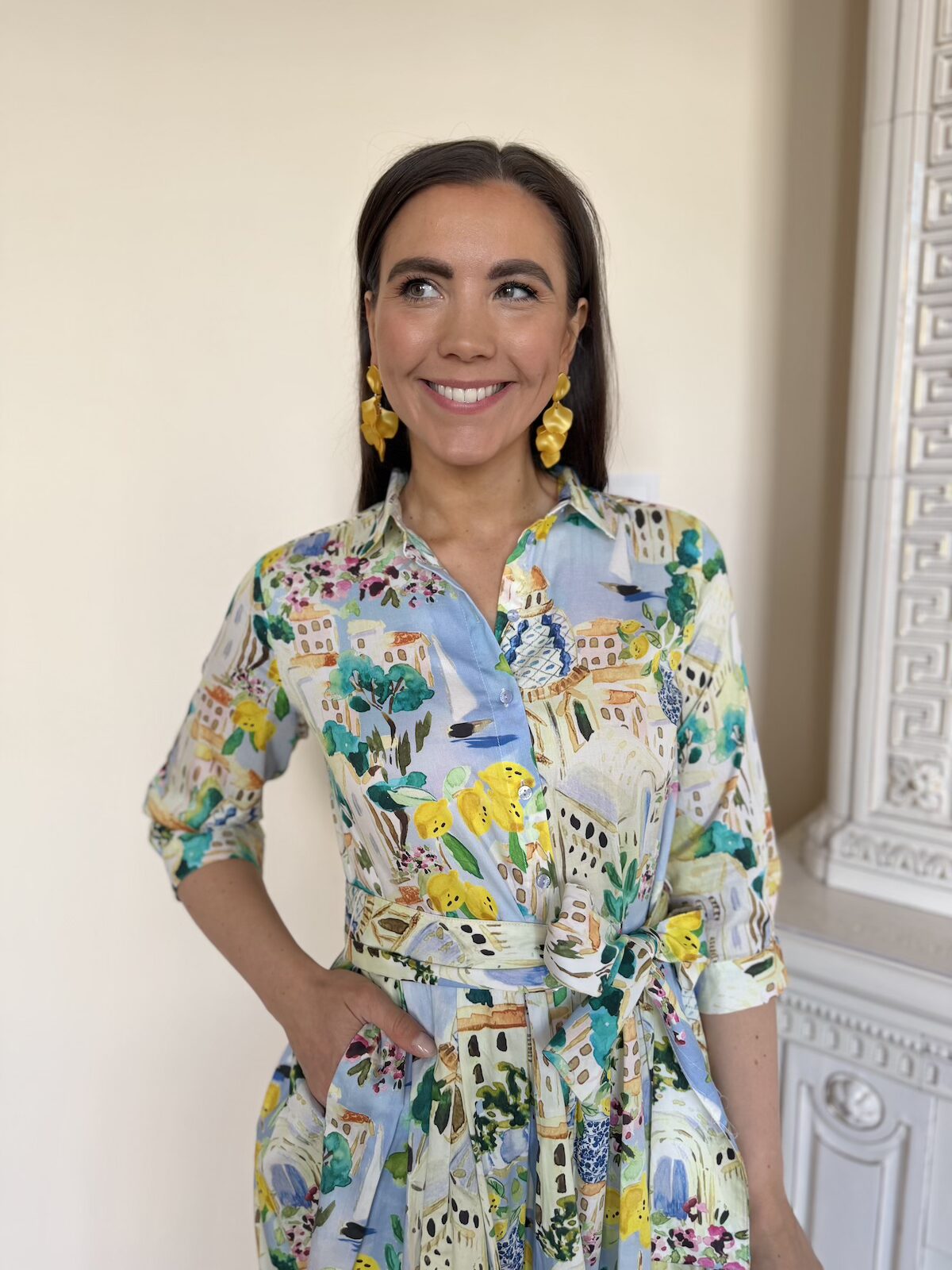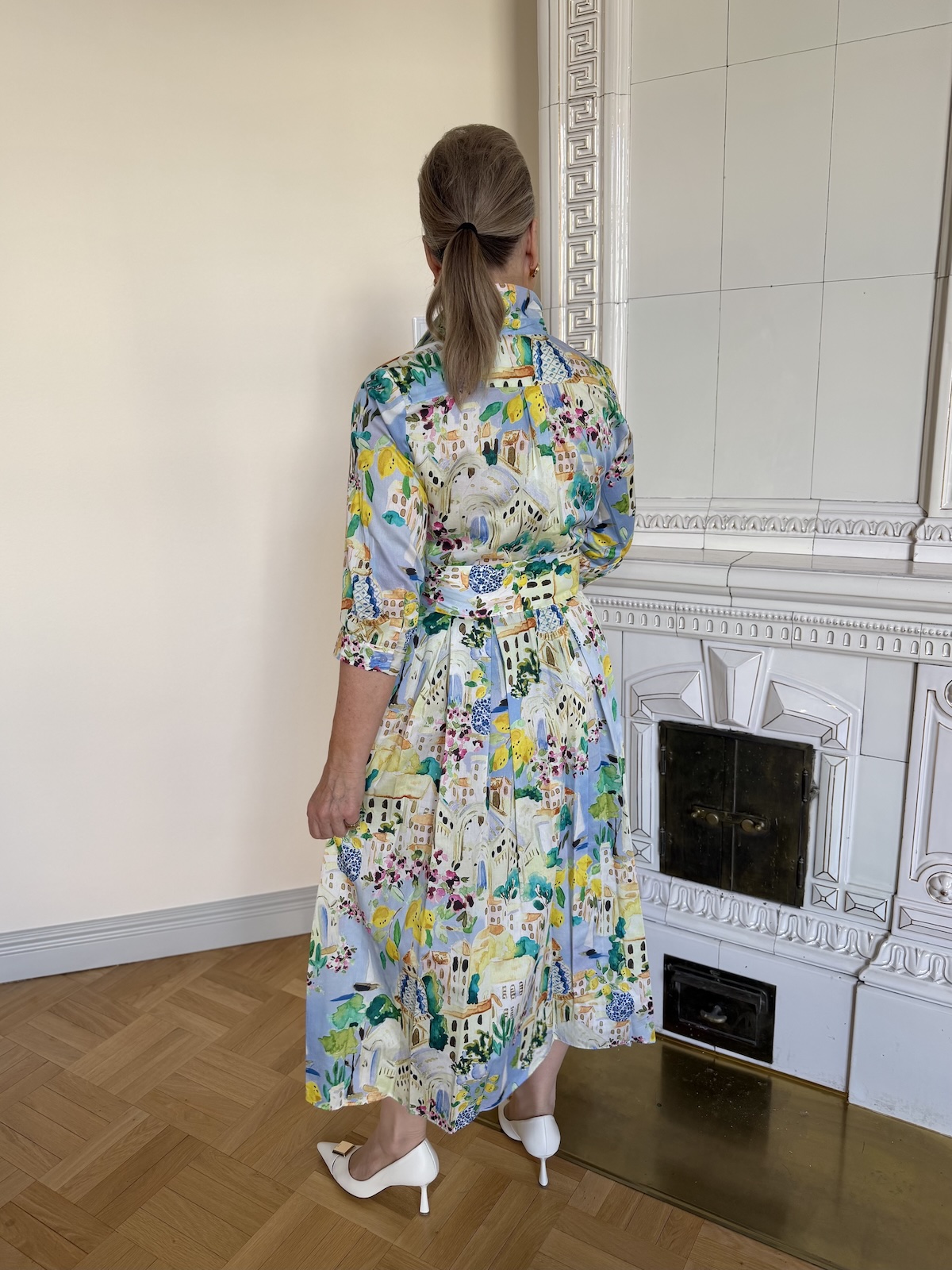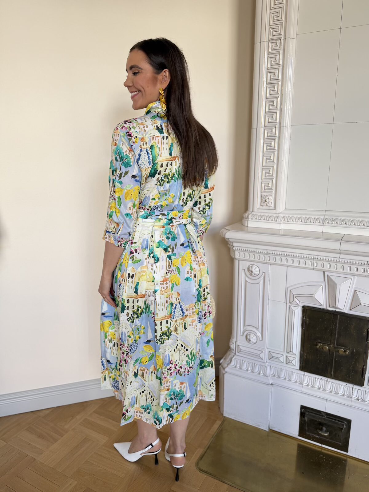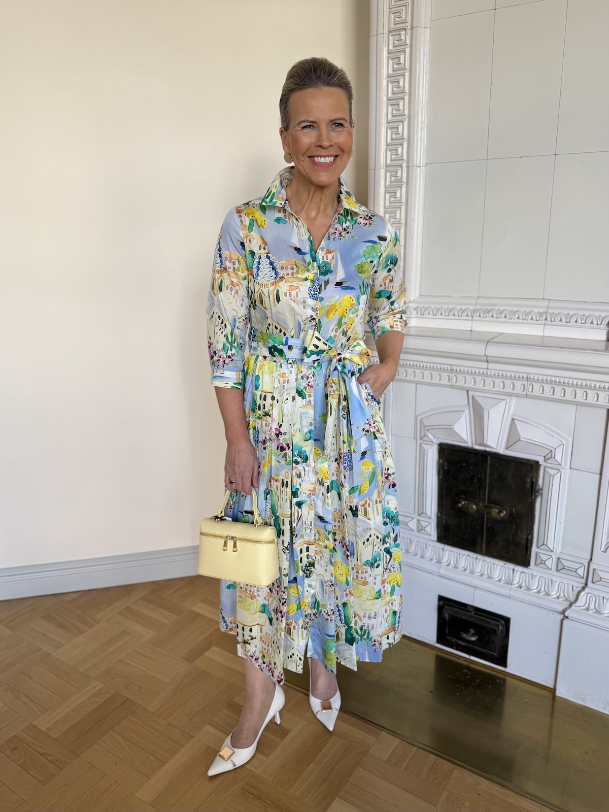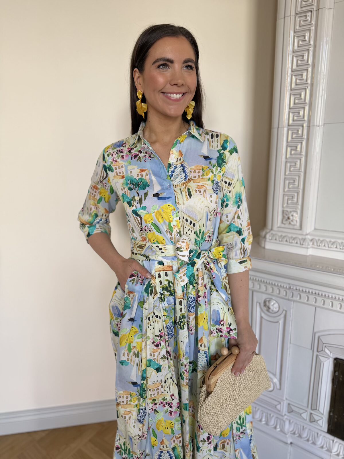Tilly on värikäs midimekko. Mekossa on kaulukset ja edessä on napit. Hihat ovat vajaamittaiset. Mekko on linjakas yläosasta, vyötärön kohdalla on poikkileikkaus, jonka jälkeen helmaosa levenee alaspäin ja loppuu pohkeiden alapuolelle. Vyötäröllä on nauhavyö ja mekon sivuissa on taskut. Katalla on mekosta päällä koko 34 ja Gabilla on koko 36. Mekko on reiluhkoa kokoa.