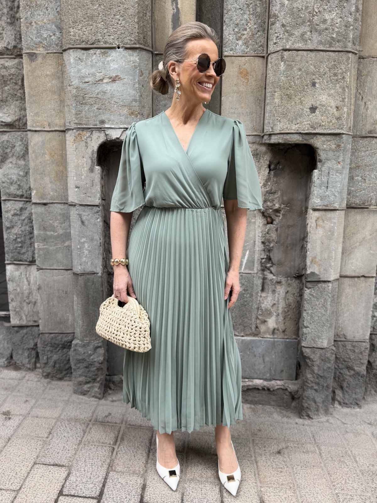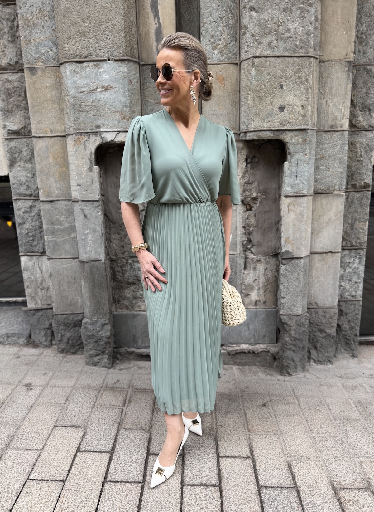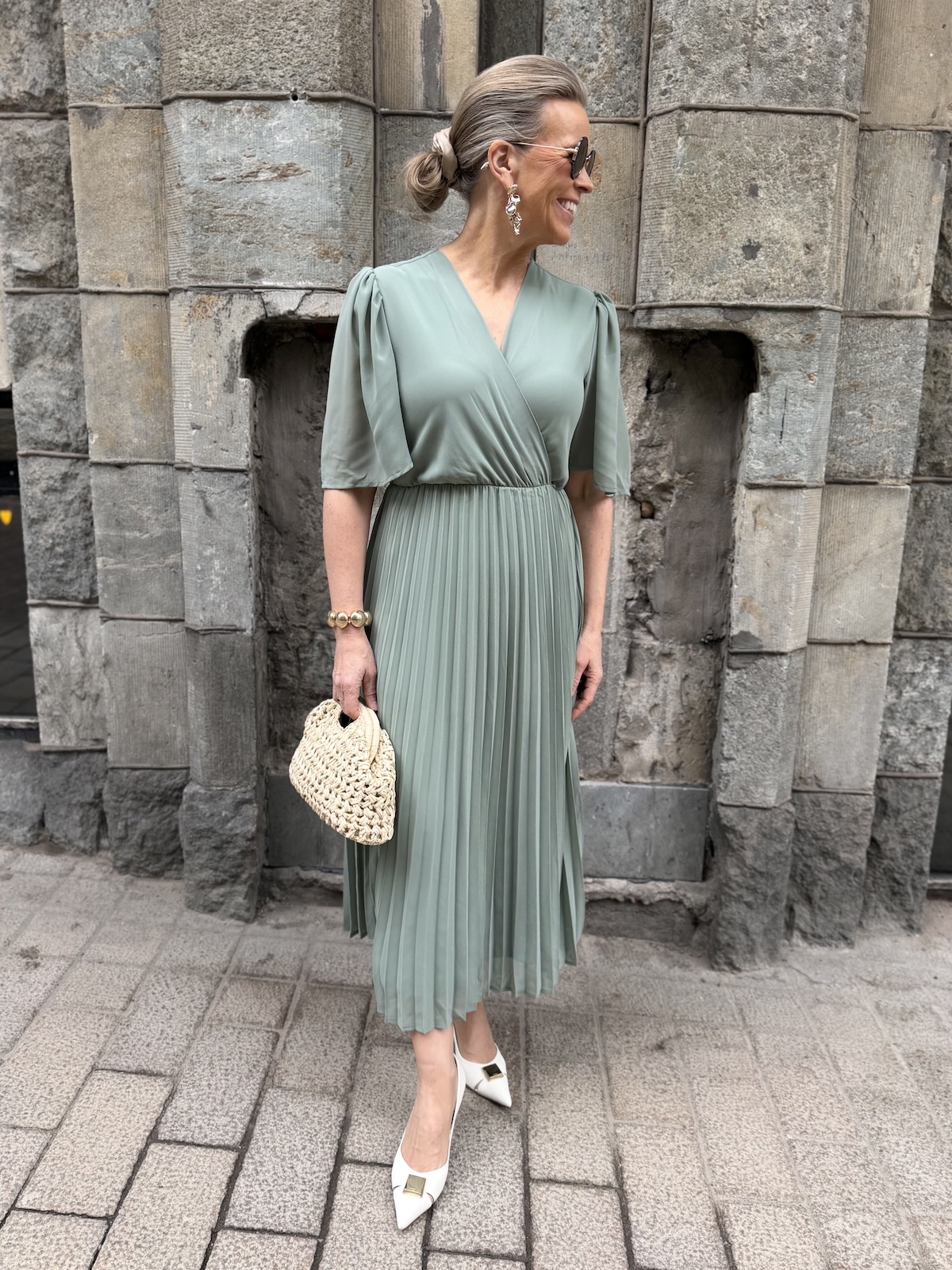 Uni Cheila mekko on näyttävä! Mekon yläosa on kietaisumallinen. Yläosa menee hyvin edestä kiinni eli kaula-aukko istuu kauniisti. Hihat ovat läpikuultavat, alaspäin levenevät ja ne ylettyvät kyynerpäiden kohdalle. Vyötärön kapeimmalla kohtaa on poikkileikkaus kuminauhalla, joka joustaa. Helmaosa on plisekangasta. Katalla on mekosta päällä koko S.