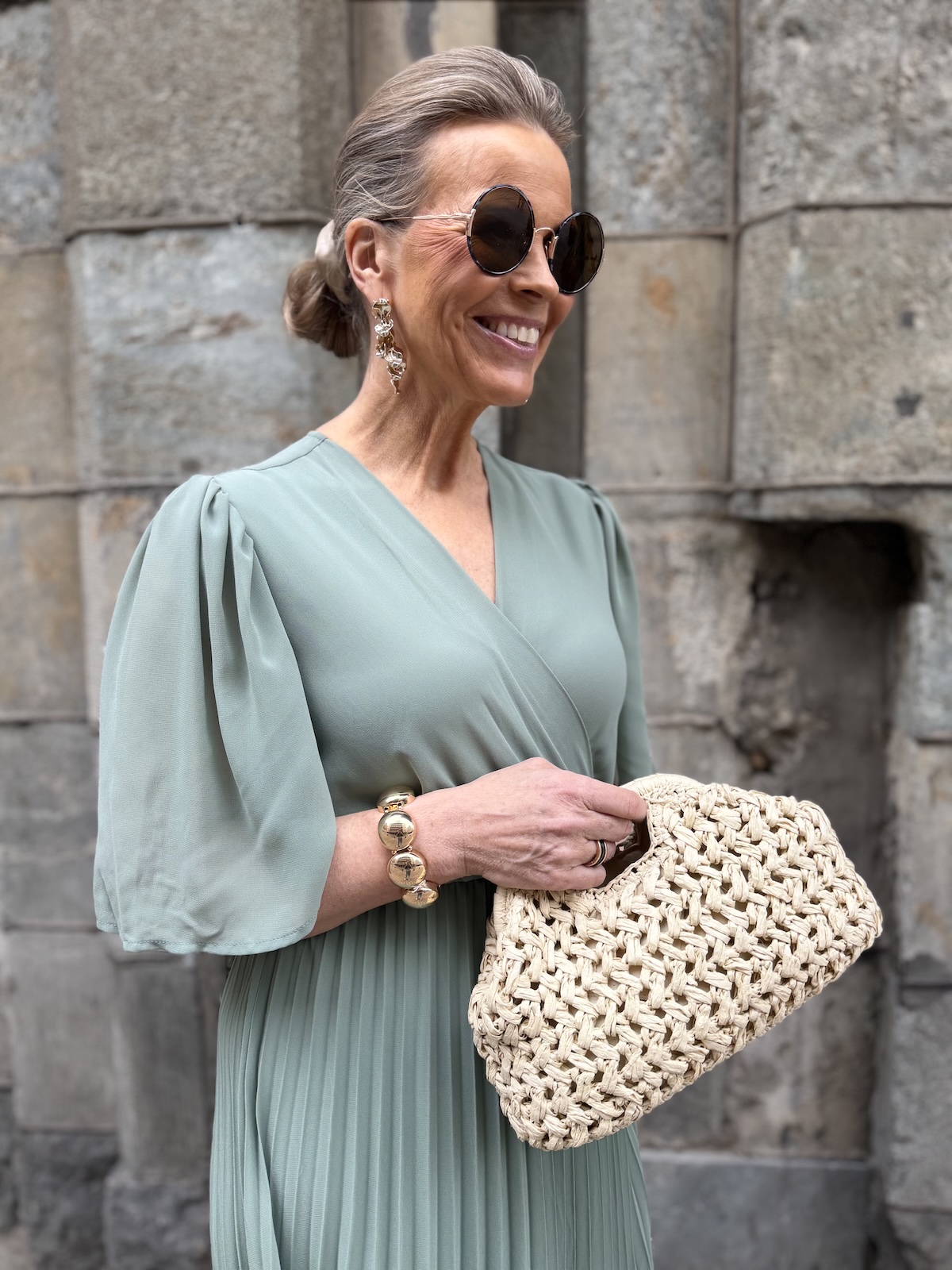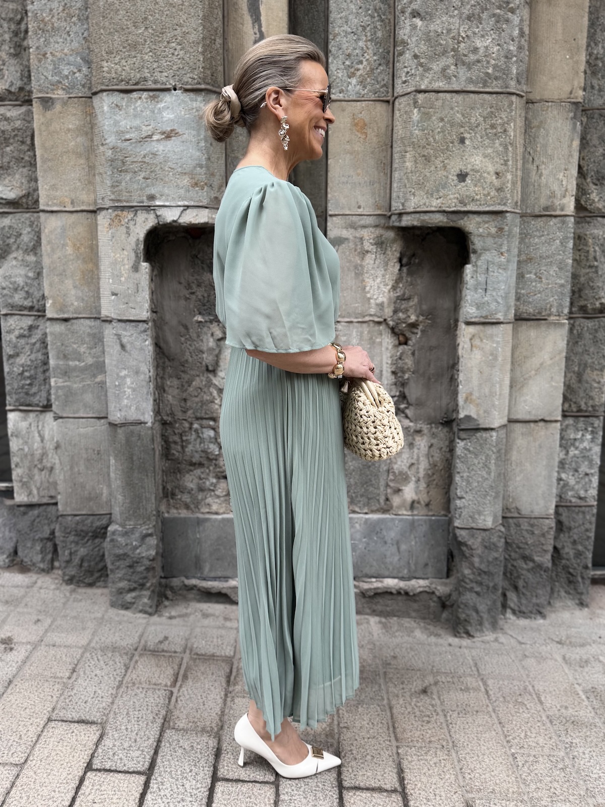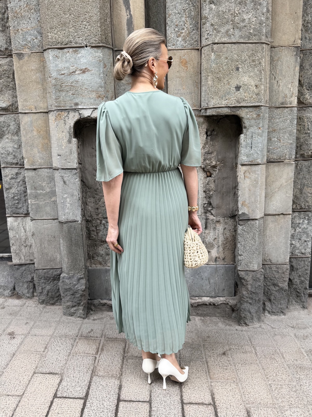 Uni Cheila mekko on näyttävä! Mekon yläosa on kietaisumallinen. Yläosa menee hyvin edestä kiinni eli kaula-aukko istuu kauniisti. Hihat ovat läpikuultavat, alaspäin levenevät ja ne ylettyvät kyynerpäiden kohdalle. Vyötärön kapeimmalla kohtaa on poikkileikkaus kuminauhalla, joka joustaa. Helmaosa on plisekangasta. Katalla on mekosta päällä koko S.