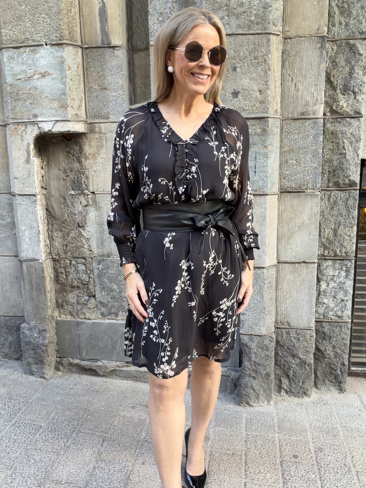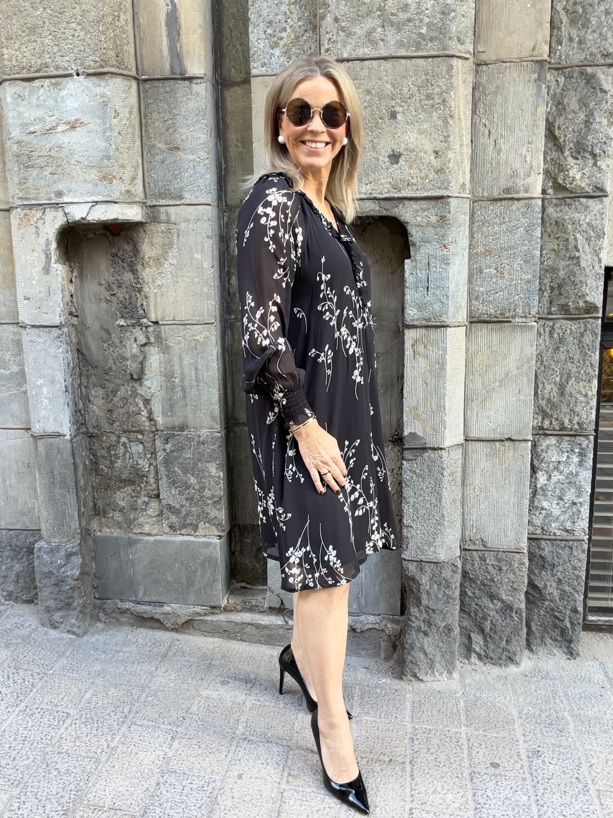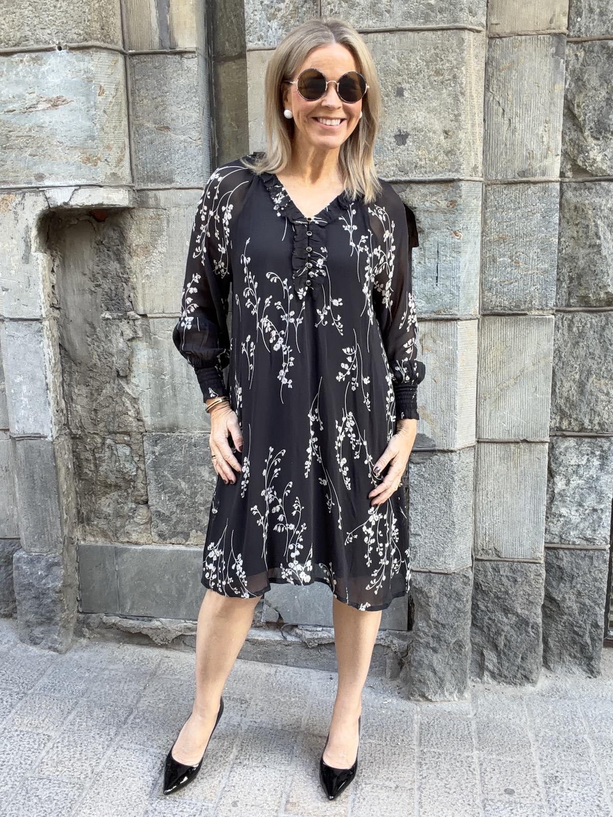 Urma pitkähihainen mekko; musta kukkakuvio