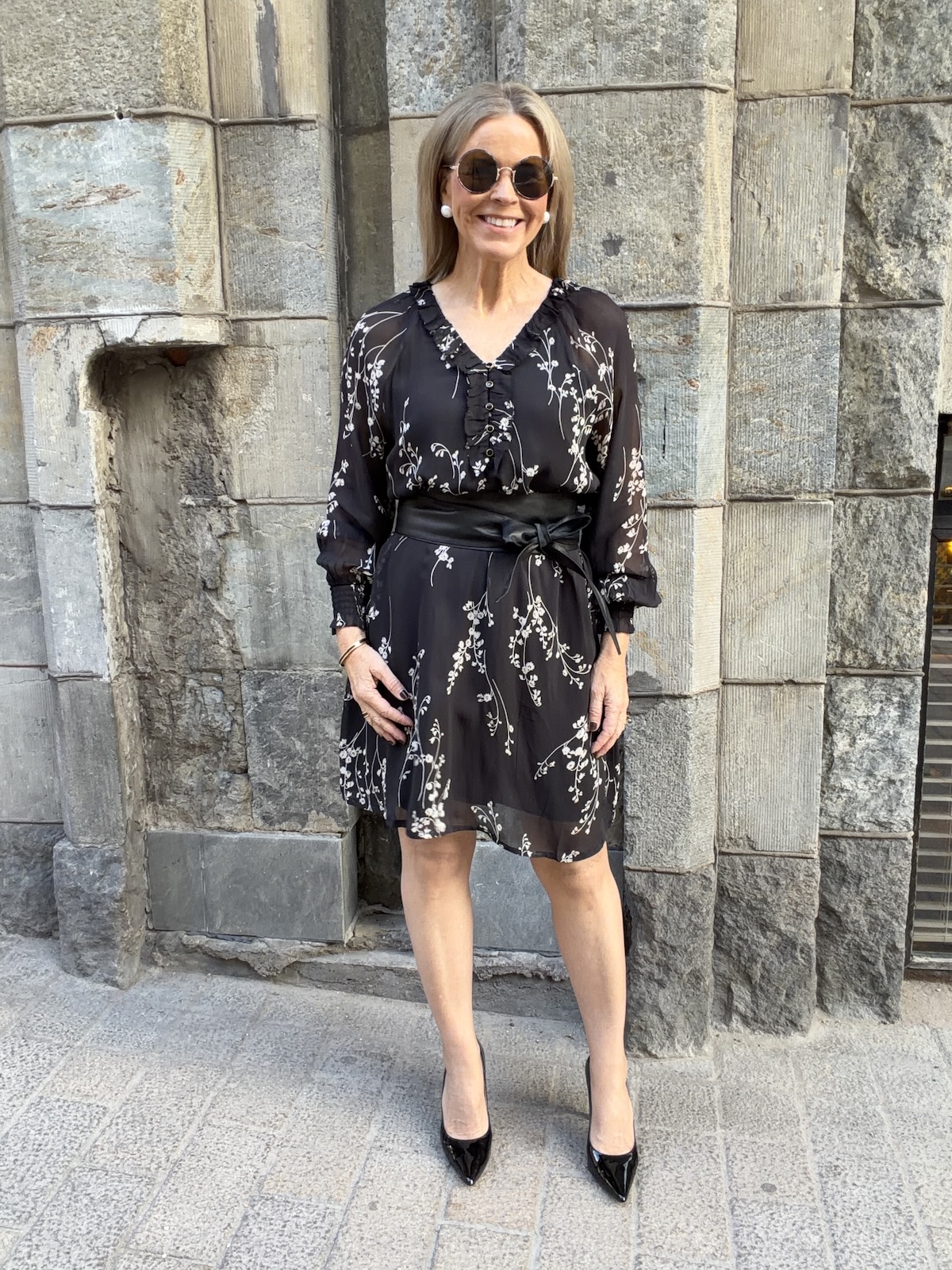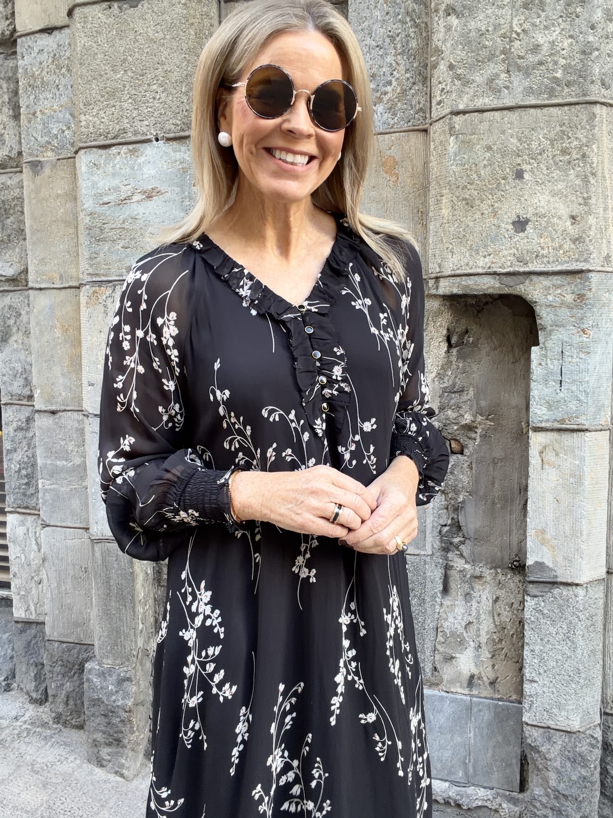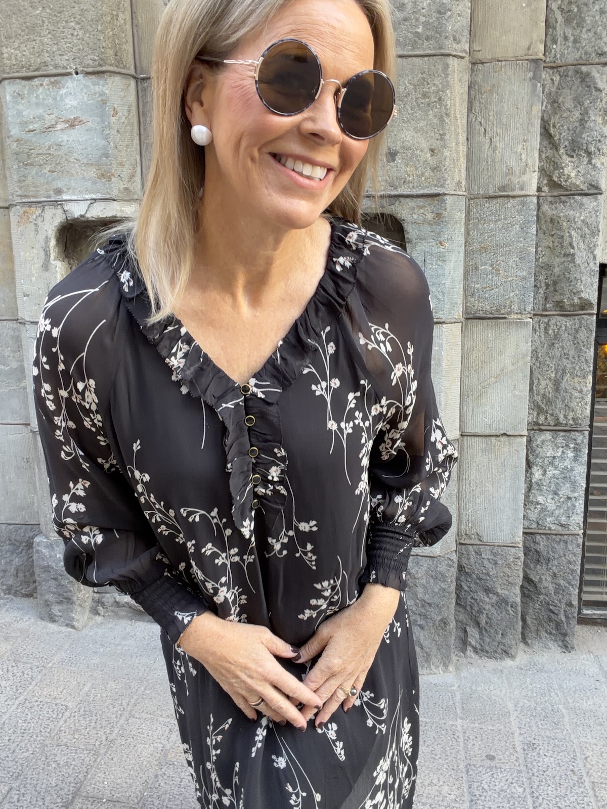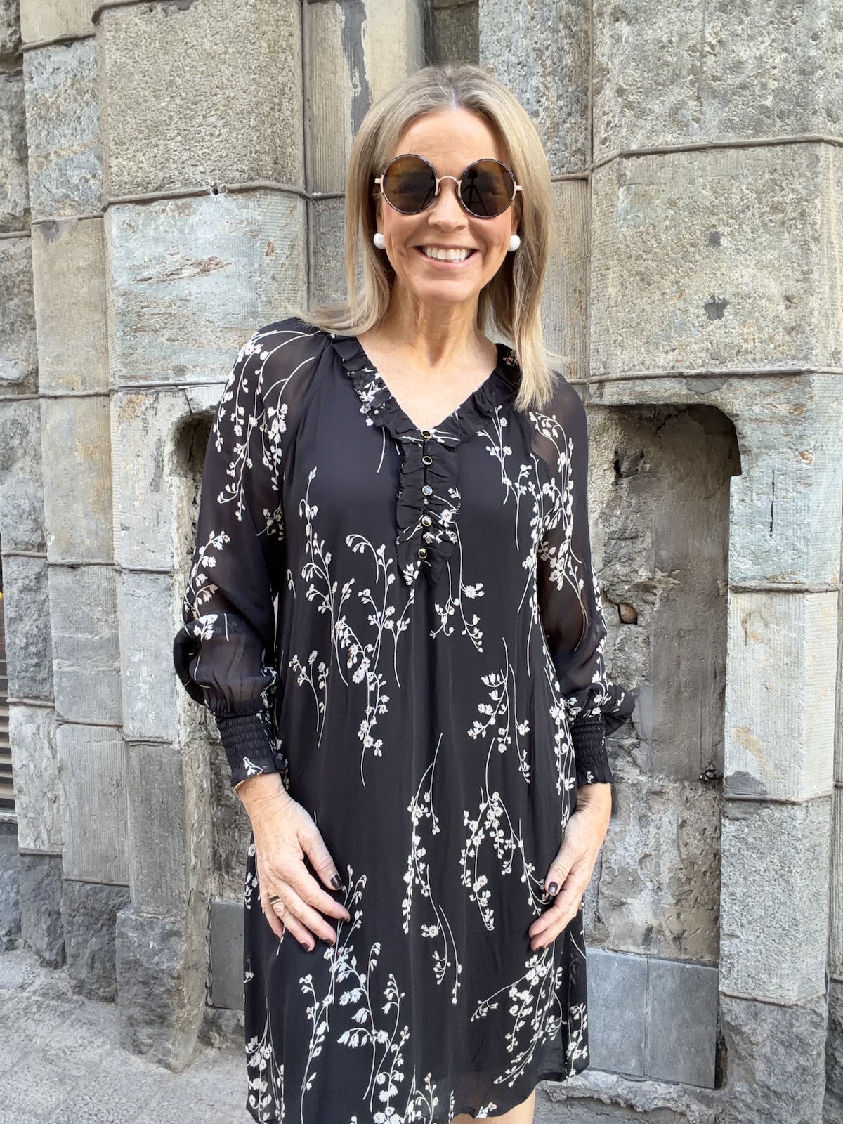 Urma pitkähihainen mekko; musta kukkakuvio