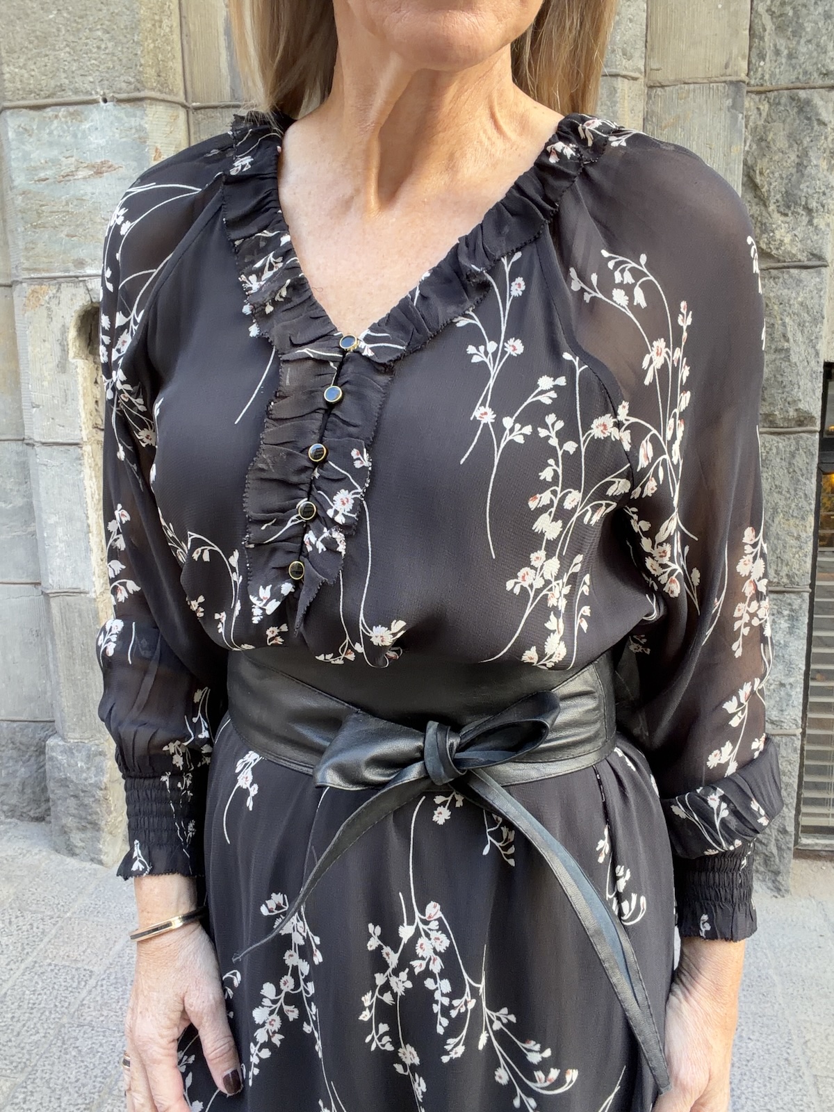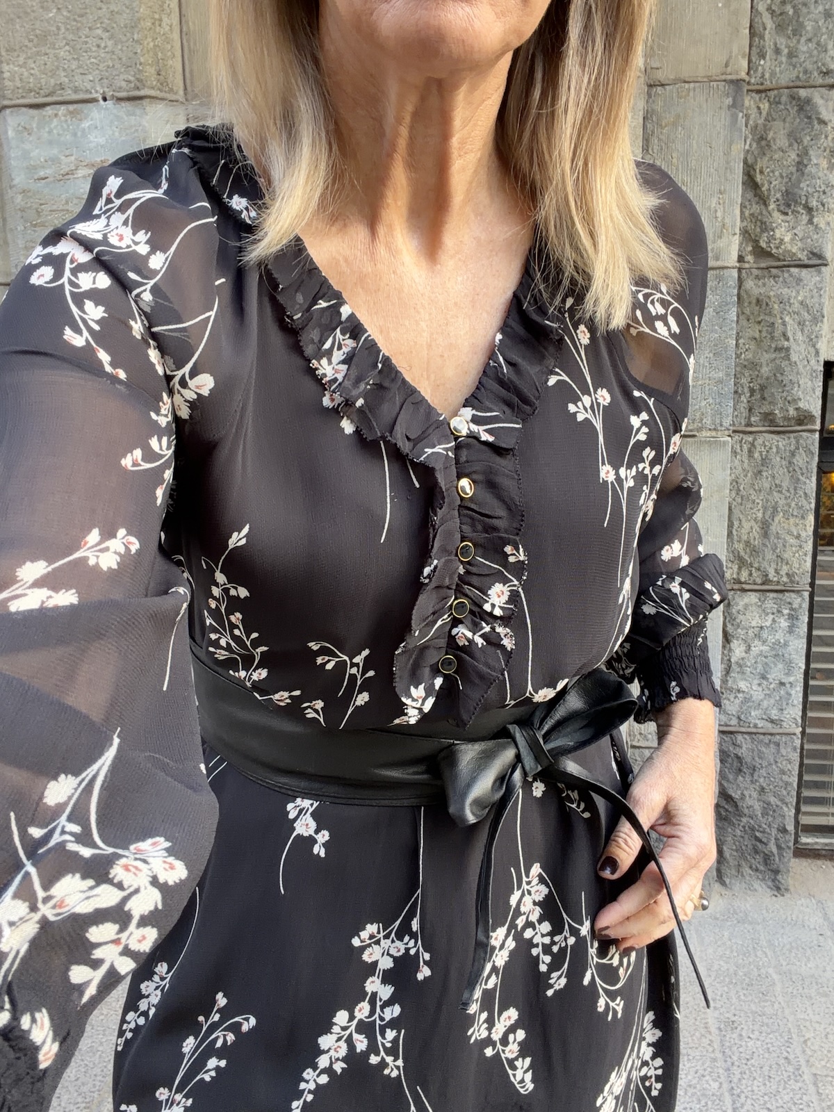 Urma mekossa on kaunis malli ja kaunis kangas. Kangas on pohjaväriltään musta ja siinä vaaleita kukkia joissa on hieman punaruskeaa. mekossa on V-kaula-aukko ja kaula-aukon reunaa kiertää kapea fyrrykantti. Edessä on muutamia musta/kullanväisiä pieniä nappeja. Hihat ovat vuorettomat ja hinansuissa on kumilankarannekkeet. Mekko on malliltaan suorahko ja se laskeutuu kauniisti noin polvien kohdalle. Katalla on mekosta päällä koko 34.