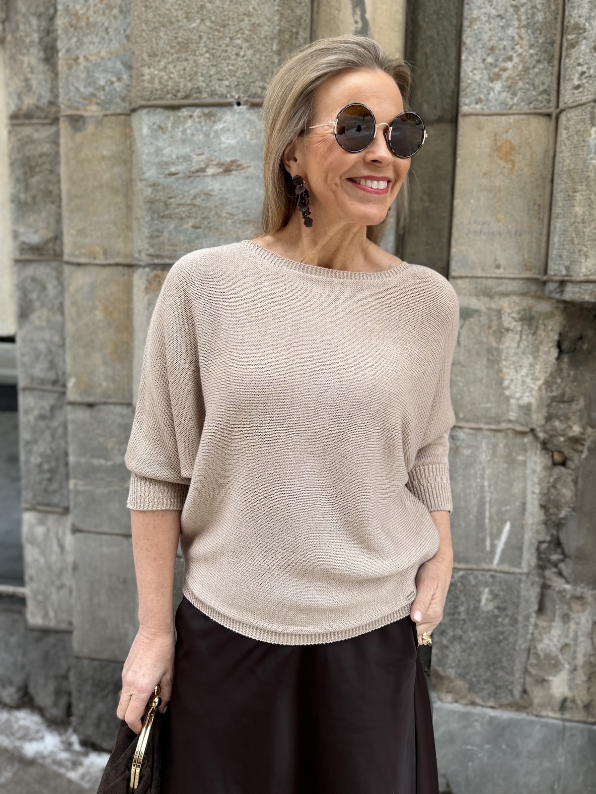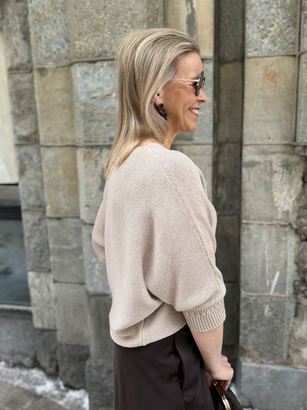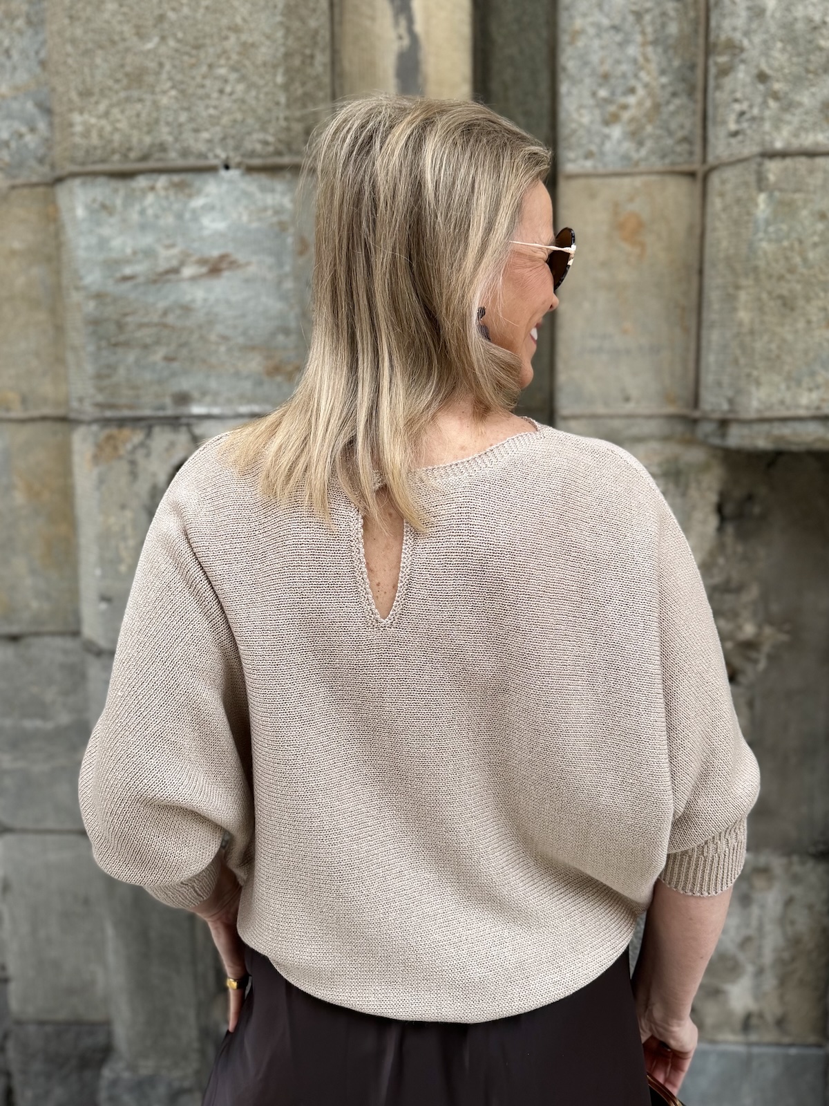 Dolman on kaunis lepakkohihainen neule, joka toimii arkeen mutta myös pieneen menoon kauniin aavistuksen kiiltäpintaisen lookkinsa ansiosta. Neuleessa on O-kaula-aukko ja niskassa on halkio ja nappi. Hihat ovat vaajaamittaiset resorilla, ne ylettyvät kyynerpäiden alapuolelle. Neule kapenee alaspäin ja loppuu lantiolle. Katalla on neuleesta päällä koko 34.