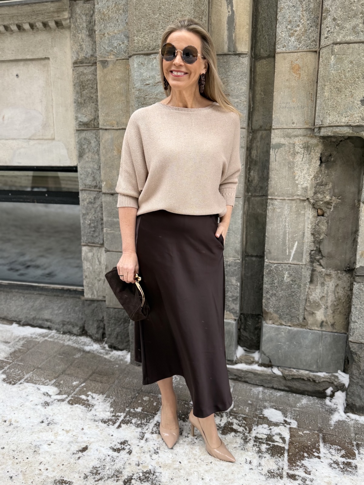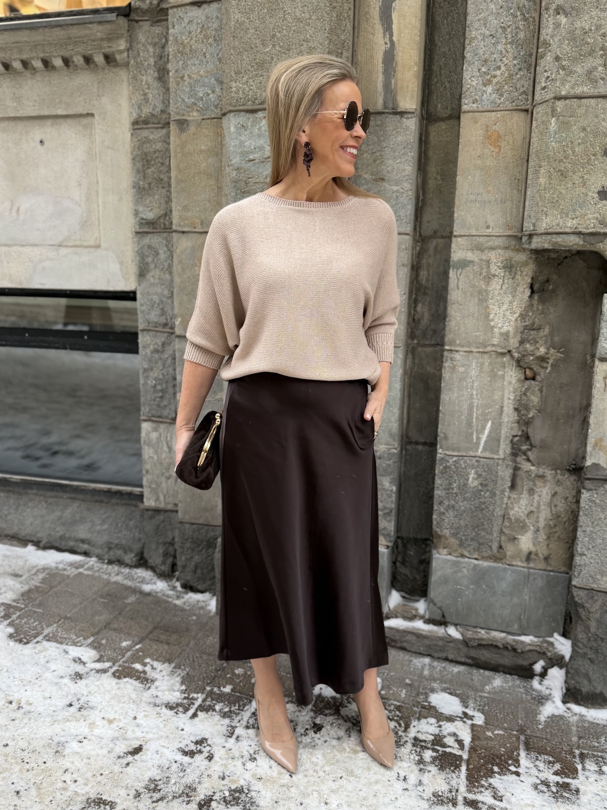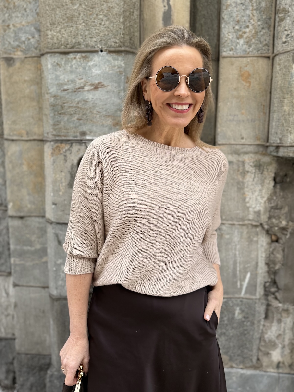 Dolman on kaunis lepakkohihainen neule, joka toimii arkeen mutta myös pieneen menoon kauniin aavistuksen kiiltäpintaisen lookkinsa ansiosta. Neuleessa on O-kaula-aukko ja niskassa on halkio ja nappi. Hihat ovat vaajaamittaiset resorilla, ne ylettyvät kyynerpäiden alapuolelle. Neule kapenee alaspäin ja loppuu lantiolle. Katalla on neuleesta päällä koko 34.
