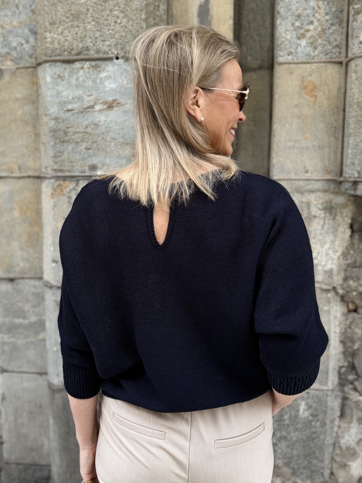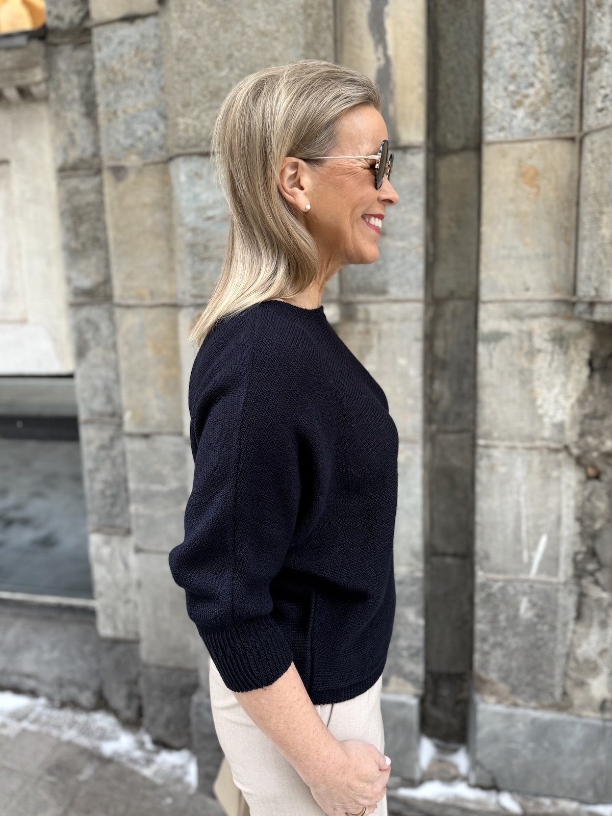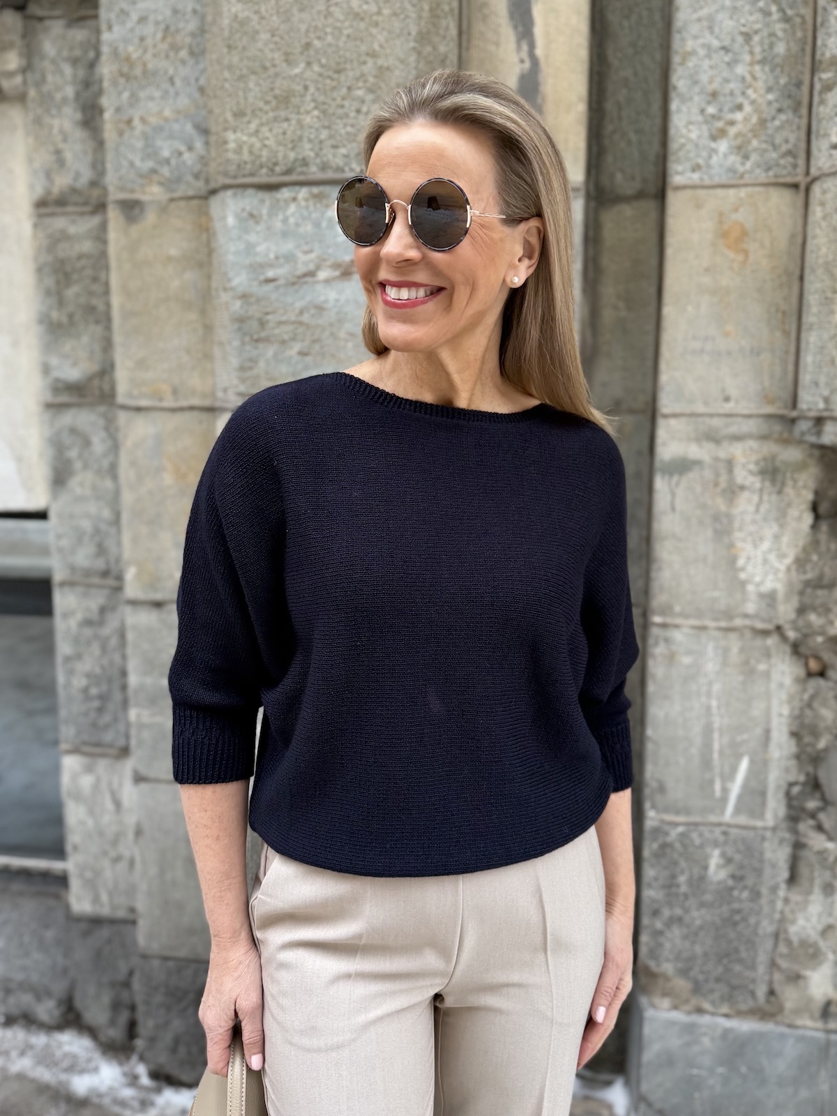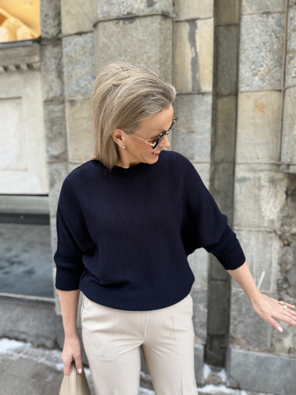Dolman on kaunislepakkohihainen neule, joka toimii arkeen mutta myäs pieneen menoon kauniin aavistuksen kiiltäpinatsien lookkinsa ansiosta. Neuleessa on O-kaula-aukko ja niskassa on halkio ja nappi. Hihat ovat vaajaamittaiset resorilla, ne ylettyvät kyynerpäiden alapuolelle. Neule kapenee alaspäin ja loppuu lantiolle. Katalla on beigestä neuleesta päällä koko 36 ja muista väreistä koko 34.