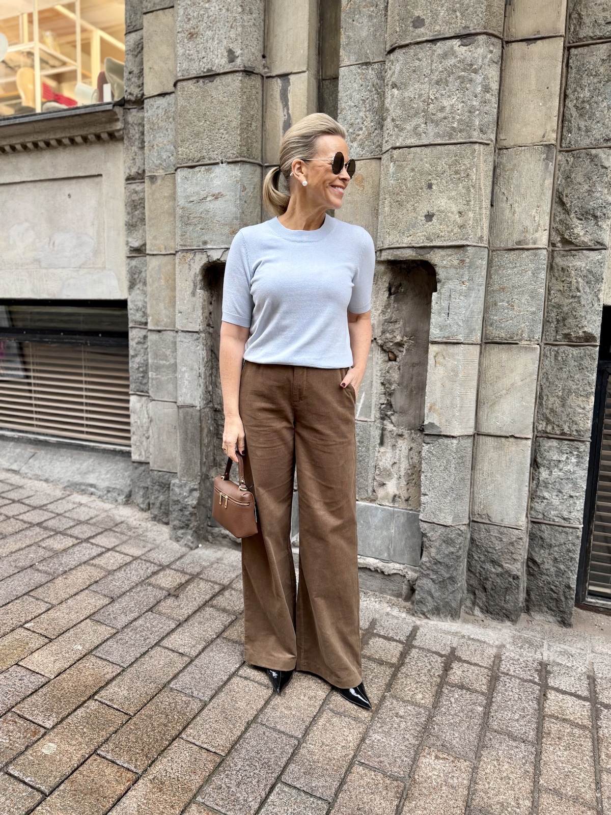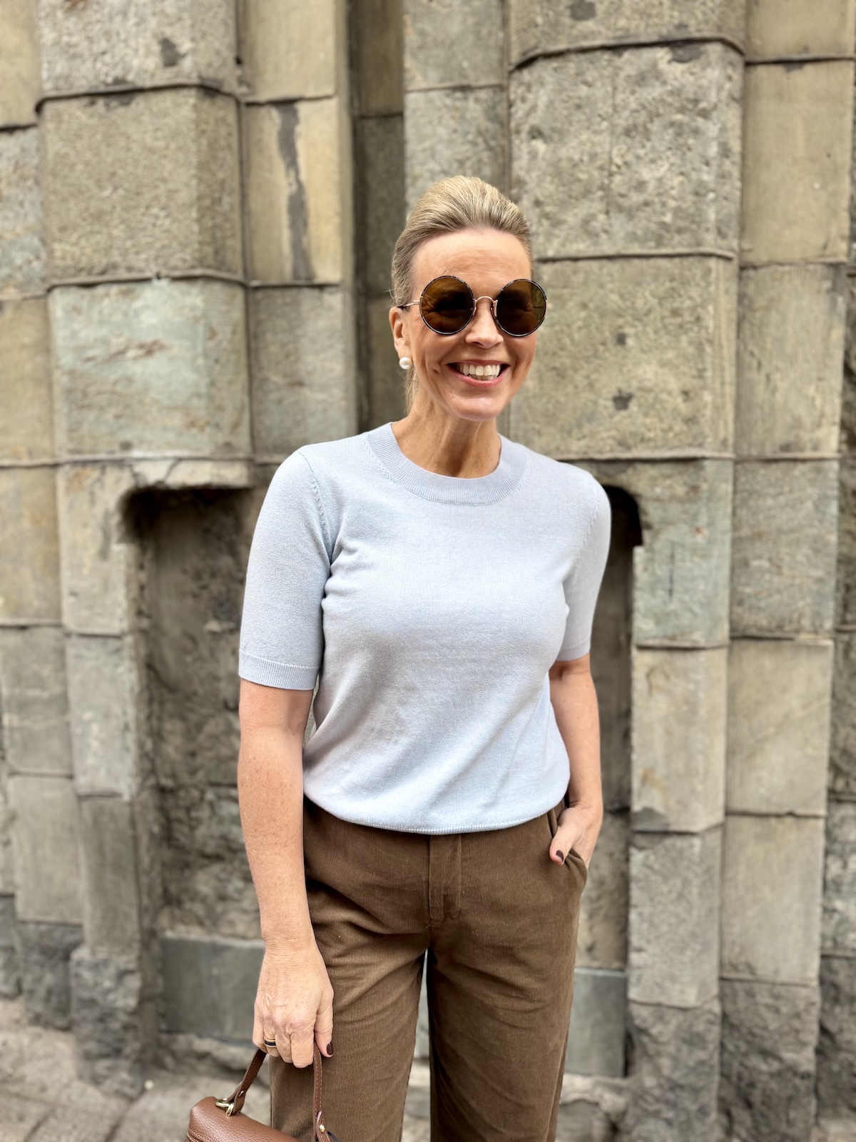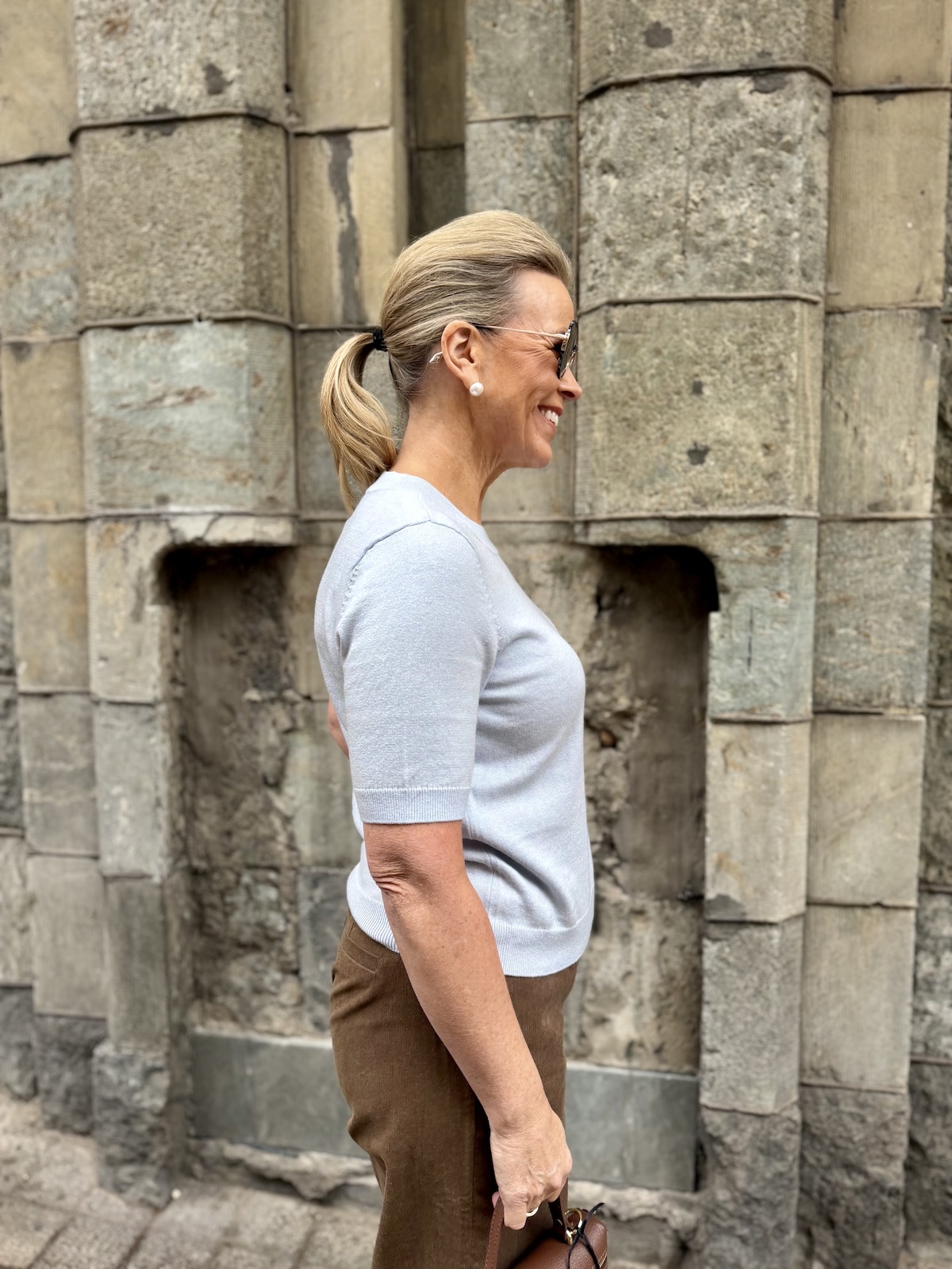 Lyhythihainen neule on klassinen ja aina toimiva. Neule on ihanan pehmoinen. Neuleessa on O-kaula-aukko, lyhkäiset hihat ja helmassa on resori. Neule ylettyy lantiolle. Kata käyttää neuleesta kokoa S.