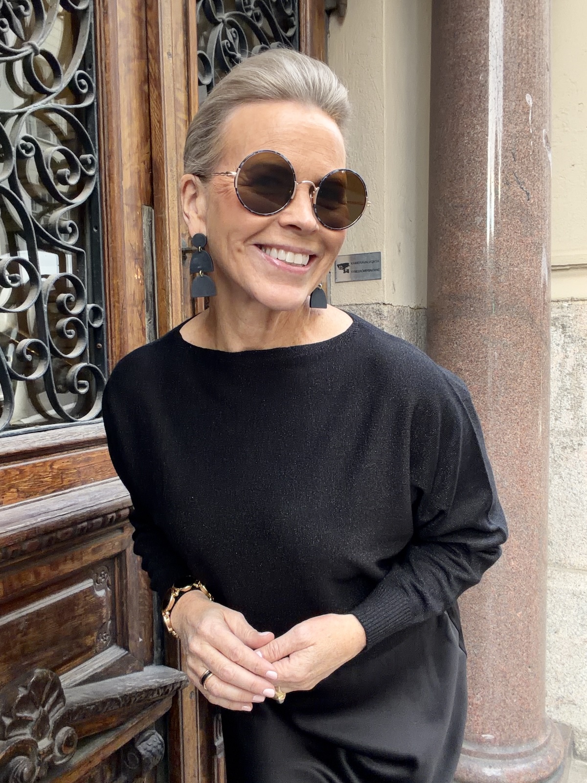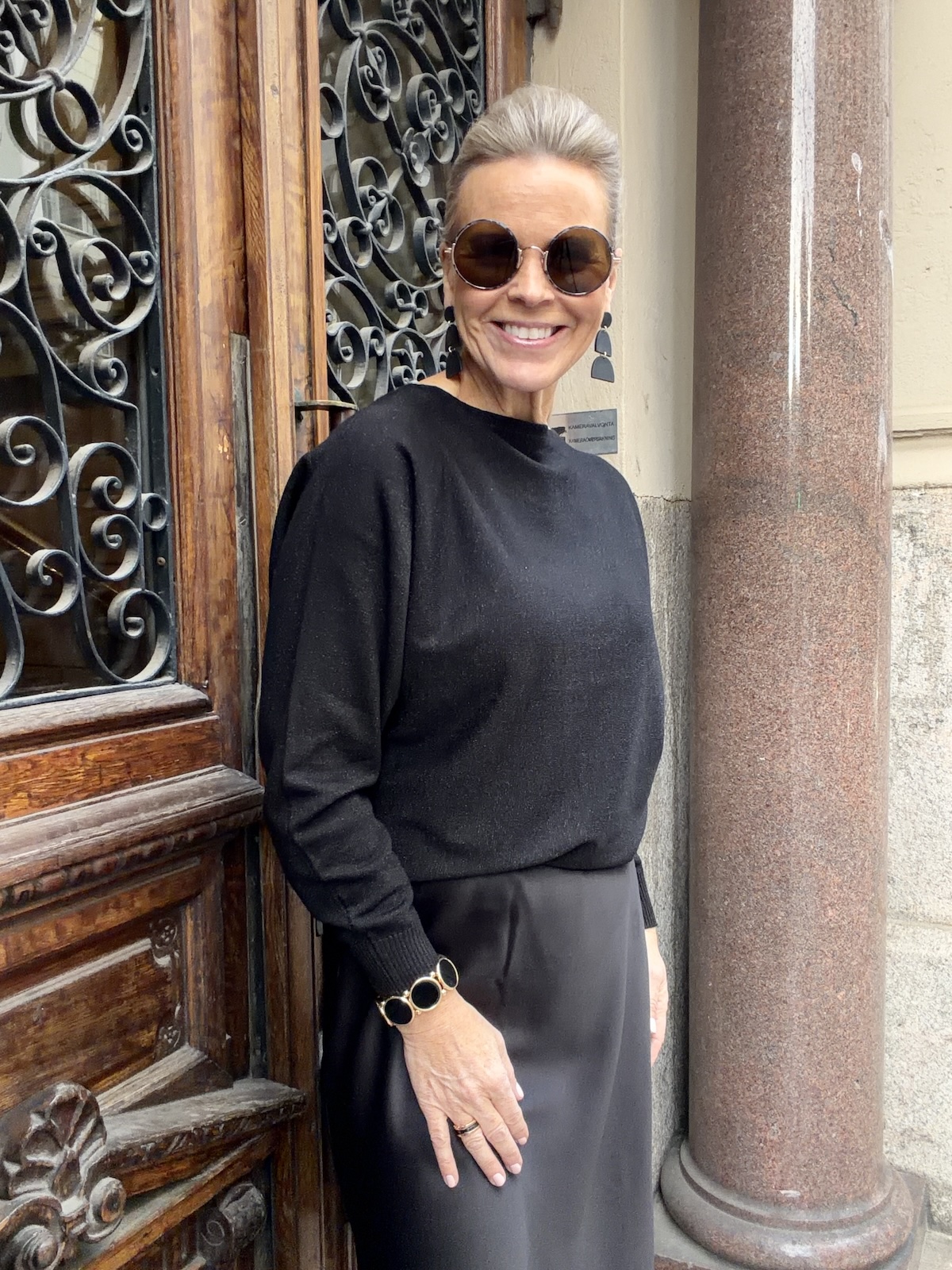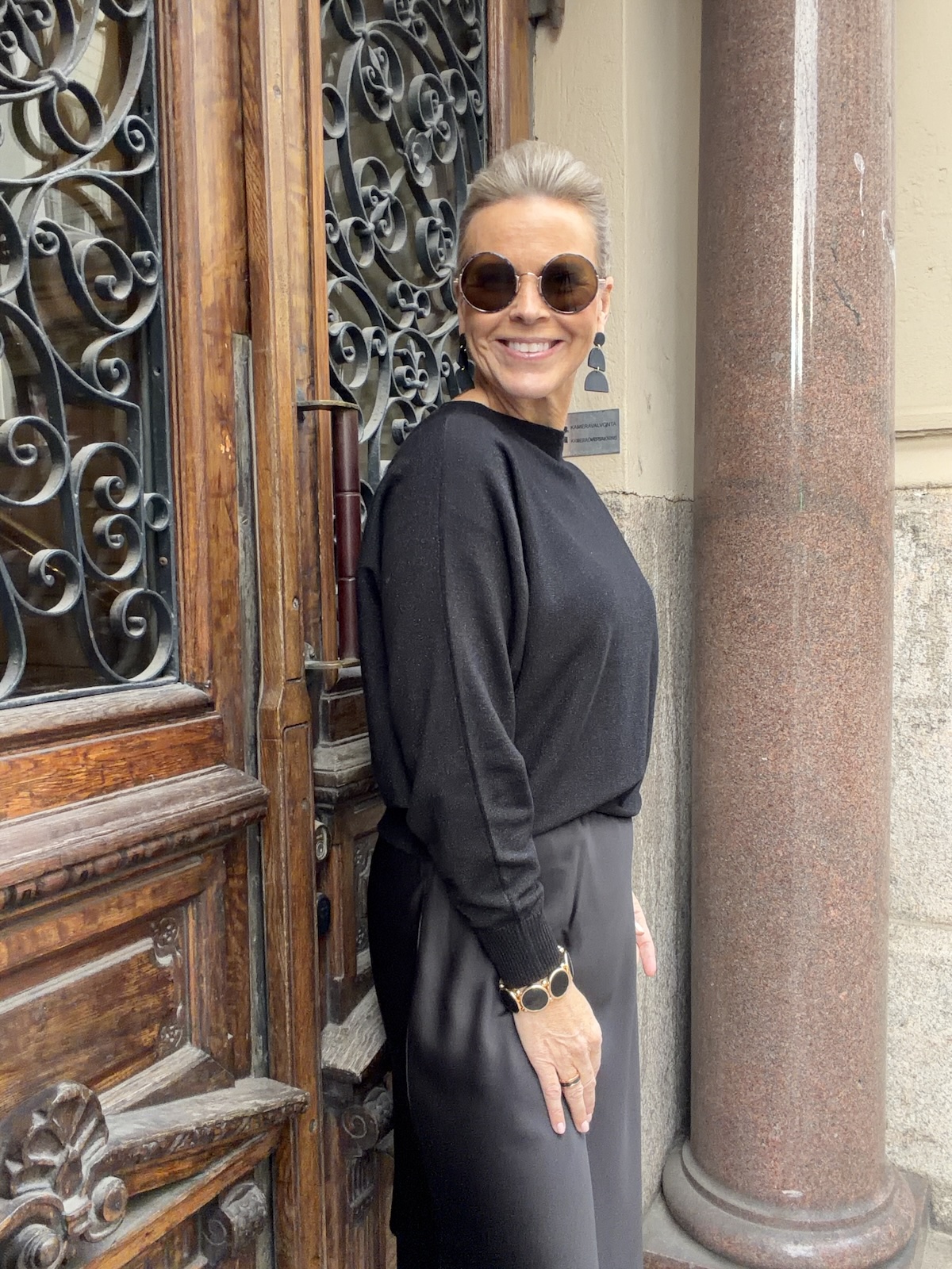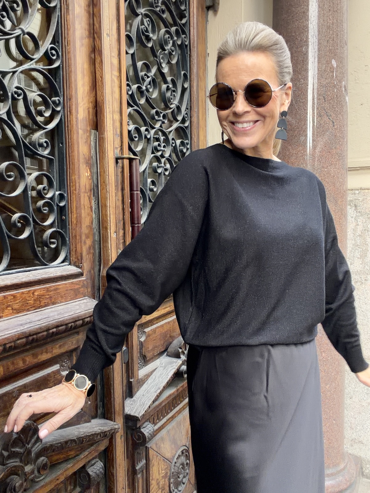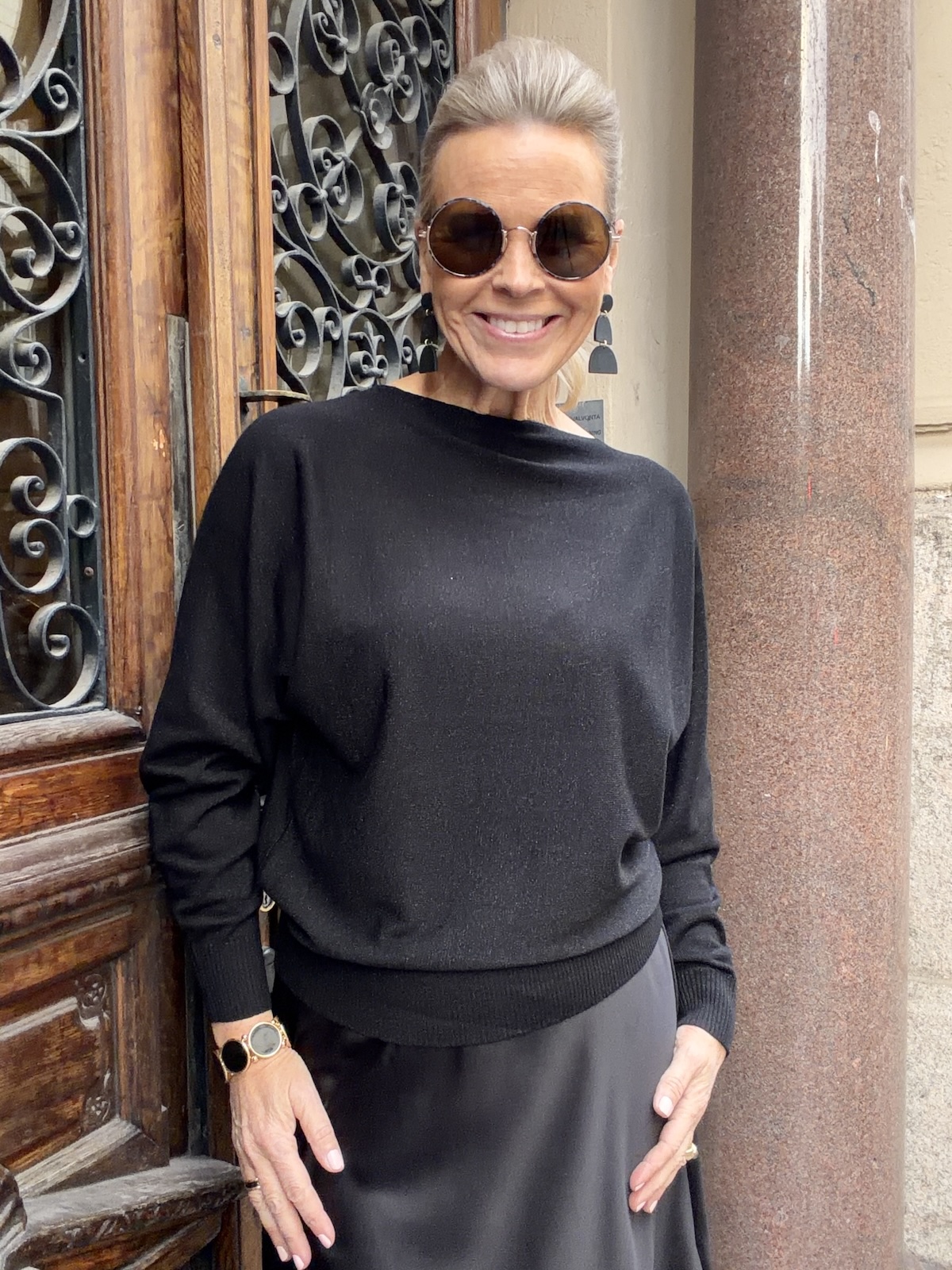 Fay on pehmoinen ja kevyt neule arkeen, mutta se toimii myös pieneen menoon. Neuleessa on metallilankaa eli siitä neule saa pientä säihkettä. Neuleessa on venekaula-aukko. Kaula-aukko nousee edestä solisluiden päälle. Hihat ovat kainaloista leveähköt eli lepakkomalliset. Hihansuissa ja neuleen helmassa on resorit. Neule on malliltaan hieman pidempi ja suorana se ylettyy lähelle haarasaumaa. Neuleen voi vetäistä pussille, lantion tai vyötärön kohdalle. Katalla on neuleesta päällä koko XS. Neule on reilua kokoa.