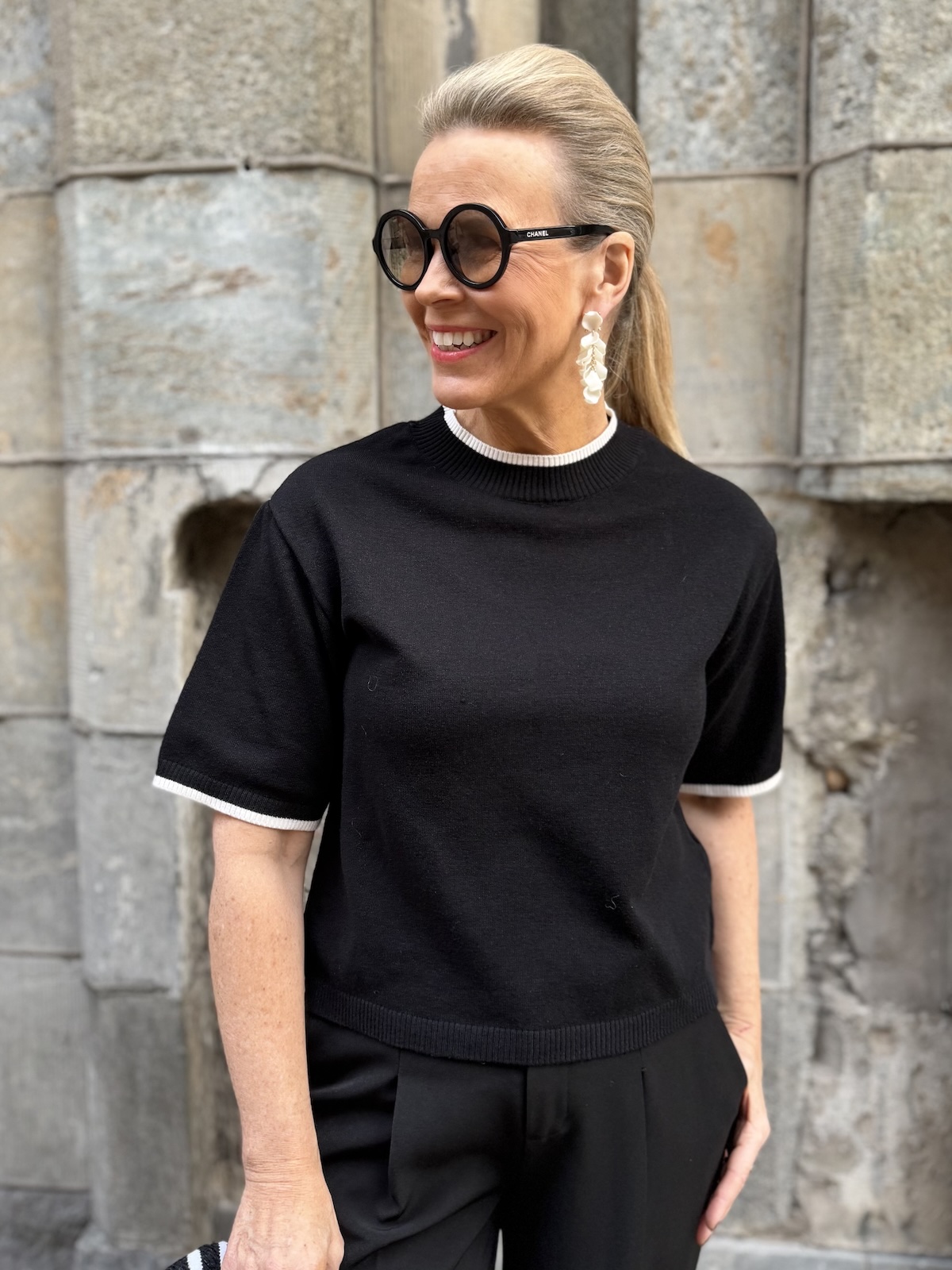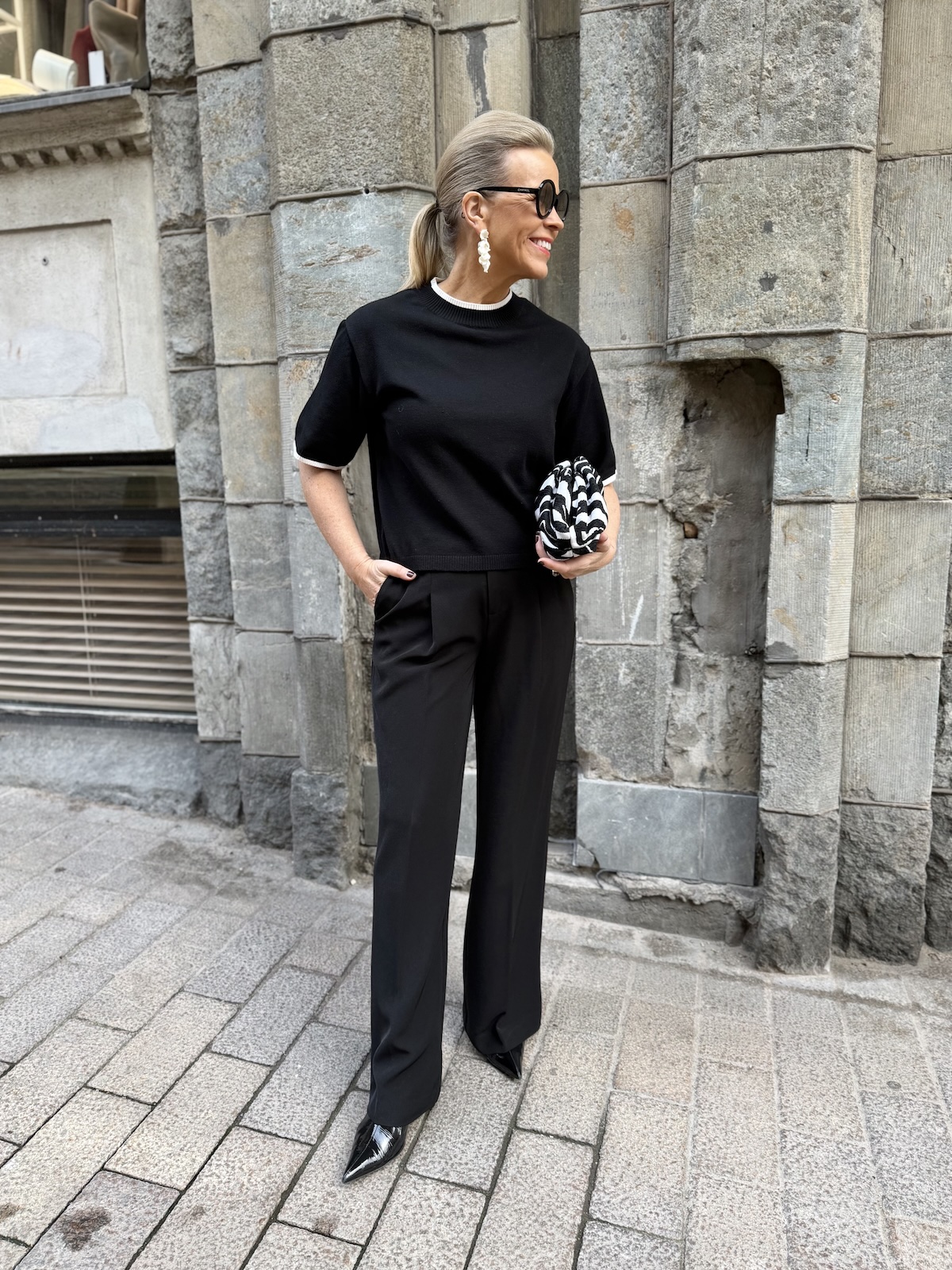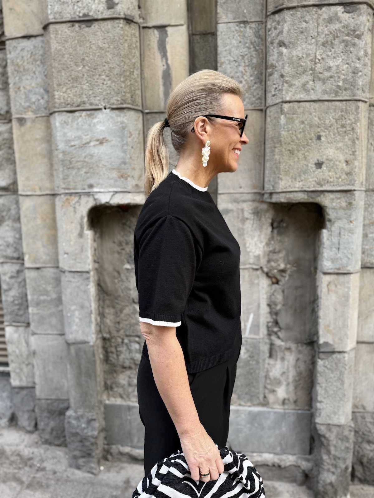 Julie neule on tyylikäs neule, jonka yksityiskohtana on valkoiset kantit kaula-aukossa sekä hihansuissa. Neule on malliltaan suora ja se loppuu lonkkaluiden kohdalle. Neule on aavistuksen tukevampaa materiaalia. Katalla on neuleesta päällä koko 34. Neule on koon reilumpaa kokoa kun normaalisti.