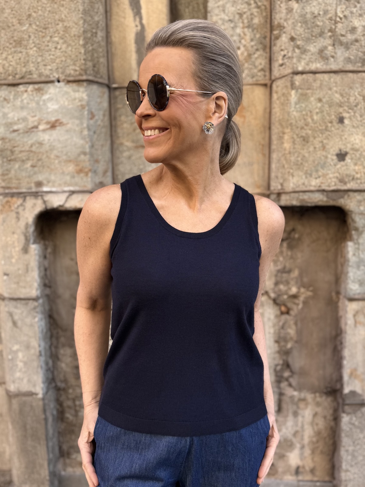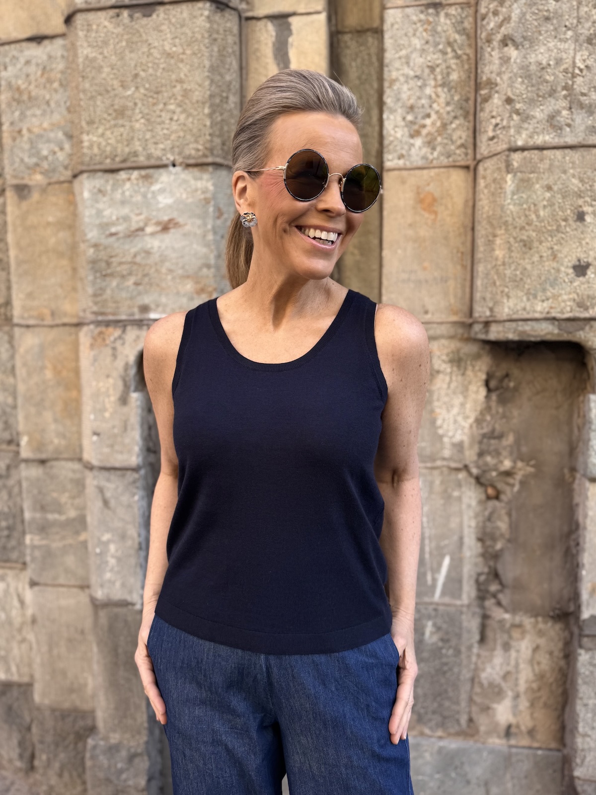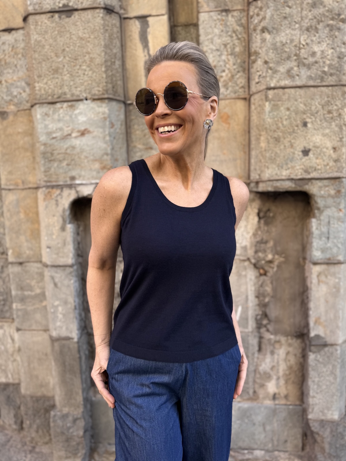 Linnea on ihanantuntuinen neuletoppi. Topissa on O-kaula-aukko ja topin olkainten alle jää hyvin rintaliivien nauhat. Malliltaan toppi on suora ja se loppuu lonkkaluiden kohdalle. Katalla on topista päällä koko S. Mitat ovat ilman venytystä.
