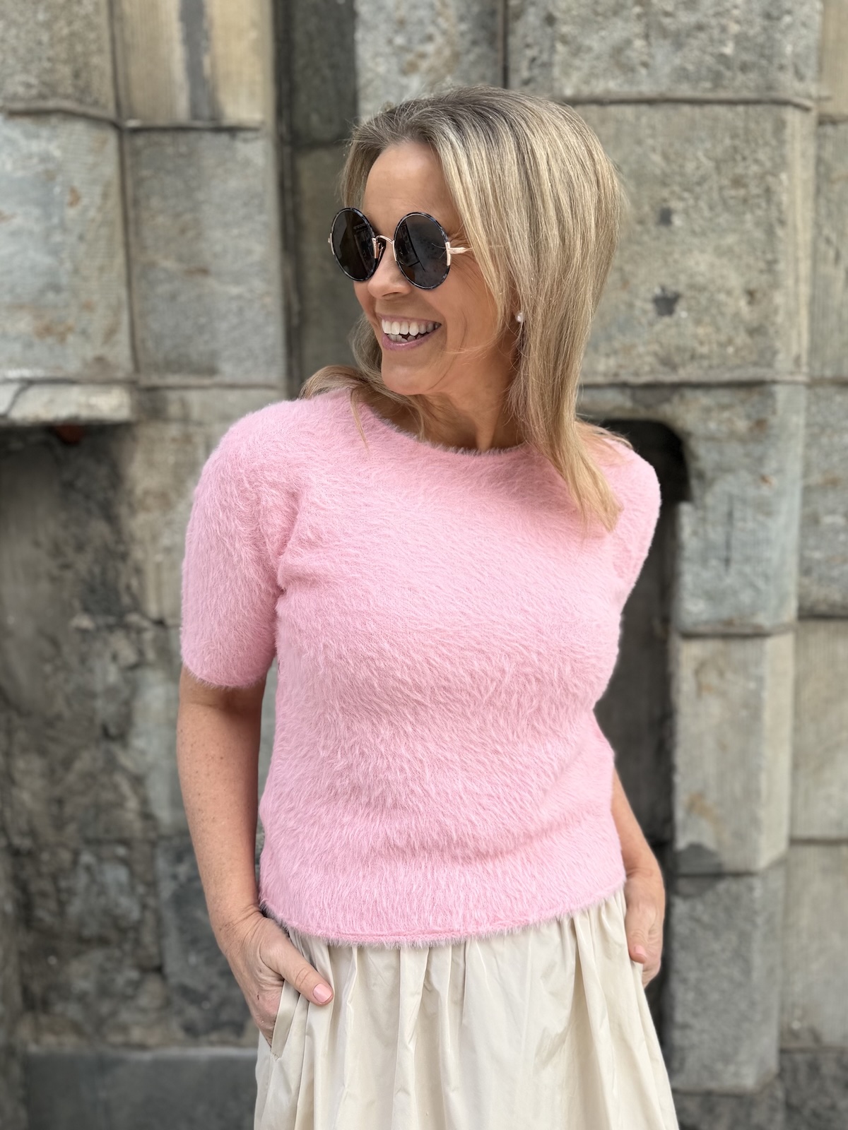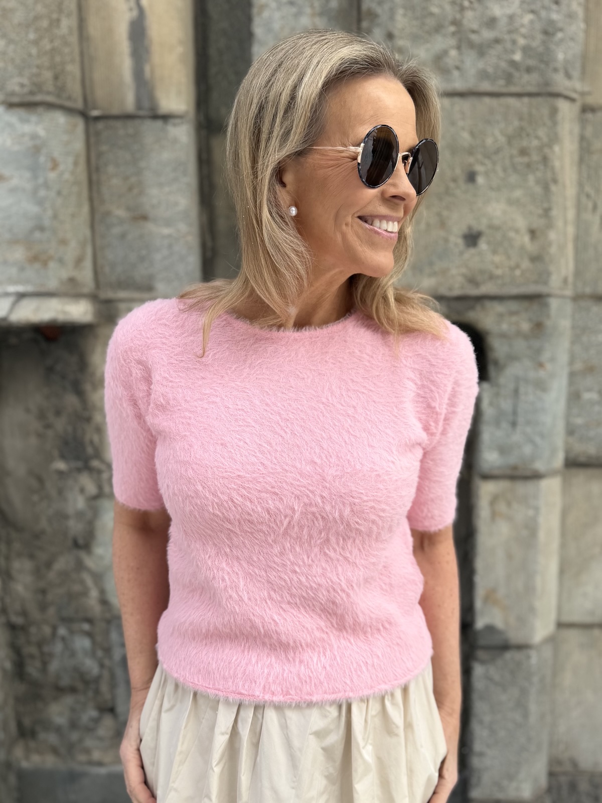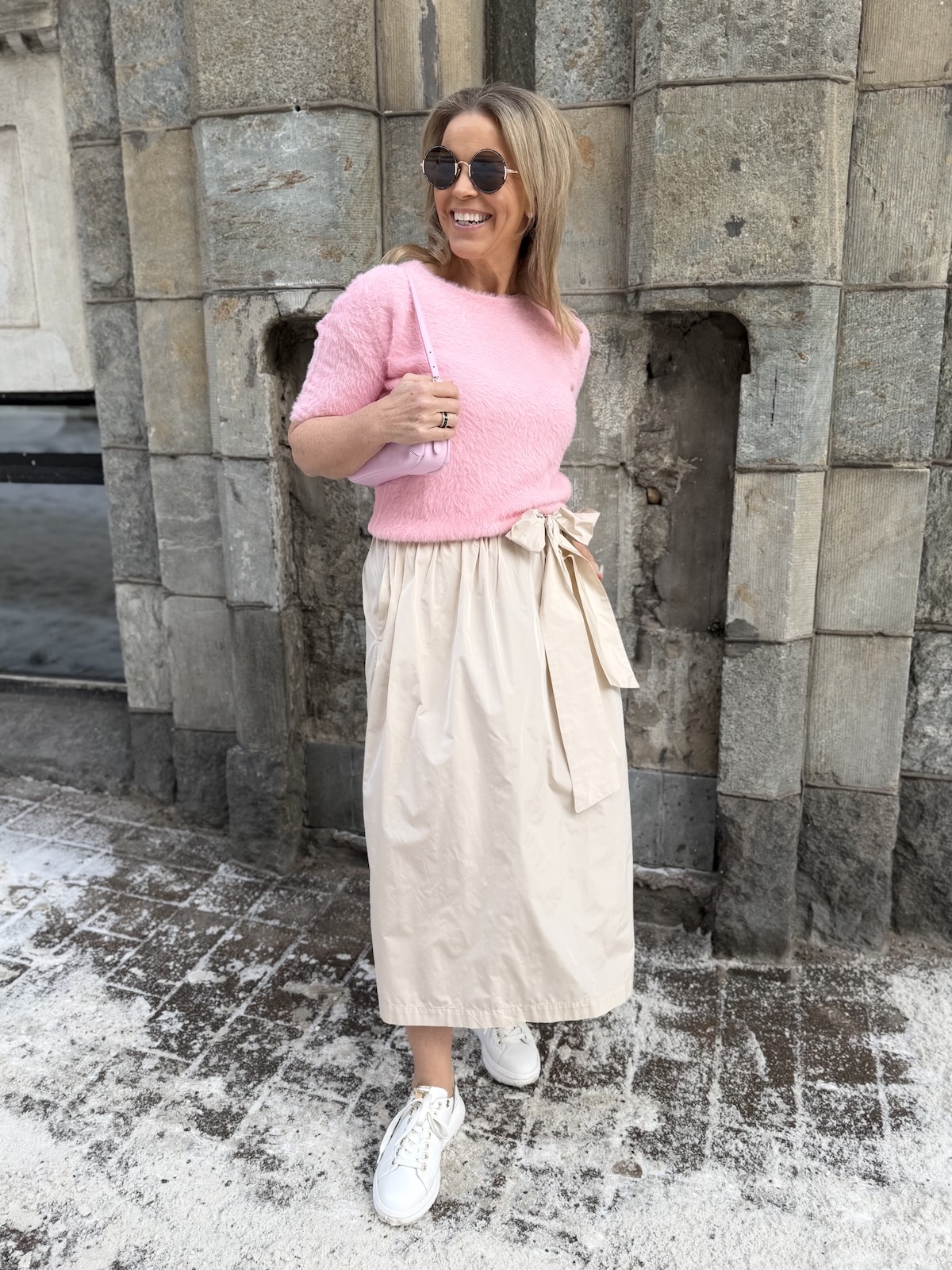 Mala on valloittava paita. Paita on super pehmoinen ja joustava päällä. Paidassa on pörrölankainen pinta. Kaulus on O-mallinen ja hihat ylettyvät kyynerpäiden yläpuolelle. Malliltaan paita on suora ja se ylettyy lantiolle. Katalla on paidasta päällä koko S. Vaikka paita joustaa, emme suosittele ottamaan siitä yhtään pienempää kokoa kuin normaalisti käyttää.